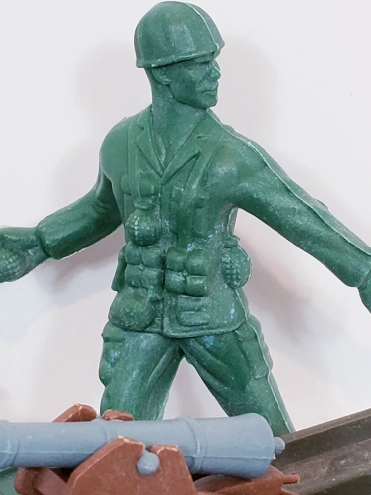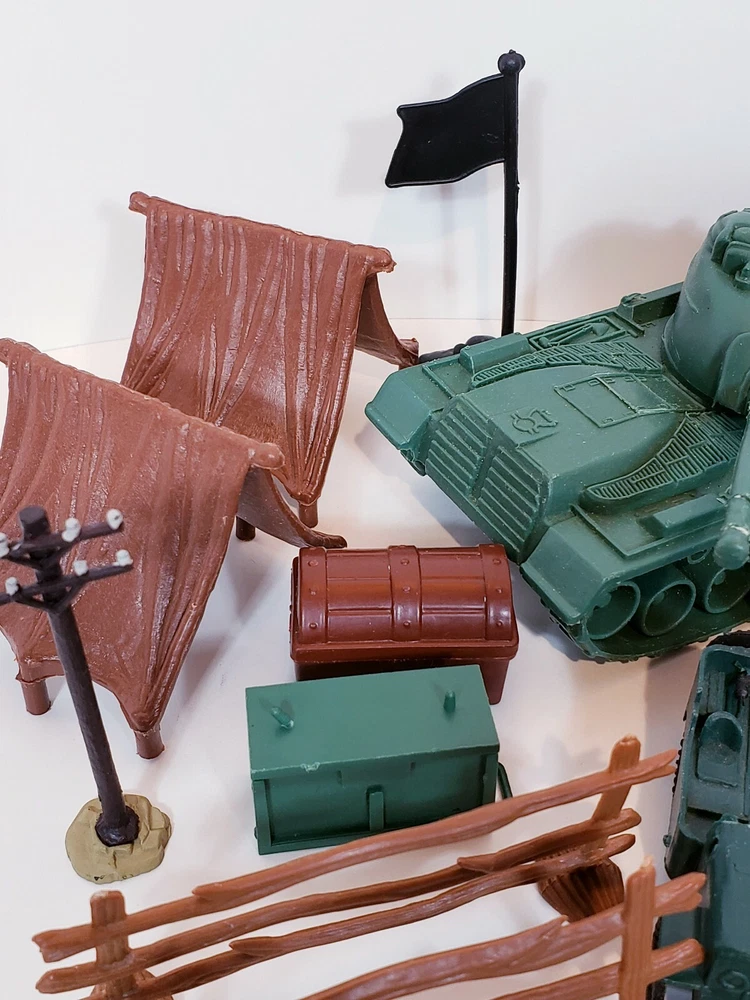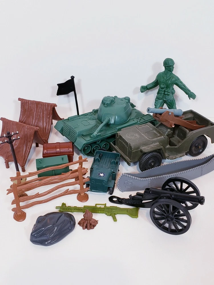 Tim - Mee Jeep Vintage Cannons Tank Tents Canoe Ammo Box Army assortment . Assorted plastic add on Pieces lot of 18 the jeeps steering wheel is missing some parts to the cannons are missing. Soldier is 4" in hight . It's a cool add on lot.