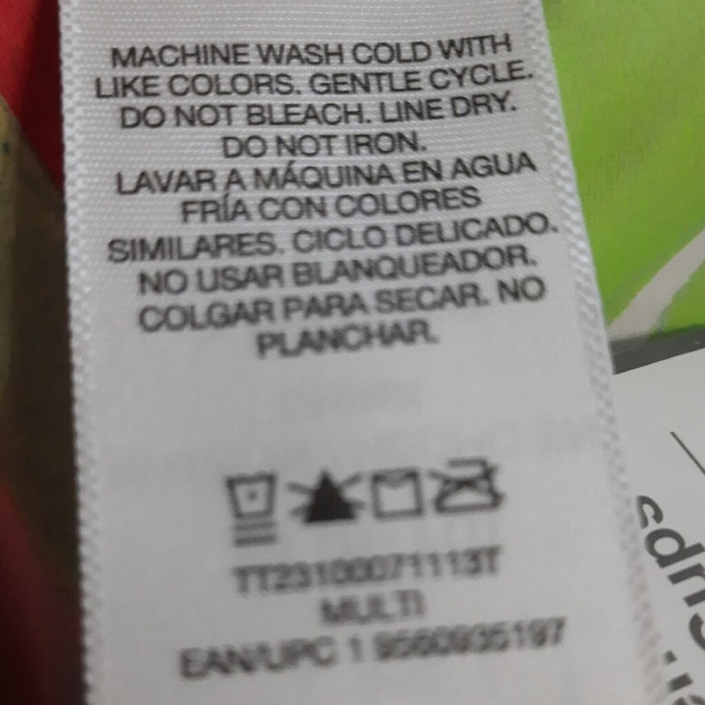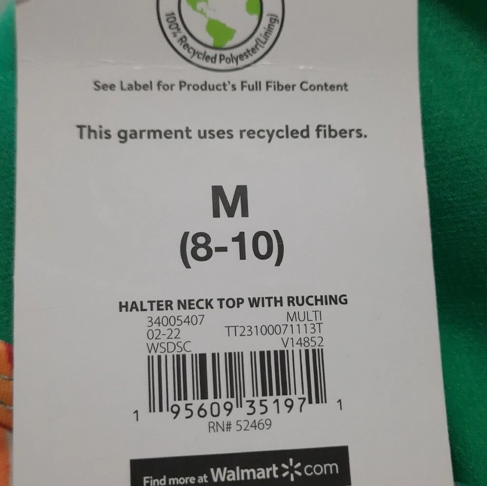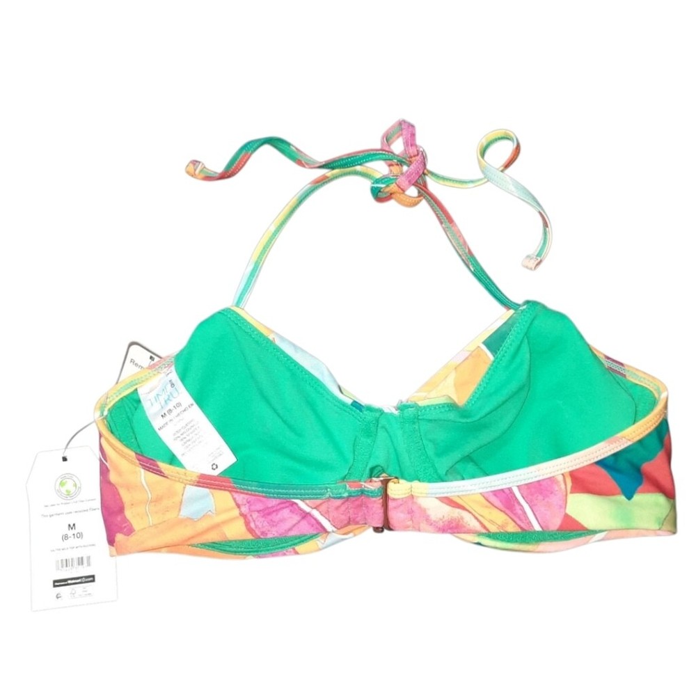 Time and Tru Multicolored Bikini Top Size Medium (8-10). NWT. The body is 82% Nylon and 18% Spandex. The lining is 100% Recycled Polyester. Machine washable and line dry. Multicolored. The bikini top ties behind the neck. Hooks behind back. Underwire. Padded with removeable pads. Soft. Stretchy. Smooth feeling. With the garment laying flat, the measurements are as follows: armpit to armpit is 13 inches, the underbust is 14 inches, and from back of the neck to bottom of the bikini bottom is 10 inches.