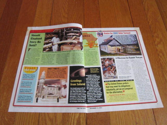 PLEASE NOTE: This is a used item. Please fully read item description for complete details of condition. Thank you! Vintage elementary school world news from early 2000’s. TIME FOR KIDS World Report Edition November 15, 2002 Election 2002 - Who won and what it means for the United States. Eight page paper that is like a kid’s newspaper or news magazine. Current events presented in an easy to understand format with color pictures. Age appropriate articles are about 1-3 short paragraphs, with a few featured articles that are longer. I think this issue was aimed towards 3rd or 4th graders. This was similar to the Weekly Reader of the 1960’s or so. Measures approximately 8 x 10.5 inches. This issue includes: Elephant ivory. Marian Runyan - Bones for Ice Age, Kenya Jordana James - 12 year old starting magazine for black teens And more. Shows light use/wear. Stained corners. Remains overall clean and in good shape. MORE ISSUES LISTED. US shipping will be FREE first class and includes delivery confirmation. Please message me with any questions. Lots more great items listed!! Thanks for looking!