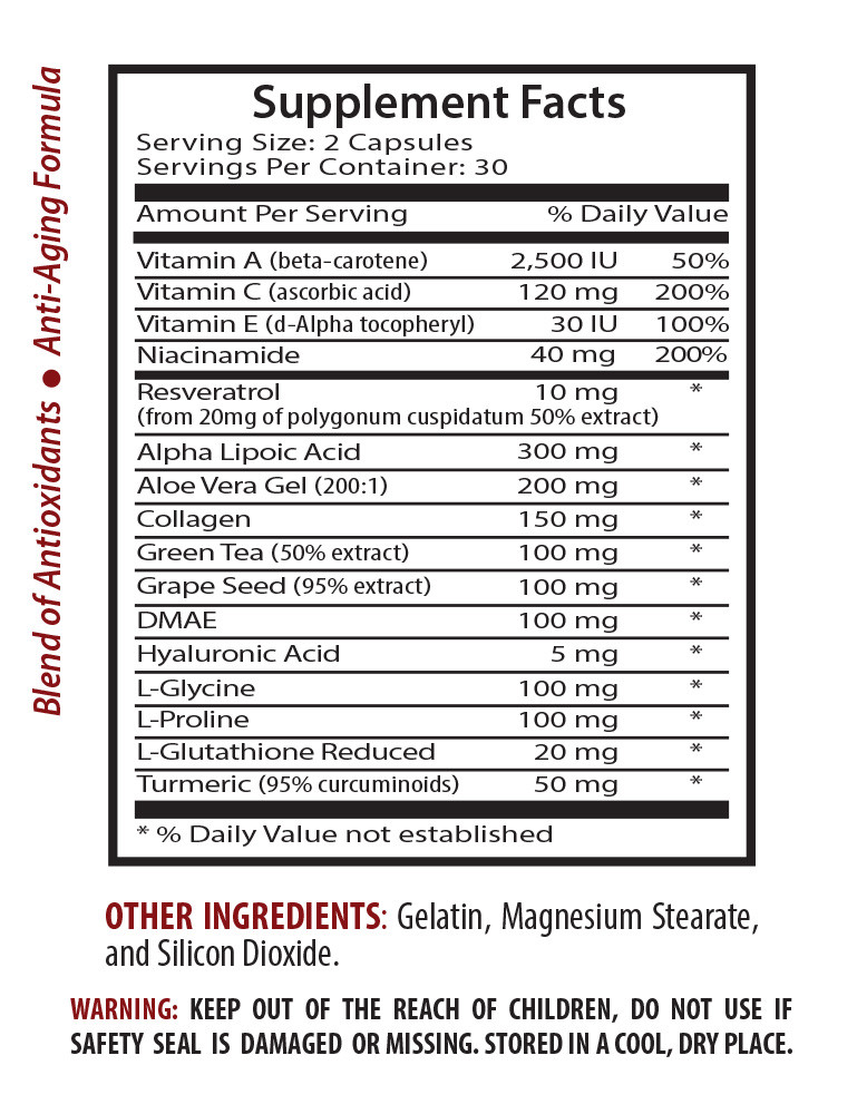 Timeless Revitalization - ANTI-WRINKLE COMPLEX - Youthful Renewal - 1 Bottle 60 Caps ANTI-WRINKLE COMPLEX Slow aging of the skin Contains Antioxidant Promote skin tissue Increase your metabolism Made in USA 1 Bottle 60 Capsules Introducing our Anti-Wrinkle Complex – a meticulously crafted skincare solution designed to infuse vitality into your skin. Imbued with a harmonious blend of premium ingredients, this complex addresses a spectrum of skincare concerns, promising a complexion that radiates youthfulness. Key Ingredients: Vitamin A: Celebrated for promoting cellular turnover, Vitamin A actively diminishes the appearance of fine lines and wrinkles, contributing to a smoother skin texture. Vitamin C: A powerhouse antioxidant, Vitamin C illuminates the skin, safeguards against environmental damage, and stimulates collagen production, enhancing elasticity. Vitamin E: Providing nourishment and hydration, Vitamin E supports skin health by moisturizing and shielding against free radicals, thwarting premature aging. Alpha Lipoic Acid: A potent antioxidant, Alpha Lipoic Acid minimizes fine lines, wrinkles, and enlarged pores, promoting a refined skin texture. Niacin: Also known as Vitamin B3, Niacin refines skin texture, reduces redness, and fortifies the skin's barrier function. Aloe Vera: Revered for its soothing properties, Aloe Vera calms and hydrates the skin, fostering a healthy and radiant complexion. Resveratrol: Derived from red grapes, Resveratrol possesses antioxidant prowess, calming the skin and combating signs of aging. Collagen: Essential for skin elasticity, Collagen fosters firmness and diminishes the appearance of sagging skin. Green Tea Leaf: Abundant in antioxidants, Green Tea Leaf extract shields the skin from free radical damage, supporting a luminous and even skin tone. Grape Seed: Packed with polyphenols, Grape Seed extract fortifies the skin against environmental stressors, reducing signs of aging. Green Coffee Bean: Containing chlorogenic acid, Green Coffee Bean is celebrated for maintaining skin elasticity and firmness. Glycine: An amino acid supporting collagen production, Glycine contributes to skin firmness and elasticity. L-Glutathione: A powerful antioxidant, L-Glutathione brightens the skin and shields against oxidative damage. Hyaluronic Acid: A hydration marvel, Hyaluronic Acid locks in moisture, plumping the skin and reducing the appearance of fine lines. Turmeric: Recognized for its skin-soothing properties, Turmeric helps reduce redness, promoting a more even complexion. Lycopene: Found in tomatoes, Lycopene safeguards the skin from UV damage, supporting a youthful appearance. Benefits of Our Anti-Wrinkle Complex: Reduction of fine lines and wrinkles Enhanced collagen production for increased elasticity Defense against environmental damage Deep nourishment and hydration Promotion of a radiant and even skin tone Embark on a transformative skincare journey with our Anti-Wrinkle Complex, bid farewell to signs of aging, and reveal a more youthful, radiant version of yourself.