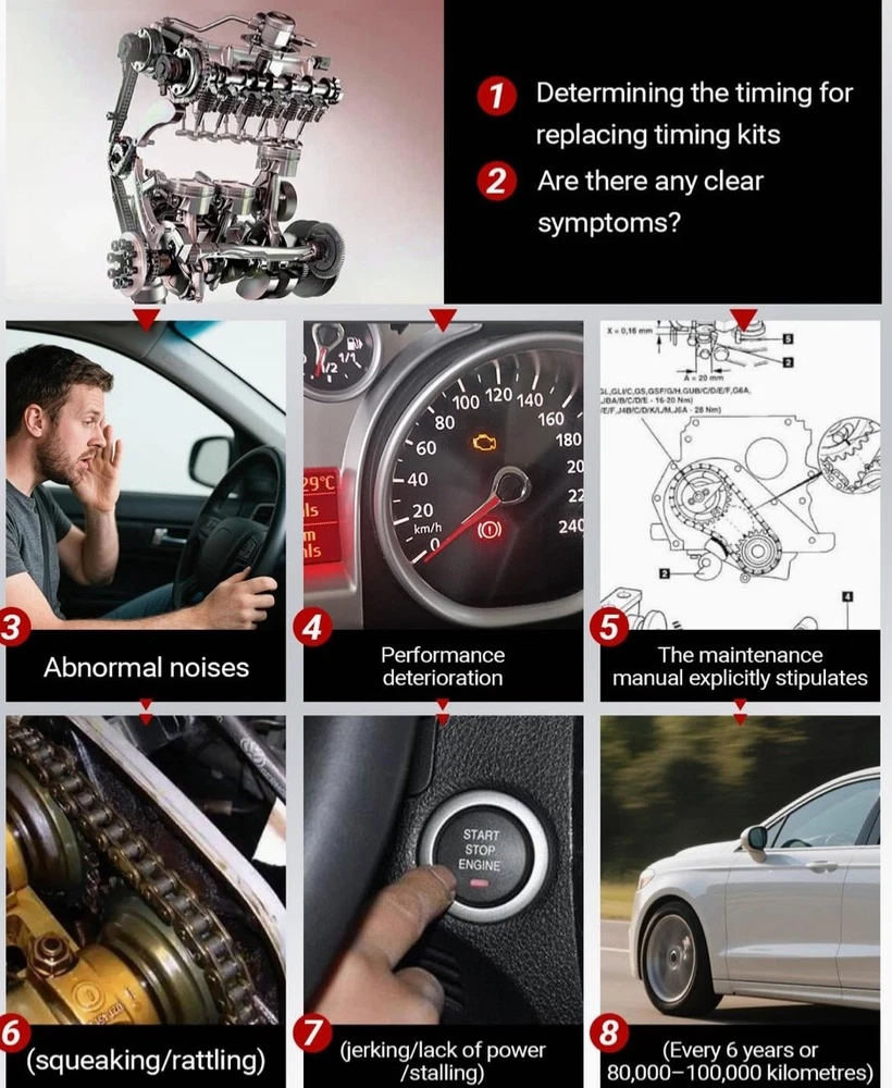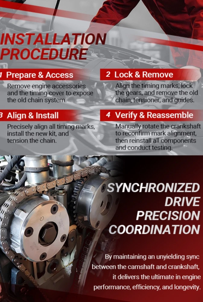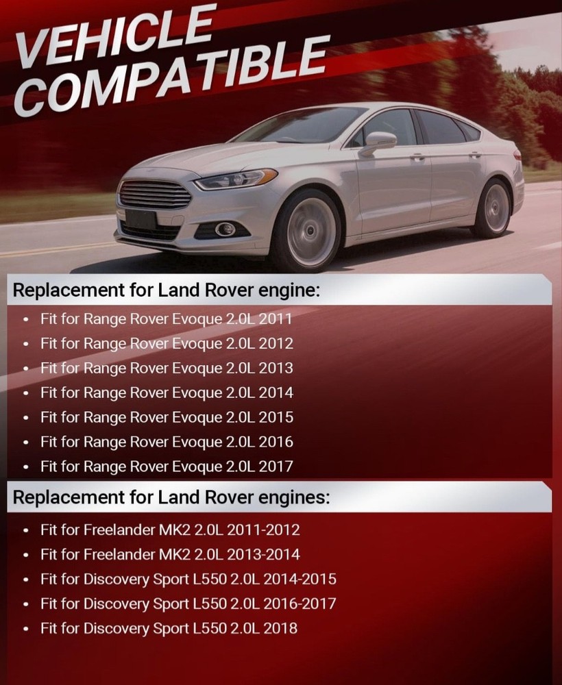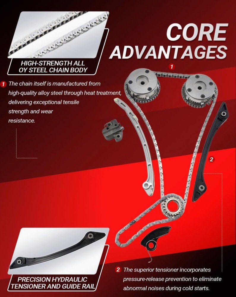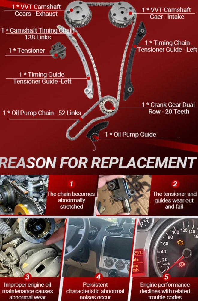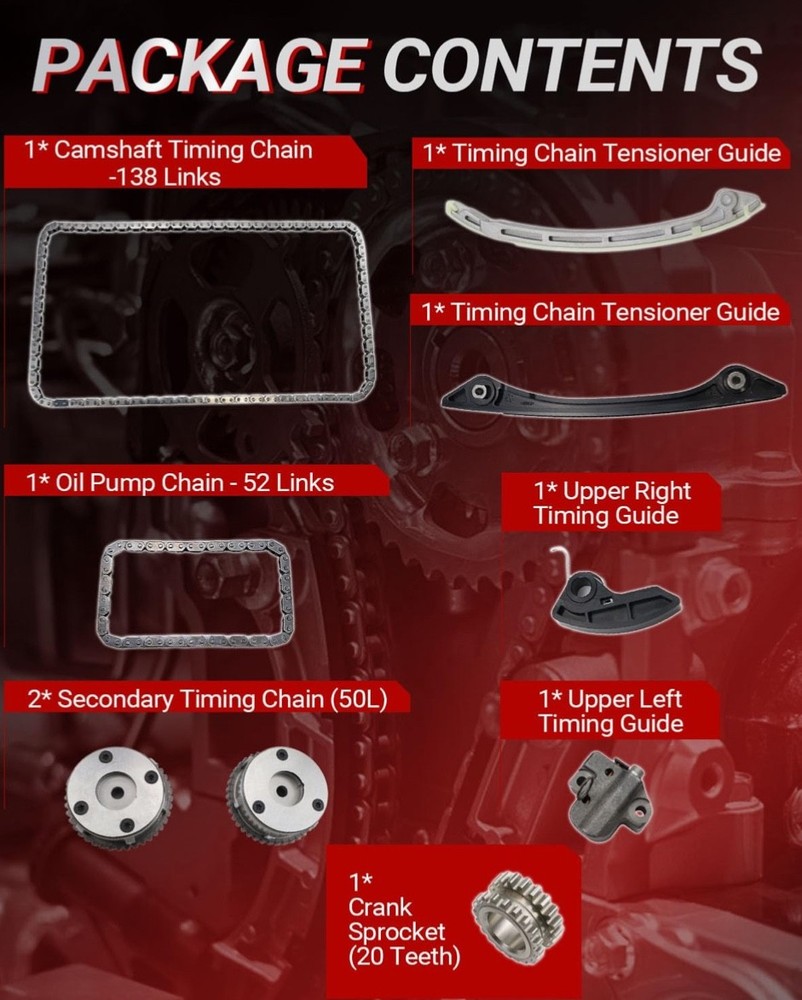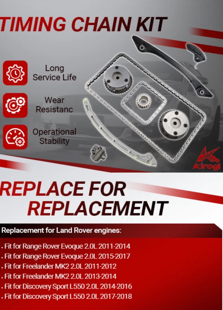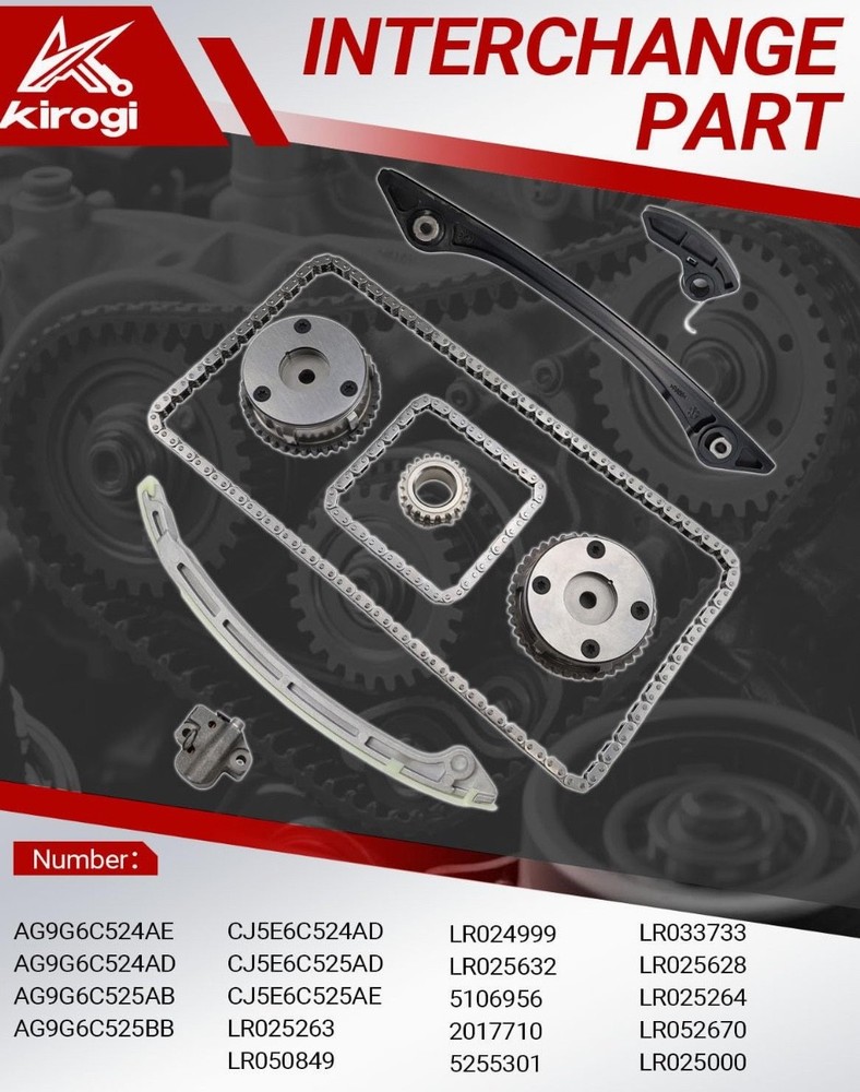 #3029 Timing Chain Kit with 2 VVT & Oil Pump Chain (9pcs) Compatible with Land Rover Range Rover Evoque 2.0L 2011-2018 Direct Timing Chain Set Replacement OE Number CJ5E6C525AD CJ5E6C524AD ► Vehicle Compatible Models: Compatible with 2011-2017 Range Rover Evoque 2.0L, for 2011-2014 Freelander MK2 2.0L, for 2014-2018 Discovery Sport L550 2.0L Direct Replacement. Please Check that the compatible vehicle model matches your car. Our Direct replacement of used parts, no modification required, ready to use. ►Interchange Part Number: LR025263 | CJ5E6C524AD | LR050849 | LR024999 | 5106956 | 2017710 | 5255301 | AG9G6C524AE | AG9G6C524AD | CJ5E6C525AD | LR033733 | LR025628 | CJ5E6C525AE | AG9G6C525AB | AG9G6C525BB | LR025264 | LR052670 | LR025000 | LR025632 Timing Chain Kit. Pleae make sure the Part number is the same with your own part, any question about it, our engineers is ready to assist. ► Package Content: Totel 9 pcs. 1x Chain; 1x I-n-t-a-k-e VVT Gear; 1x E-x-h-a-u-s-t VVT Gear; 1x Crank Gear; 1x Tensioner; 1x Arm Guide Left; 1x Guide Right; 1x Oil Pump Chain; 1x Oil Pump Guide. Replacing a Timing Chain Kit is a complex procedure that requires specialised tools and advanced mechanical knowledge. Professional installation and proper replacement of worn parts is highly recommended for optimum performance and longevity. ► Expert Assistance: For product inquiries, please provide your vehicle model, year, and photos of the old part. For product issues, kindly describe the malfunction in detail along with any error codes, and our engineers will provide a tailored solution. ► High Performance: Kirogi's Precision Engine Timing Chain Kit is meticulously engineered with high-strength alloy chains, reinforced guides & tensioners, and OE-matched sprockets to deliver critical precision timing, exceptional durability, and quiet operation, ensuring your engine runs smoothly and reliably for miles to come. What's in the box Timing Chian Kit