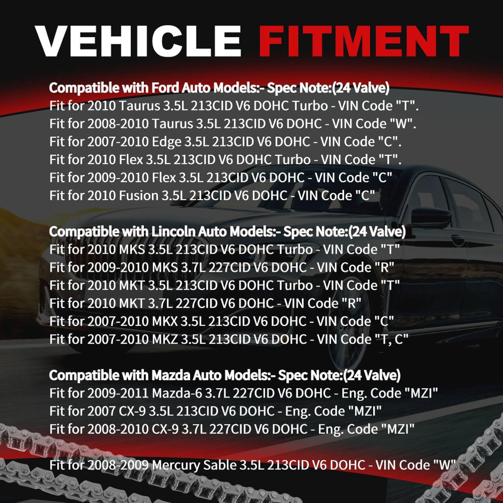 WHY OUR CUSTOMERS KEEP SHOPNG WITH US ✅All items are covered by manufacturer warranty. ✅FAST FREE SHIPPING. ✅Most orders ship within 1 business day with Tracking Number. Customer also can choose two-day or expedited shipping. ✅100% customer satisfaction is backed by a 30-Day Money Back Guarantee for New items and a 30-Day Money Back Guarantee for Recon. FEATURES 1 Manufactured with Precision to Meet OE Standards IATF16949 Certified. 2 High Quality & Brand New 3 Two Year Warranty. 4 After Market Replacement 5 Customers Service Center Will Deal with Pre-sale and After-sale Problems In Time Timing Chain Oil & Water Pump Kit Head Gaskets Bolts for Ford Lincoln Mazda 3.5L WHY OUR CUSTOMERS KEEP SHOPNG WITH US ✅All items are covered by manufacturer warranty. ✅FAST FREE SHIPPING. ✅Most orders ship within 1 business day with Tracking Number. Customer also can choose two-day or expedited shipping. ✅100% customer satisfaction is backed by a 30-Day Money Back Guarantee for New items and a 30-Day Money Back Guarantee for Recon. FEATURES 1 Manufactured with Precision to Meet OE Standards IATF16949 Certified. 2 High Quality & Brand New 3 Two Year Warranty. 4 After Market Replacement 5 Customers Service Center Will Deal with Pre-sale and After-sale Problems In Time 6 Factory Affordable Price with High Quality Service: Return/ Replace/ Offer Technical Support. FITMENTS For FORD: 2010-2010 for Ford Taurus 3.5L 213CID V6 DOHC Turbo - VIN Code "T" 2008-2010 for Ford Taurus 3.5L 213CID V6 DOHC - VIN Code "W" 2007-2010 for Ford Edge 3.5L 213CID V6 DOHC - VIN Code "C" 2010-2010 for Ford Flex 3.5L 213CID V6 DOHC Turbo - VIN Code "T" 2009-2010 for Ford Flex 3.5L 213CID V6 DOHC - VIN Code "C" 2010-2010 for Ford Fusion 3.5L 213CID V6 DOHC - VIN Code "C" For LINCOLN: 2010-2010 for Lincoln MKS 3.5L 213CID V6 DOHC Turbo - VIN Code "T" 2009-2010 for Lincoln MKS 3.7L 227CID V6 DOHC - VIN Code "R" 2010-2010 for Lincoln MKT 3.5L 213CID V6 DOHC Turbo - VIN Code "T" 2010-2010 for Lincoln MKT 3.7L 227CID V6 DOHC - VIN Code "R" 2007-2010 for Lincoln MKX 3.5L 213CID V6 DOHC - VIN Code "C" 2007-2010 for Lincoln MKZ 3.5L 213CID V6 DOHC - VIN Code "T, C" For MAZDA: 2009-2011 for Mazda-6 3.7L 227CID V6 DOHC - Eng. Code "MZI" 2007-2007 for Mazda CX-9 3.5L 213CID V6 DOHC - Eng. Code "MZI" 2008-2010 for Mazda CX-9 3.7L 227CID V6 DOHC - Eng. Code "MZI" 2008-2009 for Mazda Mercury Sable 3.5L 213CID V6 DOHC - VIN Code "W" OEM NUMBER HS26487PT, HGS4198, ES71320 AW6023, AT4Z-6306-A, BA5Z-6L266-B, BA5Z-6K255-A, BA5Z-6B274-A, AT4Z-6K297-A, AT4Z-6K297-B, 7T4Z-6256-A, 7T4Z-6268-CA, AT4Z-6268-C, 7T4Z-6K254-BA, 7T4Z-6K254-AA M390HV, 224-43678, 7T4Z-6600-AA, 7T4Z-6600-BA, CY01-14-100, CY01-14-100A, CY01-14-100B, CY01-14-100C, EM-390, GL3Z-6C639-A, ZZJ1-14-100, ZZJ1-14-100A, ZZJ1-14-100B, ZZJ1-14-100C 303-1248, 303-1530 ITEM INCLUDES Multiple Layers Steel (MLS) Head Gasket Valve Cover Gasket Valve Stem Seals Intake Manifold Gasket Exhaust Manifold Gasket Front Camshaft Seal O-rings Other Small Gaskets 16 Cylinder Head Bolts 1 Primary Timing Chain (202 links), 2 Secondary Timing Chains (upper), 2 Cam Sprocket with bolts (25 teeth - exhaust), 1 Crank Sprocket (23 teeth), 1 Guide Rail (left - fixed - long),1 Guide Rail (left - fixed - short),1 Guide Rail (right - fixed - short),1 Guide Rail (right - tensioner rail), 1 Primary Tensioner, 1 Tensioner (upper - left),1 Tensioner (upper - right), 1 Water Pump with gasket 1 Oil Pump Camshaft Holding Tool Kit FREE RETURN If you are unhappy with your purchase for any reason, you can return it to us in an un-used condition in the original packaging within 30 days of purchase and we'll give you a refund or exchange. The refund/Exchange will not include postage/eBay costs. Please note you MUST contact us to obtain a Return Authorization Number before returning any part. Any parcel without the Return Authorization Number will be rejected *If your item is faulty or was incorrect, you must contact our sales representative before returning the parcel and we will endeavour to solve the problem effectively. Video or picture is required to show the item 、condition before we issue the Return Authorization Number. * Professional installation is highly recommended (No Instruction Included) * For any needs please contact us Item Specifics Brand : susucar Type : Timing Chain Kit with Head Gasket Kit OE/OEM Part Number : HS26487PT, HGS4198, ES71320 Interchange Part Number : AT4Z-6306-A, 7T4Z-6256-A, 7T4Z-6268-CA, AT4Z-6268-C Superseded Part Number : 7T4Z-6K254-BA, 7T4Z-6K254-AA, BA5Z-6L266-B, BA5Z-6K255-A Other Part Number : BA5Z-6B274-A, AT4Z-6K297-A, AT4Z-6K297-B Compatible Makes : FORD , LINCOLN , MAZDA Compatible Models : EDGE, FLEX, FUSION, TAURUS , MKX, MKZ, CX-9 Compatible Years : 2007-2010 Compatible Engine : 3.5L 3496CC 213CID V6 DOHC, (24 VAVLE) Items Included : Cylinder Head Gasket Set, Timing Chain Kit,Oil & Water Pump Material : Steel/Aluminum/Plastic Fitment Type : Direct Replacement OE Spec or Performance/Custom : OE Spec About My Store : 100% SATISFACTION, 100% Source manufacturer Manufacturer : SUSUCARpartsWhosale Note : Please contact us to confirm the application before Purchase Manufacturer Warranty : 2 Years Other Part Number 1 : AW6023, AT4Z-6306-A, BA5Z-6L266-B, BA5Z-6K255-A Other Part Number 2 : BA5Z-6B274-A, AT4Z-6K297-A, AT4Z-6K297-B, 7T4Z-6256-A, Other Part Number 3 : AT4Z-6268-C, 7T4Z-6K254-BA, 7T4Z-6K254-AA, 7T4Z-6268-CA Other Part Number 4 : M390HV, 224-43678, 7T4Z-6600-AA, 7T4Z-6600-BA, CY01-14-100 Other Part Number 5 : CY01-14-100A, CY01-14-100B, CY01-14-100C, EM-390, ZZJ1-14-100C Other Part Number 6 : GL3Z-6C639-A, ZZJ1-14-100, ZZJ1-14-100A, ZZJ1-14-100B, Other Part Number 7 : 303-1248 303-1530 Why choose US? Susucar is passionate about maintaining our culture of demonstrating value and building personal client relationships in perfecting the client experience. We are also a culture of giving back to the community and preserving our precious planet - a passion that runs 