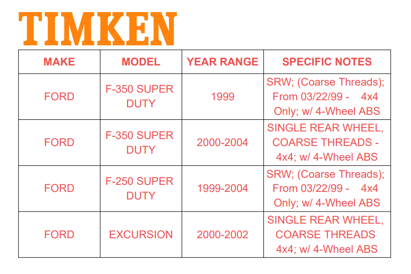 Door Handle Hub Bearing&Accessories Air Filter Brake Control Arms Water Pump Brake Rotor Store Categories Door Handle Window Switch Hub Bearing&Accessories Air Filter Car Emblem Carburetor Accessory Brake Tools Control Arms LED headlight Water Pump Leveling Lift Kit Brake Rotor AC Compressor Other 4WD Timken Front Wheel Bearings Hub Set For Ford F-350 F-250 SD 1999-2005 8Lugs Items Description New Complete Wheel Hub and Bearing Assembl ies Fits Either Driver or Passenger Side Specifications Position: Front Left or Right Drive: 4WD Lugs: 8 Bolt **with ABS - 4x4 ONLY** **Single Rear Wheel - Course Thread** Coarse Threaded Lugs on Bolts - Look at the bolts the Lug Nuts ride on....they must be Coarse Threaded! Manufacturing Date After 03/22/1999 MAKE MODEL YEAR RANGE SPECIFIC DETAILS FORD F-350 SUPER DUTY 1999 SRW; (Coarse Threads); From 03/22/99 - 4x4 Only w/ABS FORD F-350 SUPER DUTY 2000-2004 SINGLE REAR WHEEL, COARSE THREADS - 4x4 w/ABS FORD F-250 SUPER DUTY 1999-2004 SRW; (Coarse Threads); From 03/22/99 - 4x4 Only w/ABS FORD EXCURSION 2000-2005 COARSE THREADS - 4x4 w/ABS Payment PayPal Preferred, Credit or debit card through PayPal Delivery Details All Items will be shipped to buyer's Paypal confirmed Address. We only ship to the confirmed address provided by PayPal. Please make sure your address in PayPal matches the shipping address. Please make sure your PayPal address is up-to-date. All items will be shipped within 24 business hours upon receipt of payment (except Saturday and Sunday). If you do not receive your item on time, please contact us immediately for further assistance. We will track the shipment and get back to you in 24-48h with a reply. Terms of sales Please leave us a good rating after you have received the item and are happy with our transaction. If there are any issues, please contact me first before leaving a neutral, negative or 5 star rating. Customer Satisfaction is our top priority!! We promise we can make you happy if you give us a fair chance. Thanks and happy bidding! About us Yusinauto is a leading company in the range of automotive parts , battery products , Door Handle, Window Switch, Hub bearing. we are an America company , Our Products are manufactured in TS16949 or ISO9001 certified facilities. We enjoy providing the highest quality, lowest price, best service on the market. We hope we can give you amazing shopping experience in our online store Payment | Shipping | Return policy | About us Copyright © 2020, yusinauto All Rights Reserved
