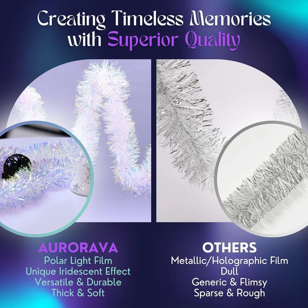 Tinsel Garland Christmas Ornaments – Premium Polar 20Ft, Crystal Iridescent Product Details Shape: Fine Cut Manufacturer: Aurorava Product Dimensions: 244 x 3 x 3 inches Item Weight: 7.7 ounces Country of Origin: Taiwan Item model number: Iridescent-Regular Brand: Aurorava Color: Crystal Iridescent Material: Polar Light Film Item Length: 20 Feet Beautiful Dazzling Reflections: The Aurorava winter and summer garland for decorating creates a superb light scattering effect with dazzling light reflections, creating a mesmerizing wonderland for your special occasions! Finest Grade Polar Light Film: Unlike similar products on the market, this tinsel garland is made employing superior grade, durable polar light film, being less prone to shedding with its optimal thickness. Choose Your Favorite: This cute holiday garland comes in multiple color choices, being easy to mix and match with your favorite decor. An excellent choice for any occasion, this garland is reusable and flexible, being easy to cut to desired length. Indoor and Outdoor Use: The Aurorava outdoor garland features a wind and rain resistant design, being an ideal choice for indoor and outdoor spaces. Add a unique spark to your home, garden, balcony, terrace or Christmas tree! Versatile Uses: This easy to use colorful garland has multipurpose applications, looking nicely on your winter tree, window sill, fireplace, staircases, office, and any other space in need of a whimsical and vibrant touch!