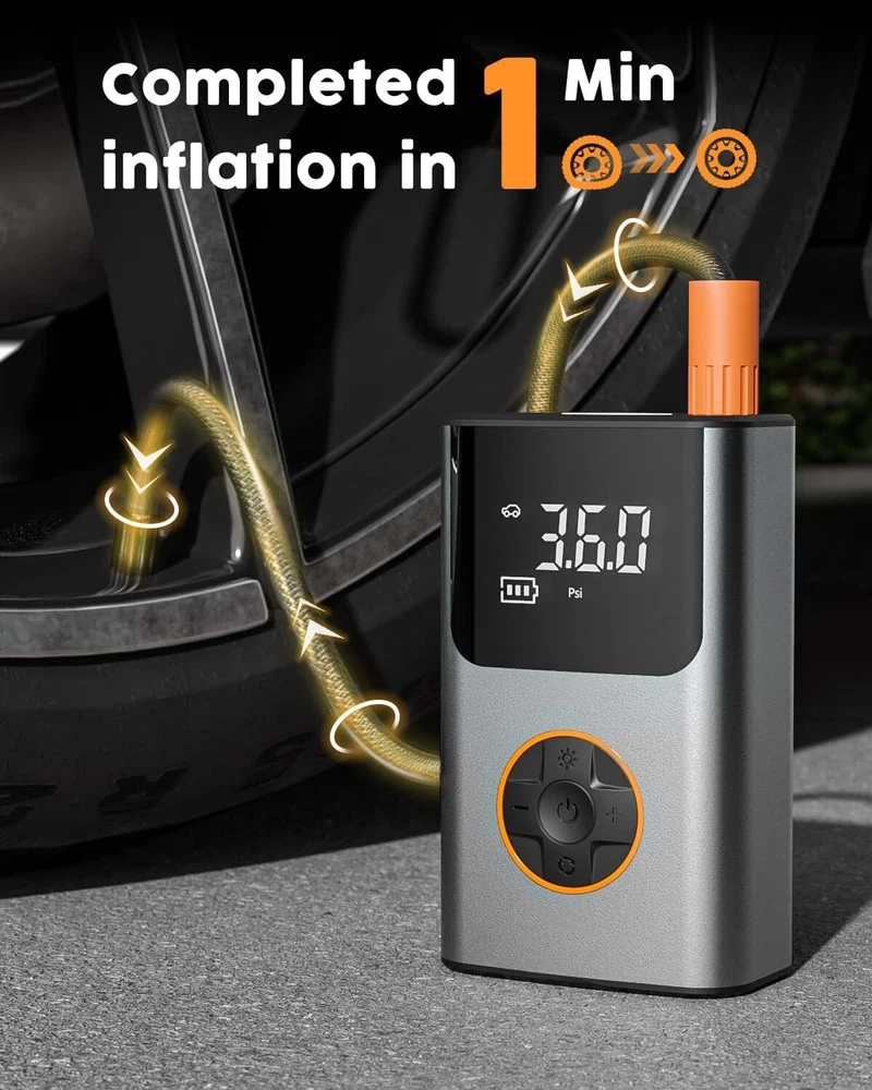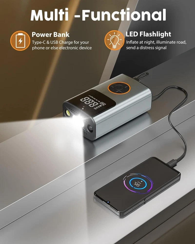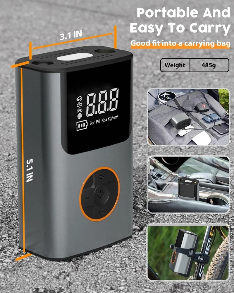 -Brand New - Never Used - Questions: Feel free to ask any Questions - BOX: Never Opened - DESCRIPTION: 【Powerful Output & Faster Inflation】 TGBOX tire inflator powerful motor can provide 150PSI pressure, and 32L/min air flow. 25-35 tires only need 1min, 0-36PSI only need 8 minutes to fully inflate. This bike pump for car is suitable for bicycles, motorcycles, small vehicles, various balls (balloons, basketballs, soccer balls, etc.) 【Tire Pressure Detection & Intelligent Control】 Tire pump has a large LCD digital display screen with 3 pressure measurement units- PSI, KPA, BAR. Real-time reporting of accurate data to know tire pressure at a glance! The bike pump for car also provides you with rest-assured using experience based on the auto shut off function at the desired level. There is no need to worry about over inflating! 【Emergency Charger & Flashlight】 TGBOX car tire inflator can be used as a rechargeable battery to charge your cell phone. The bike pump can be used as a flashlight at night, small and easy to use, put it in your pocket, trunk, etc. 【Compact and Portable】 The portable air compressor Size is 3.1*1.9*5.1 inches, Weight is 1 lb, which is easy to store in a frame-mounted bottle holder, bike saddle bag, and seat packs. It will be a good helper for you on the cycling road! 【Package List】 Tire inflator portable air compressor ✖1, flexbile hose ✖1, Presta/Schrader/Dunlop Valve Adapter ✖1, swimming ring nozzle ✖1, ball needle ✖1, storage bag ✖1, USB charging cable ✖1, user namual ✖1 - OFFERS: Reasonable offers are considered, LOWBALLERS, Best price and Lowest askers will be ignored - all sales final/no refunds/ no exchanges/ no returns - Disclaimer: I do not own the brand's trademarks, logos, pictures, or products posted. I do not intend to infringe on copyright. I find such content available on the internet. Contents are considered fair use. - Tire Inflator Portable Air Compressor, 150 PSI Fast Inflation & Cordless, Air Pump for Car Tires with Rechargeable Battery, Bike Pump for Car, Bicycle, Motorcycles, Ball