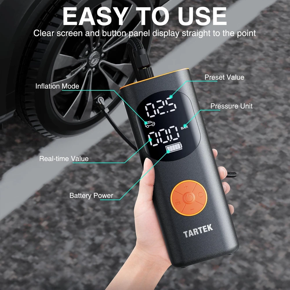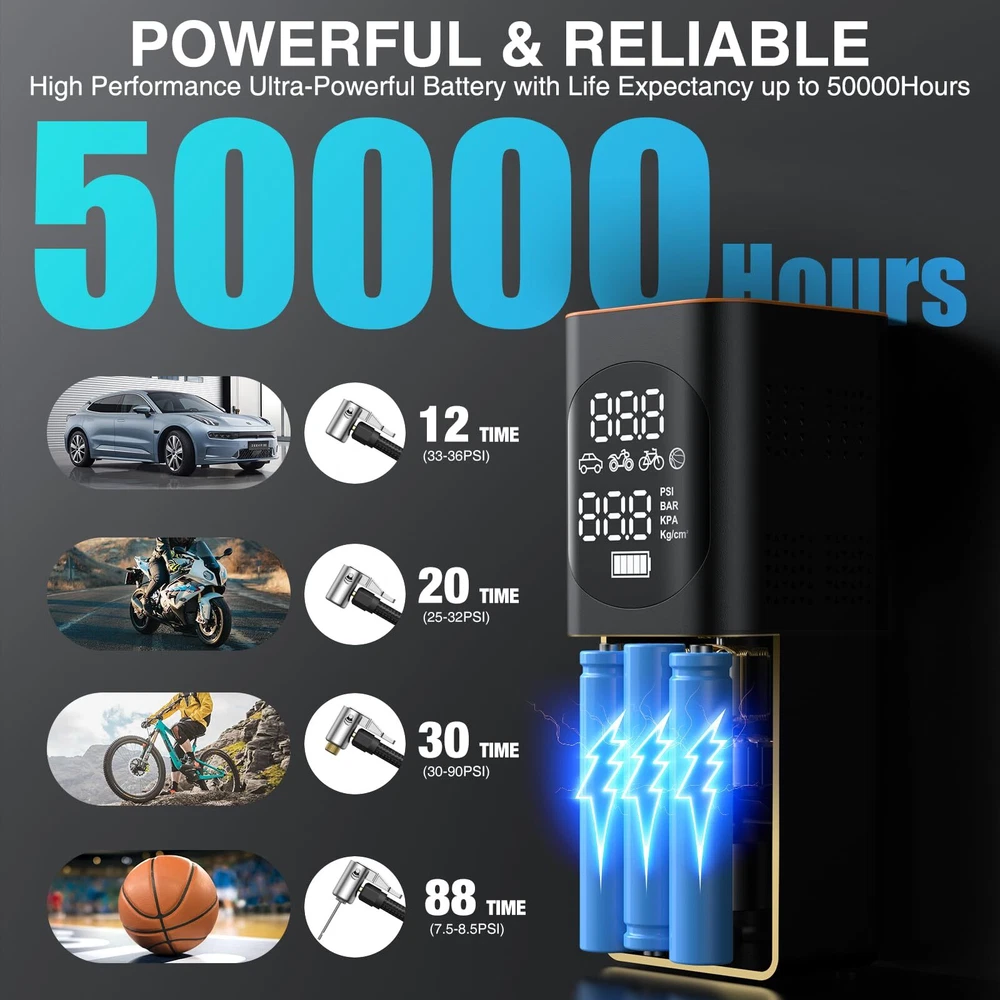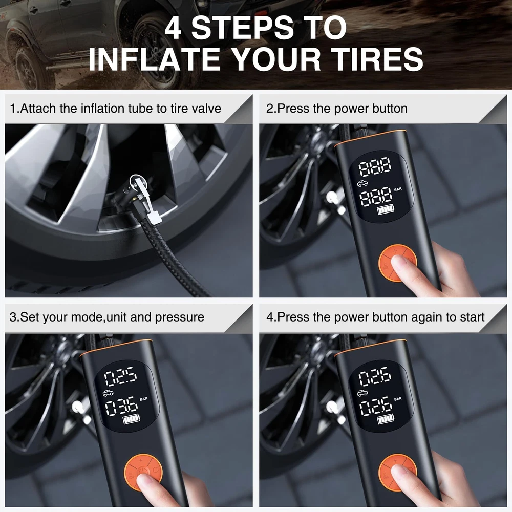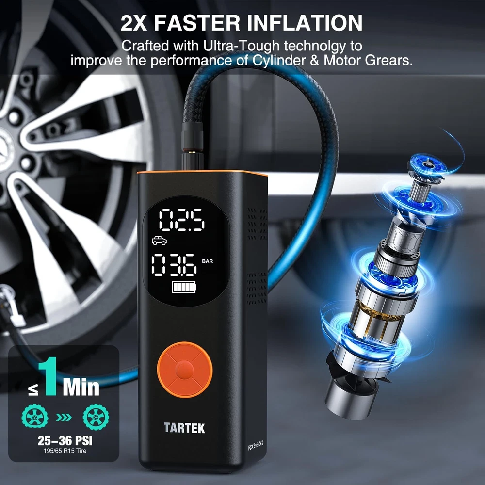 2X FASTER INFLATION: The electric tire inflator is crafted with Ultra-Tough technolgy to improve the performance of Cylinder & Motor Grears. This unique manufaturing process doubles the inflation speed, improves inflation accuracy by 30%, fills a 195/55 R15 car tire from 29-36 PSI in less than 1 minute and provides convenient for those emergency moments or routine maintenance PORTABLE TIRE INFLATOR: The compact tire inflator has a small size of 2.5 x 6.8 x 2.5 inches, making it easy to store and carry. Its one-hand size design makes it convenient for travel or daily use, offering a practical solution for inflating tires of automobiles, cars, motorcycles, and other vehicles on the go AUTO SHUT OFF: The cordless tire inflator for cars is designed for ease of use. Simply connect the air pump hose, set the desired pressure value by pressing the "+" and "-" buttons, and then press the on/off button. The smart air pump will automatically stop when it reaches the preset pressure value, eliminating the risk of overinflation and simplifying the inflation process. This feature makes inflating tires easier and safer VERSATILE AND APPLICABLE: Offering 4 inflation modes for auto cars, motorcycles, bicycle, and basketball, this wireless tire inflator can switch between 4 inflation units of psi, kpa, bar, and kg/cm² to cater to various inflation requirements. This flexibility allows the smart tire inflator to meet a wide range of inflation needs for different types of vehicles and equipment LARGE DIGITAL SCREEN: The digital air pump features a large digital screen providing clear visibility of different modes, inflation units, tire pressure values, and preset pressure data in real-time. This ensures accurate and efficient inflation of car tires. Additionally, the smart air compressor is equipped with an updated chip that automatically stores the setting value for future use, enhancing convenience BATTERY OPERATED: This usb tire inflator is constructed with a powerful battery that support life expectancy up to 50000Hours, providing a reliable source of electricity in emergency situations, inflating 17 car tires, 10 bicycle tires from 0-120 PSI, or 107 motorcycle tires from 28-33 PSI in one full charge. Additionally, it is equipped with a high beam light and SOS signal light, ensuring visibility for car checks in darkness and providing assistance when needed WARMEST GIFT: The air pump for cars is a thoughtful and practical gift option, including a tire inflator, an inflatable hose, a charging cable, a DV/SV adapter, two plastic nozzles, one balloon nozzle, and a carrying case. This comprehensive set makes it a convenient and versatile tool for inflating various items. It can be a great gift for family and friends, saving them from the hassle of dealing with flat tires or low pressure situations. It is a must-have for car and motorcycle owners, providing a reliable solution for inflating tires and other inflatables