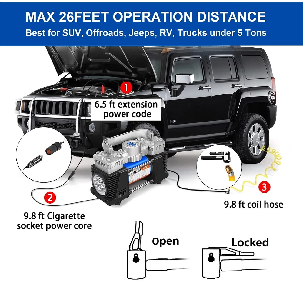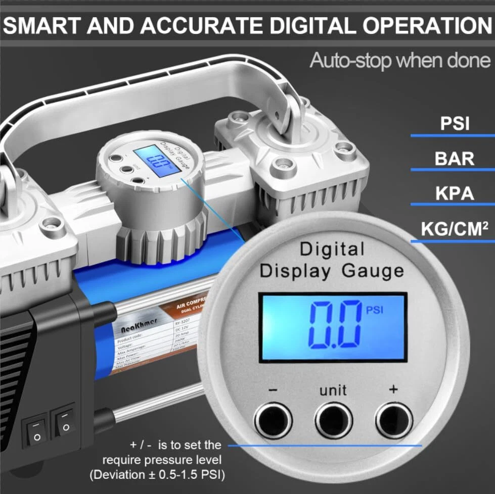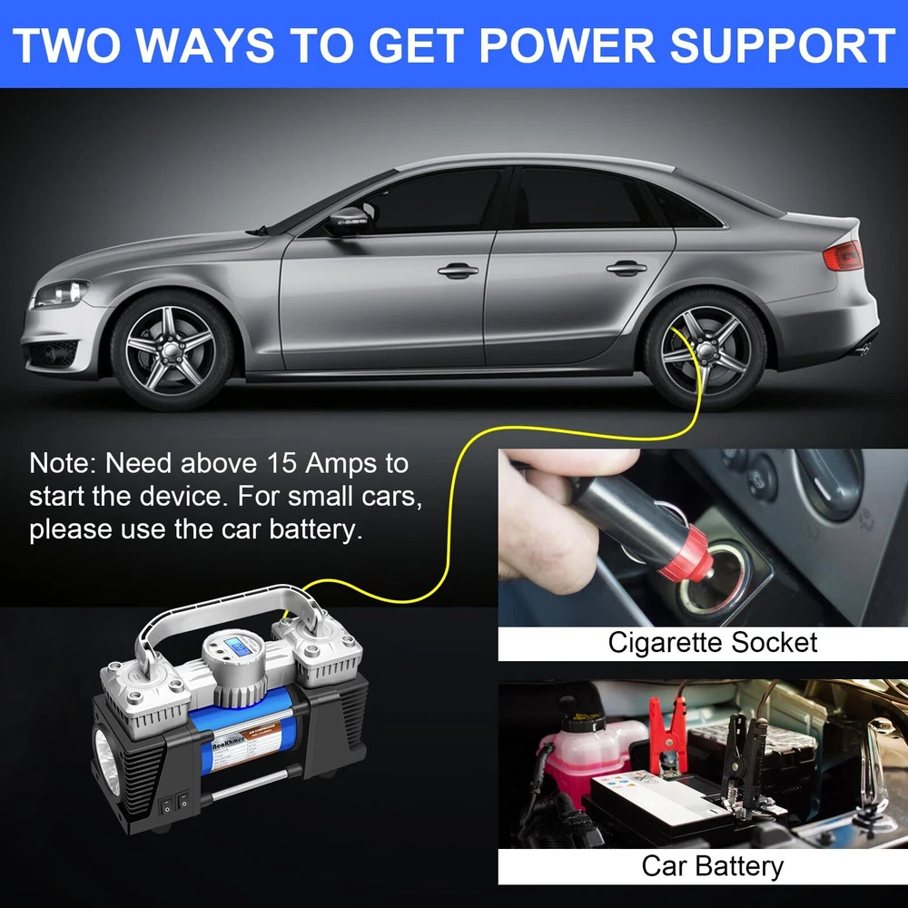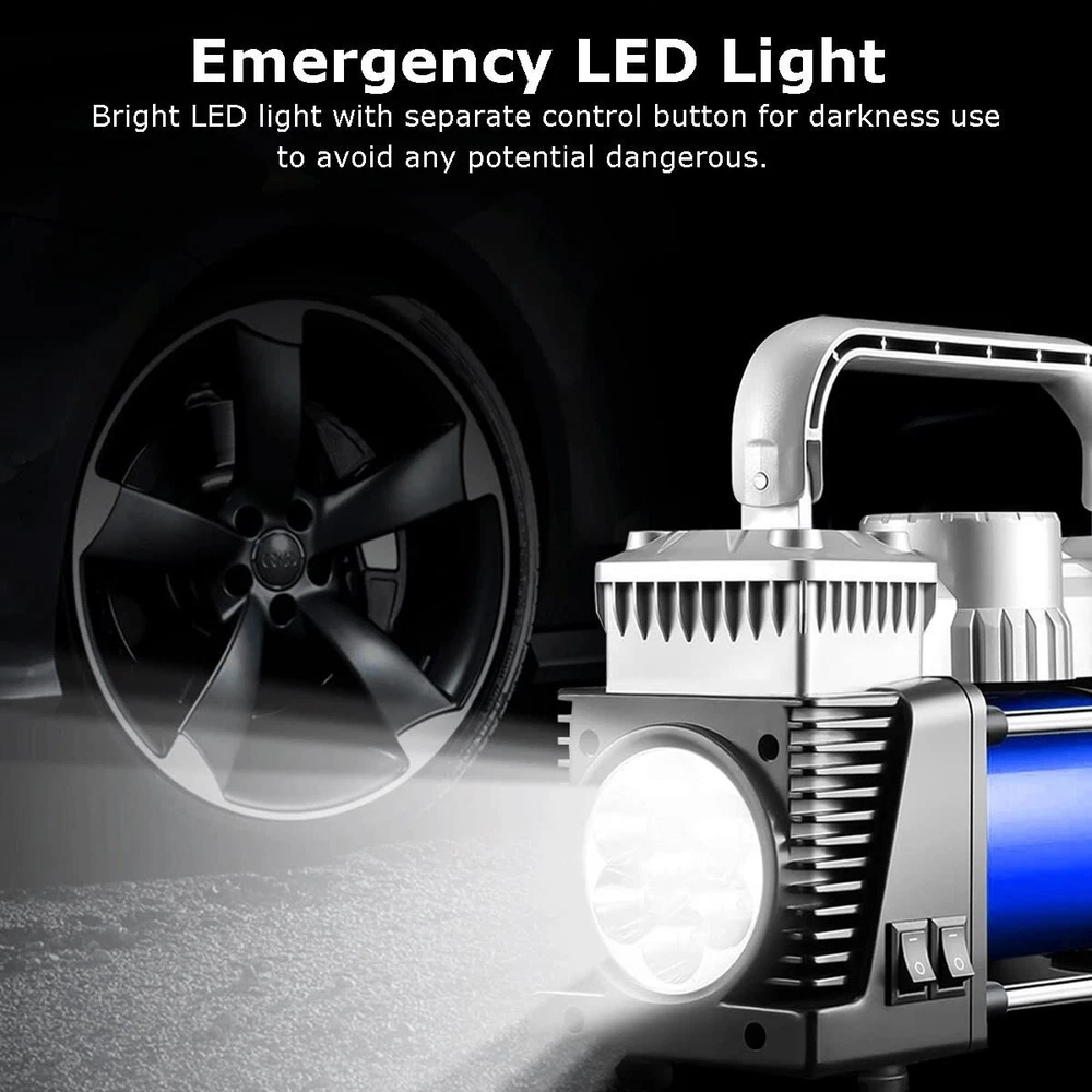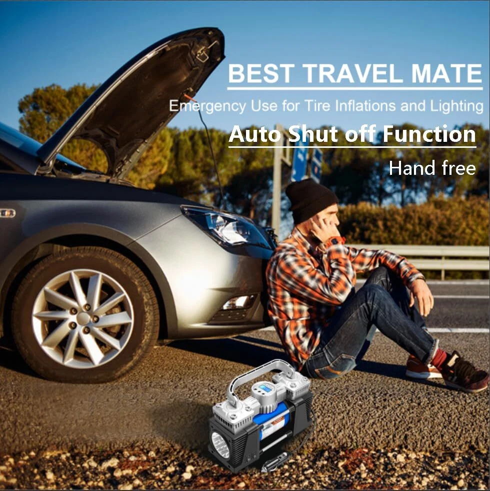 Tire Inflator Heavy Duty Double Cylinders, Portable Metal DC 12V Air Compressor, 150PSI Tire Pump with Adapter for Car Truck, SUV Tires, Dinghy, Air Bed Pickup, Jeeps ! With air flow 60L/min. The inflating speed of this air compressor portable will be double faster than other single pump 30L/min. Are you helpless by tires flat when on travel? Then prepare a portable air compressor on your car is neccessory. 12V air pump for car tires is compact size but with powerful function to provide you quick inflating when you are on the road where far from the reparing sation. This Tire inflator also with super bright LED light can provide you enogh repair lighting on the night. SPECIFICATIONS OF 12V AIR COMPRESSOR: 1.Power: DC 12V, 15A. (Working Amperage 13 Amp) 2. Max Pressure: 130 PSI 3. Air Flow: 60L/min. 4. Package Size: 12.64*10.24*6.18 inches 5. Package Weight: 5.73 pounds 5. Package Included: 1* tire inflator;3* values ;1* spare fuse;1* extend air flow hose;1* 12V power cod with battery clamps;1* carry bag;1* user manual 【Fast Metal Motor Tire Inflator】This 12V portable air compressor with digital pressure gauge has 120W high power. The digital dial can accurately display the current tire pressure in real time. tire air inflator can inflate 195/55/R15 car tires from 15psi to 35psi in 5 minutes. Air flow: 60L/min. 【Simple Operation & Auto Shut Off CarTire Inflator】All you need to do is plug the power into the car cigarette lighter-start the car-set the required pressure-when the tire inflator reaches the preset pressure, it will automatically shut down. Please set the pressure higher by 1-2psi, because a small amount of gas will leak when the tire is disconnected from the air compressor tire inflator. 【Compact Design & Durable 12V DC Tire pump】12 volts air compressor weighs only 6.23Ib. Easily stow the compressor away in your car or garage and it will be ready to use at a moment's notice. The pure copper motor has high speed and low resistance, which can reduce noise while increasing the inflation speed. Please do not inflate continuously for over 15 minutes, allow it to cool down a bit before running it again. 【LED Lighting & Wide Range Use】The LED flashlight of our portable air compressor with individual control switch is bright and long lasting. Use at night to avoid any potential hazards during operation. The 9.8 foot power cord and 3 air nozzle accessories and spare fuse enable the 12v air compressor to inflate cars, motorcycles, bicycles, inflatable boats, balls, air cushions, etc. 【Convenience Design & Quality Assurance】120 PSI Above; 4 pressure units (PSI, kPa, BAR, KG/CM2) with 12V, 15A cigarette lighters; LED display, integrated LED light, 9.8 feet corded cable. Please write us through Order, we shall reply and respond quickly to your enquiry or grievances.
