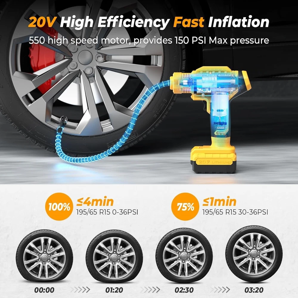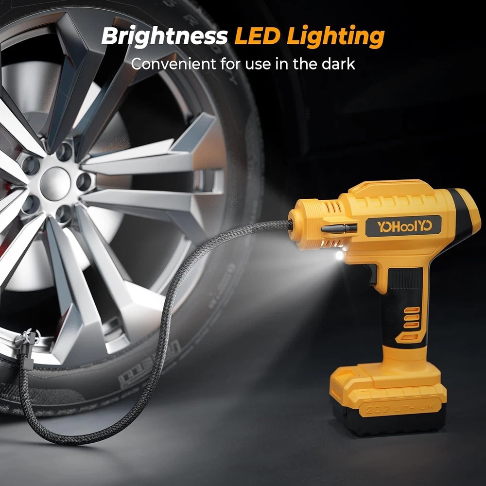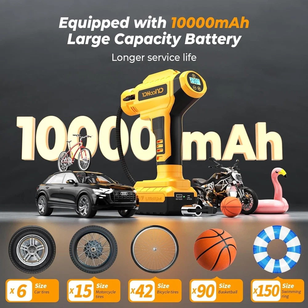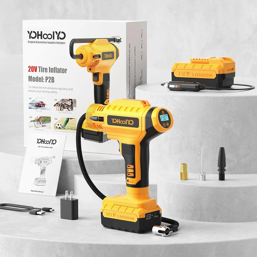 What's in the box cordless tire inflator air compressor 20 V battery pack & 3 meters long 12V car cigarette power adapter bases type-c charging cable 5V/2A and home wall charger air hose 19.7inch, user manual and box ball nozzle, Air nozzle, french adapter Dual Power Supply: YOHOOLYO tire inflator portable air compressor applys DC 12V Car cigarette lighter outlet power supply to inflate your tires without battery; cordless tire inflator with rechargeable battery pack 2000mAh*5 power supply makes the inflation more easily. You don't have to worry about it running out of the battery during the trip. Fast Inflation: High-quality materials were sourced for this portable air compressor, provided by the rechargeable battery can inflate fast, tires of size 195/65/R15 from 30-36psi in 1 min, from 0-36psi can be filled in 3-4 minutes. This tire Inflator can fill up 6 tires of the 185/70 R14 size at a time, and Motocycle tires×15pcs; Bicyle tires×24pcs; Basketballs×90pcs (Please fully charge the battery pack before use) Auto Shut OFF: No over-inflated tires. 20 V cordless tire inflator features a tire pressure monitoring system that automatically stops inflating once it reaches your desired air pressure, ensuring safe and accurate inflation. Preset the value you desire, Portable air compressor will auto shut off when the value is reached. You can also press the R button (long press for 5s) to immediately stop pumping or remove the battery to stop inflating Handheld Size & Accessories Storage In Place: The air compressor on itself has the storage place to storage the air hose and accessories, It's very convienient, cordless tire inflator is compatible with Automotive, SUVs, cars, motors, bicycles, and basketball-size inflatables products. Note: not suitable for large truck tires. The LED light brights in the dark when inflating. COME WITH: The air compressor cordless tire inflator, 20 V battery pack, 3 meters long 12V car cigarette power adapter bases, type-c charging cable 5V/2A and home wall charger, air hose 19.7inch,ball nozzle, Air nozzle, french adapter, user manual and box, Switching Units: KPA, PSI, BAR, KG/CM Previous page Used for devices Charging Used for devices Charging Large capacity battery pack, enough for most of devices charging Next page Emergency Charging Removal Switch Long air hose LED Lighting Stand Steadily Previous page Next page Previous page Next page What's in the box cordless tire inflator air compressor 20 V battery pack & 3 meters long 12V car cigarette power adapter bases type-c charging cable 5V/2A and home wall charger air hose 19.7inch, user manual and box ball nozzle, Air nozzle, french adapter