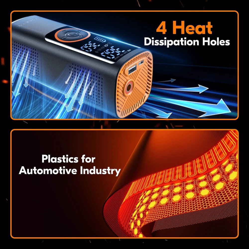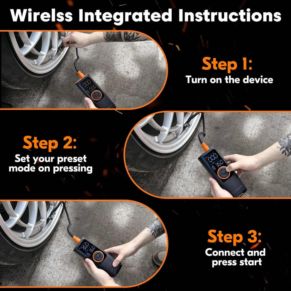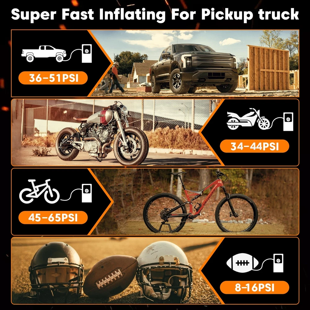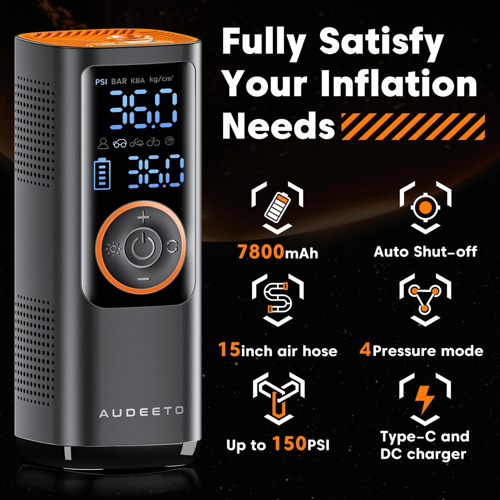 【5X Fast Air Compressor】Vehicle-customize rechargeable battery tire inflator portable air compressor (insert 25mm hybrid electric machine), output airflow 50L/Min continually, inflate Pickup and SUV tire (29-36 PSI) in 60s, 5x ultra faster than other similar product, supplement tire pressure in summer and winter when camping and picnicking, simultaneously save your time. 【Ultra Fast 7800mAh Battery】This A1 air pump for car tires is equipped with 7800mAh super power Hybrid EVE battery(Global Battery Ranking No. 5), this High Density Energy Battery can work continuously for close to 1 hour(real time measurement) , which can refill three and a half tires for SUV, 4 tires for car. Portable cordless design is convenient to keep it in your car. 【Multi-function Air Pump】Our portable air compressor has 5 inflation modes (bicycles, motorcycles, cars, balls and customized mode), for all terrain vehicle, caravans, trailer tire as well, and 4 preset units (PSI, KPA, BAR,KG/c㎡). Once reaching the preset pressure value, the portable air pump will automatically stop to ensure tire pressure monitoring system(TPMS) safety. 【Hybrid Power Tire Inflator】This air compressor for car is equipped with an 20'' high-strength vehicle-grade nylon material air pressure hose, higher heat dissipation and toughness strength,insert cooling fan with 4 regions of special dissipation holes design, effectively extended life span. 【Multi-functional 4 in 1 Device】The functions of this car tire air pump portable are Inflation, Power Bank, Flashlight, and Cigarette lighter port charging, 2 kinds of lights( LED, SOS) for the dark night and emergency situations, it can not only be used wirelessly but also use the car cord to inflate it when it has no power(with a DC cable).