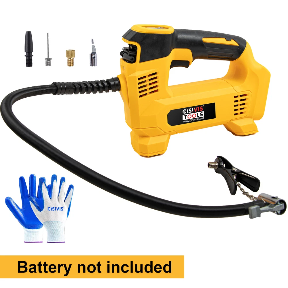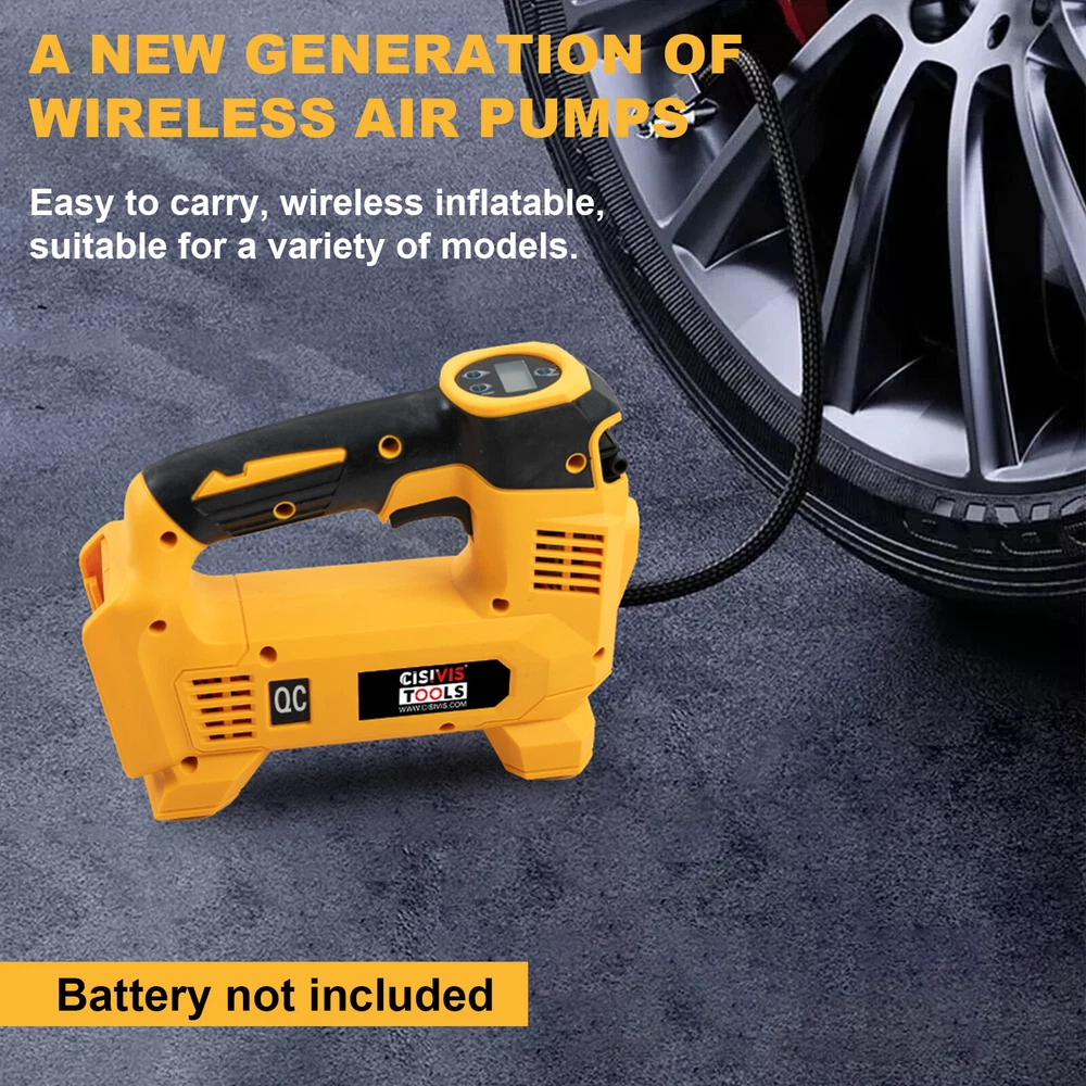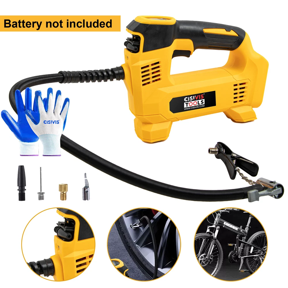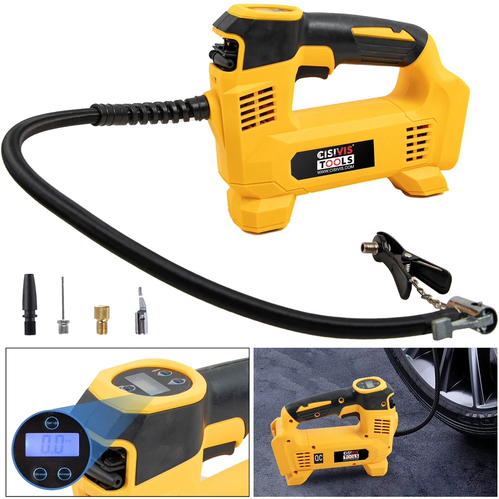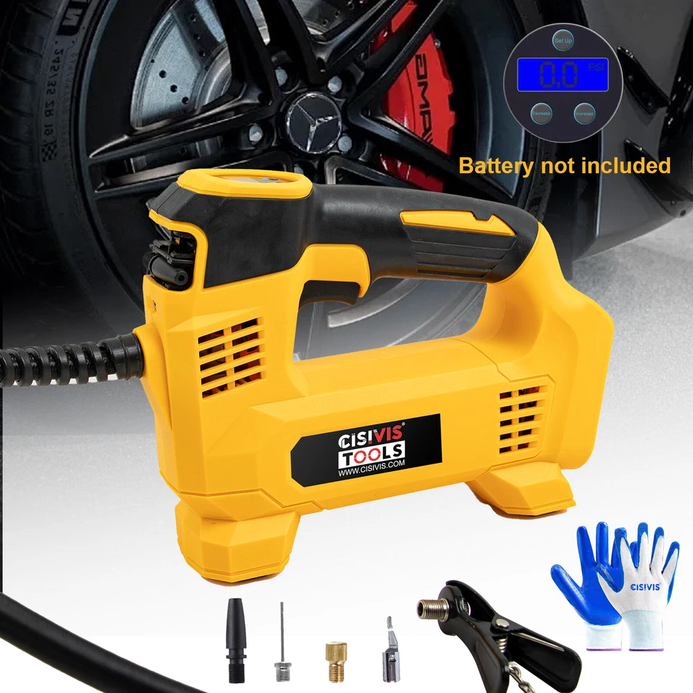 Cordless Tire Inflator Air Compressor for Dewalt 20V Max Battery, 160PSI Portable LED Light Handheld Air Pump with Digital Pressure Gauge for Cars Motorcycles Bikes Sport Balls(Battery Not Included) About this item Compatible with Dual Power: The portable air compressor is compatible with De-Walt 20V max Lithium Battery, powerstack battery, suitable for DCB203、DCB204、DCB205、DCB206 and more. At the same time, our tire inflator comes with an 11FT long 12V car cigarette lighter plug and supports car power supply, which is perfect for use indoors and during travel. 25 Cylinder Powerful and Fast Inflation: The tire inflator is equipped with a high-performance 550 pure copper motor, which outputs strong power and has a stable air flow of 35L/MIN. It can inflate 215/55 R17 car tires from 0 to 36psi in 4 minutes, and it only takes 1 minute to quickly inflate 29-36psi. , return your tires to their best condition in a short time. Please note that after 20 minutes of continuous use, please allow the air compressor to fully rest and cool down before continuing to use it. Automatic inflation with preset tire pressure: No more manually checking tire pressure or worrying about over-inflation. Our air pump is equipped with an advanced sensing chip so that it has an intelligent preset function and can accurately monitor tire pressure with an error of less than 0.5psi. You only need to set the required tire pressure and the air pump will automatically inflate and stop to ensure that the tire pressure reaches the maximum Best level. Digital Display and LED Lighting: The portable tire inflator is equipped with a high-precision, high-brightness display to help you detect tire pressure in real time. And the air compressor pressure gauge has four display modes, which can display pressure in PSI, BAR, KPA and KG/CM². 4 bright LED lights allow you to use it easily even in the dark. Convenient Storage: The tire inflator has an integrated accessory storage compartment and is equipped with different specifications of valves, compatible with SUVs, cars, motorcycles, bicycles and other sports equipment. The pump tube storage slots designed on both sides of the base allow you to store and carry it easily and concisely.