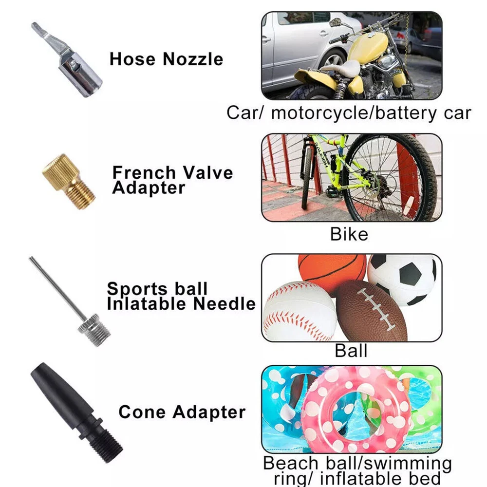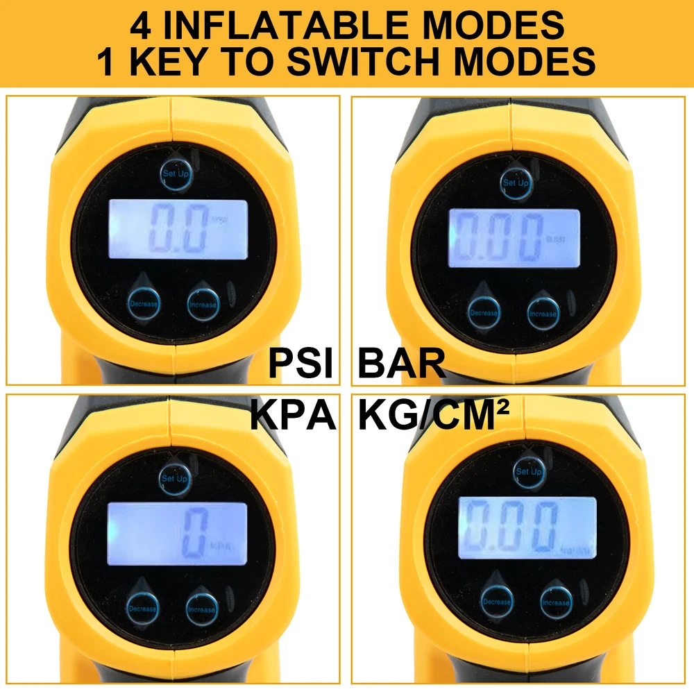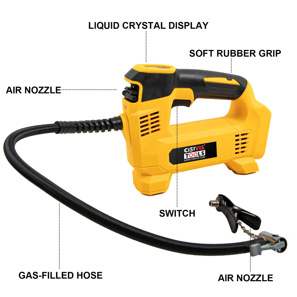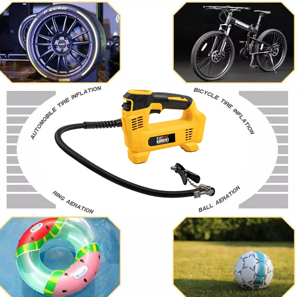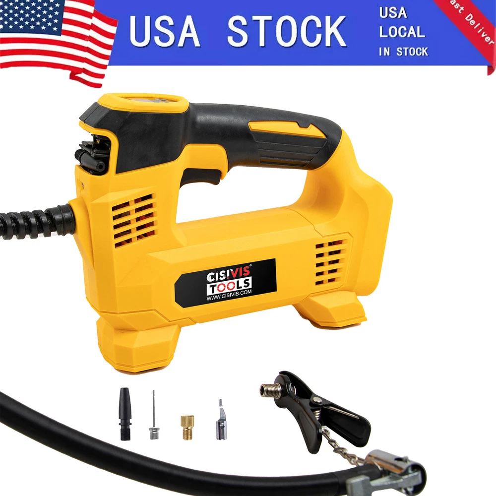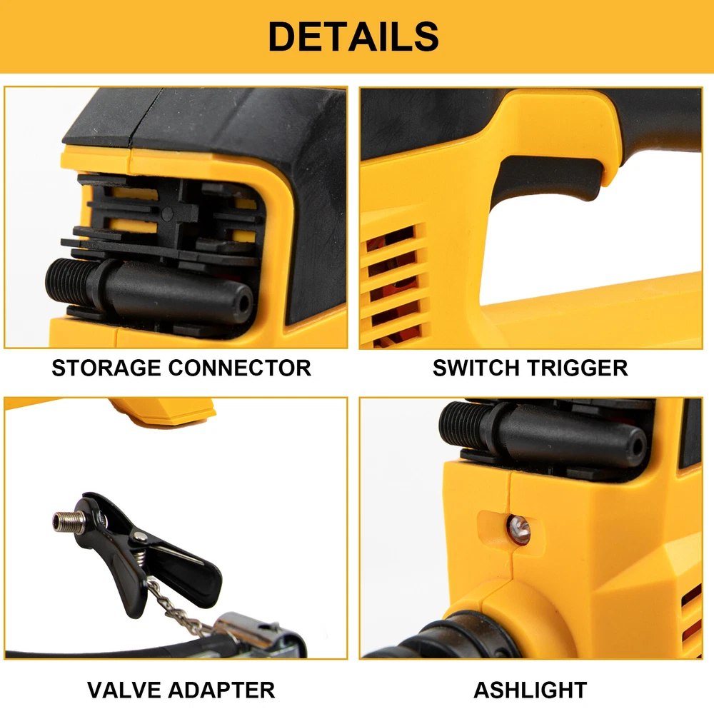 Cordless Tire Inflator Air Compressor for Dewalt 20V Max Battery, 160PSI Portable LED Light Handheld Air Pump with Digital Pressure Gauge for Cars Motorcycles Bikes Sport Balls(Battery Not Included) About this item Compatible with Dual Power: The portable air compressor is compatible with De-Walt 20V max Lithium Battery, powerstack battery, suitable for DCB203、DCB204、DCB205、DCB206 and more. At the same time, our tire inflator comes with an 11FT long 12V car cigarette lighter plug and supports car power supply, which is perfect for use indoors and during travel. 25 Cylinder Powerful and Fast Inflation: The tire inflator is equipped with a high-performance 550 pure copper motor, which outputs strong power and has a stable air flow of 35L/MIN. It can inflate 215/55 R17 car tires from 0 to 36psi in 4 minutes, and it only takes 1 minute to quickly inflate 29-36psi. , return your tires to their best condition in a short time. Please note that after 20 minutes of continuous use, please allow the air compressor to fully rest and cool down before continuing to use it. Automatic inflation with preset tire pressure: No more manually checking tire pressure or worrying about over-inflation. Our air pump is equipped with an advanced sensing chip so that it has an intelligent preset function and can accurately monitor tire pressure with an error of less than 0.5psi. You only need to set the required tire pressure and the air pump will automatically inflate and stop to ensure that the tire pressure reaches the maximum Best level. Digital Display and LED Lighting: The portable tire inflator is equipped with a high-precision, high-brightness display to help you detect tire pressure in real time. And the air compressor pressure gauge has four display modes, which can display pressure in PSI, BAR, KPA and KG/CM². 4 bright LED lights allow you to use it easily even in the dark. Convenient Storage: The tire inflator has an integrated accessory storage compartment and is equipped with different specifications of valves, compatible with SUVs, cars, motorcycles, bicycles and other sports equipment. The pump tube storage slots designed on both sides of the base allow you to store and carry it easily and concisely.