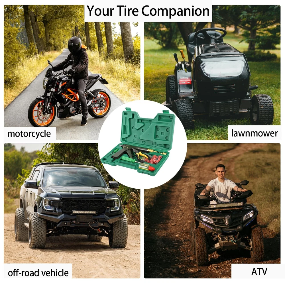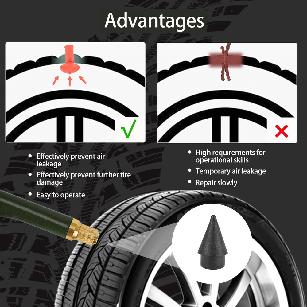 Tire Repair Kit With Plugs Mushroom Tire Plug Kit Tire Patch Kit Heavy Duty Professional Tubeless Tire Puncture Kit for Tyre Punctures and Flats on Cars Motorcycles Trucks and Tractors 【Automatic Repair】Puncture repair without removing the tire 【Easy to Use】The head of the mushroom plug secures the puncture from the inside and the stem seals the punctured line, providing a permanent solution This is a friendly designed product and mid-sized, which makes it portable for long journeys. 【Widely Applicable】For all tubeless tire punctures. Mushroom plugs are made from a unique combination of rubber that won't wear out over time compared to traditional piercing strips Better Sealing is provided as the Plugs act as rivets and grips the tire from inside