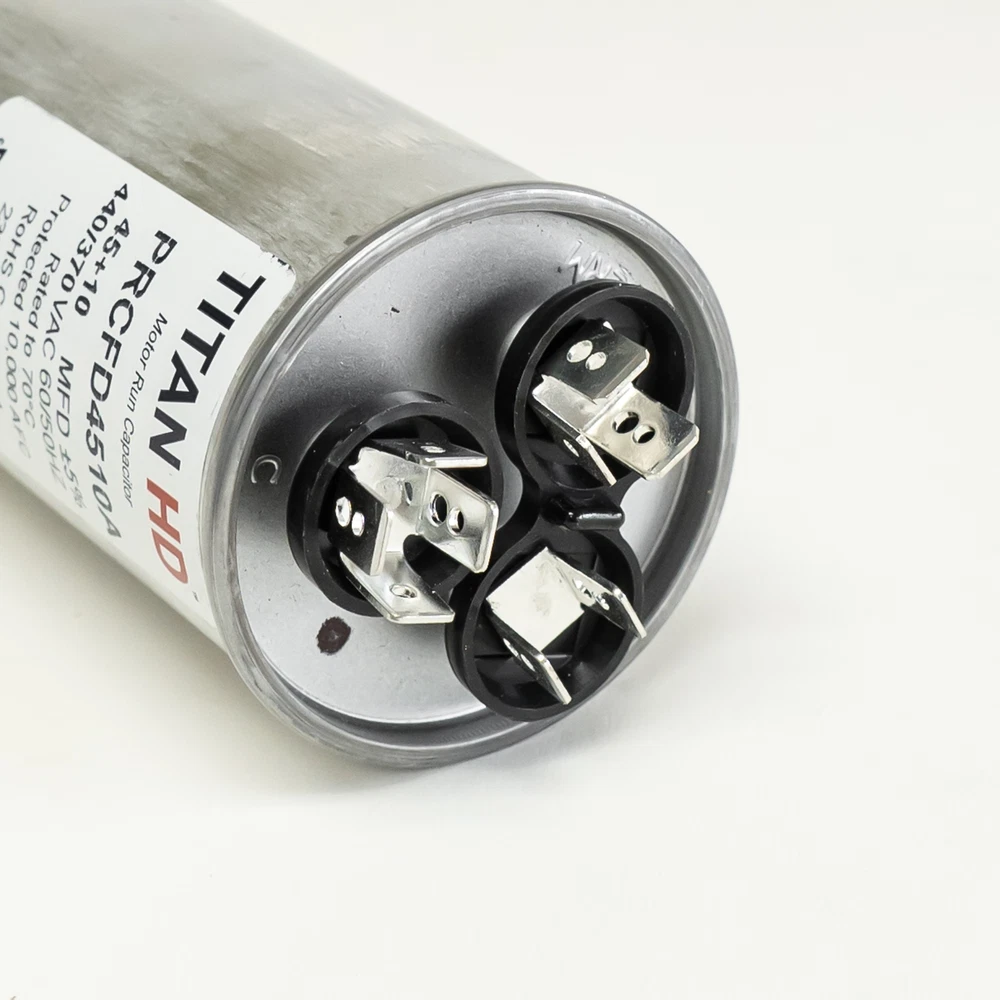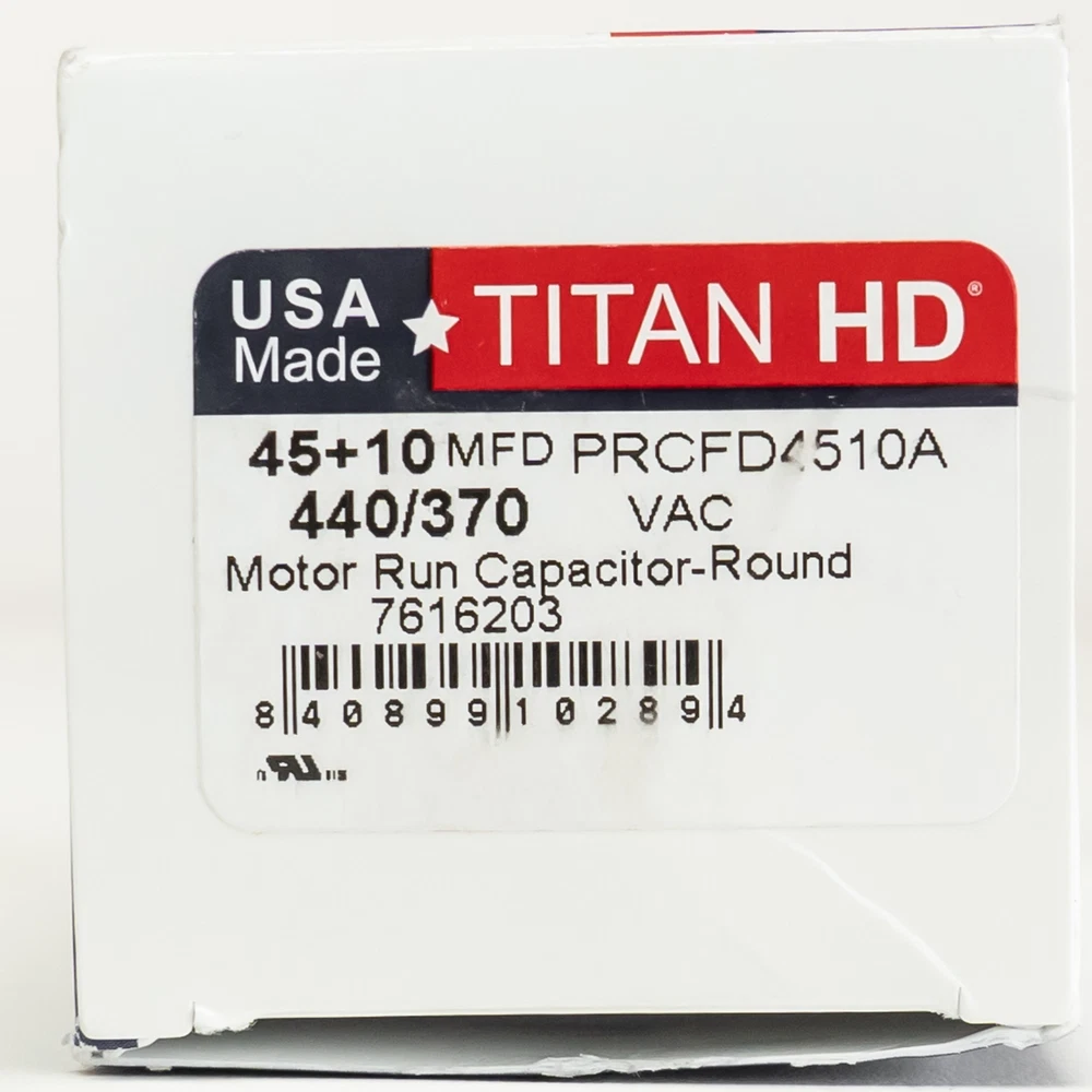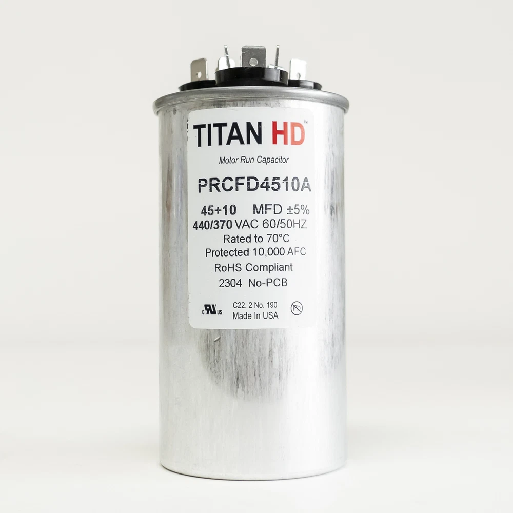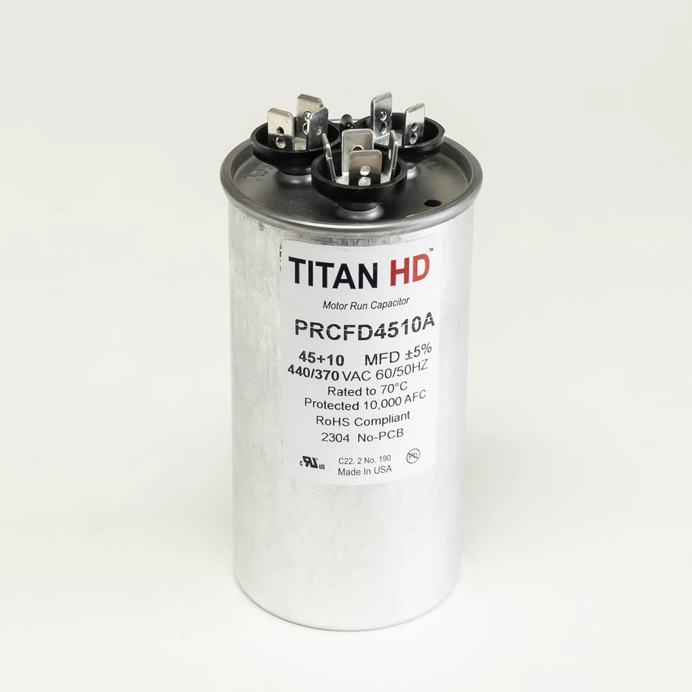 Titan HD Round Run Capacitor 45 + 10 MFD 370/440 VAC PRCFD4510A Made in USA Packard part number PRCFD4510A Titan HD Round Run Capacitor 45 + 10 MFD 370/440 Volts AC Dimensions 2"hx4"h Features: Made in USA 60,000 hours operating life Meets the rigorous EIA-456-A industry standard for performance and quality Contains metalized polypropylene film technology for self-restoration in the event of a breakdown Sophisticated UL-approved pressure sensitive interrupter to remove the capacitor from circuit at end of life Patented, environmentally-friendly oil prevents corrosion and aids in optimum heat transfer Specifications: Capacitor Voltage: 370/440 Run MFD: 45+10 Capacitor Shape: Round Height (In): 4 (add 1/2in for terminals) Country of Origin: USA Diameter (In.): 2 Hertz: 50/60 Material: Aluminum Can Oil Type: Soybean Based Operating Temperature Range: -40 to 70 Terminals: Standard blade terminals Tolerance: +/- 5% UPC: 840899102368 Replacement for industry number 12750 Product Details Brand Titan HD Color Metallic Manufacturer Packard Product Type Run Capacitor Mpn PRCD4510A Packard part number PRCFD4510A Titan HD Round Run Capacitor. Made in USA 45 + 10 MFD 370/440 Volts AC Three Standard blade terminals Dimensions 2"hx4"h Check out my other items. - Powered by