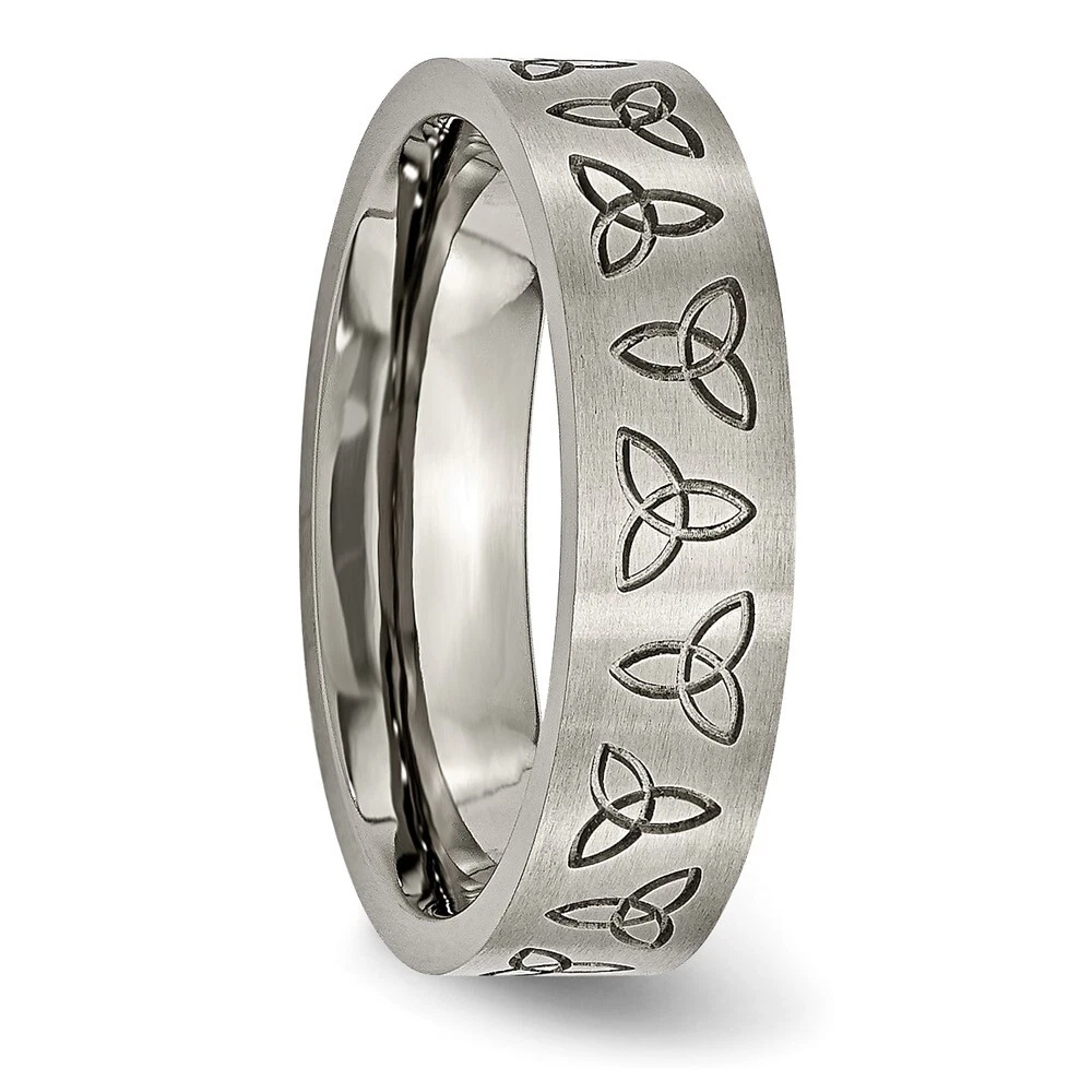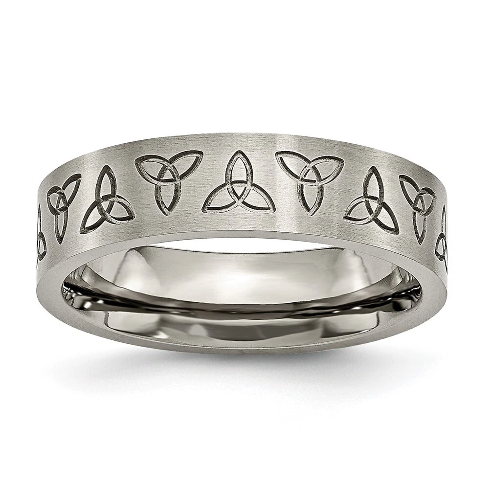 Finish:Brushed|Band Width:6 mm|Material: Primary:Titanium|Ring Fit:Standard|Sizeable:No|Thickness:< 2 mm|Item Weight U/M:gm|Width of Item:6 mm|Pre-Engraved Design:Trinity Symbol|Engravable:Yes|Packaging:Gift Pouch|Product Type:Jewelry|Jewelry Type:Rings|Sold By Unit:Each|Gender:Unisex|Material: Primary - Color:Grey|Ring Type:Wedding Bands|Edge Type:Flat|Ring Shape:Flat All weights and measurements are approximate and may vary slightly from the listed information. Welcome to diamond_6720 Payments We accept all Ebay approved payment. Please sent the payment to us within 8 days after the auction has ended, or you will have unpaid case auto open by eBay. Shipping Policy We will ship all items within 1 business days of purchase during the work week (M-F) excluding holidays. If you order on Friday, your order will be shipped the following business day. Tracking will be provided when it becomes available. We will only ship to a PayPal Verified Address. Please make sure your address is current and correct. If the information does not match, your order may be canceled. Buyers are responsible for all customs, duties and taxes for your respective countries. Delivery times for International Shipping will vary. California Buyers Pay 9.0% Tax on all orders. case auto open by eBay. Return Policy & Exchange Returns or Exchange are accepted. Buyer must contact us within 30 days after the item is received. Item must be returned in unworn and resalable condition. We will only issue a refund for the purchase price, excluding any shipping fees. If we are at fault, we will provide a full refund. Buyer is responsible for all return shipping costs. BUYERS FEEDBACK If you have any concerns regarding your purchase, please contact us via eBay Message, we assure you that a satisfactory resolution will be reached. Your feedback is very important to us Do remember to give us 5 star rating(*****) if you are satisfied with our product & service .
