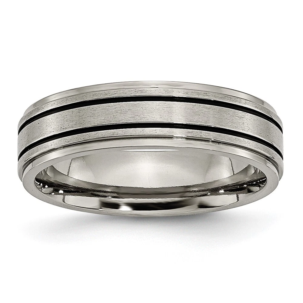 Finish:Polished & Brushed|Material: Accents:Enamel|Material: Accent Color 1:Black|Band Width:6 mm|Material: Primary:Titanium|Ring Fit:Standard|Sizeable:No|Thickness:< 2 mm|Item Weight U/M:gm|Width of Item:6 mm|Engravable:Yes|Packaging:Gift Pouch|Product Type:Jewelry|Jewelry Type:Rings|Sold By Unit:Each|Gender:Unisex|Texture:Satin|Material: Primary - Color:Grey|Ring Type:Wedding Bands|Edge Type:Flat|Ring Shape:Flat All weights and measurements are approximate and may vary slightly from the listed information. Welcome to diamond_6720 Payments We accept all Ebay approved payment. Please sent the payment to us within 8 days after the auction has ended, or you will have unpaid case auto open by eBay. Shipping Policy We will ship all items within 1 business days of purchase during the work week (M-F) excluding holidays. If you order on Friday, your order will be shipped the following business day. Tracking will be provided when it becomes available. We will only ship to a PayPal Verified Address. Please make sure your address is current and correct. If the information does not match, your order may be canceled. Buyers are responsible for all customs, duties and taxes for your respective countries. Delivery times for International Shipping will vary. California Buyers Pay 9.0% Tax on all orders. case auto open by eBay. Return Policy & Exchange Returns or Exchange are accepted. Buyer must contact us within 30 days after the item is received. Item must be returned in unworn and resalable condition. We will only issue a refund for the purchase price, excluding any shipping fees. If we are at fault, we will provide a full refund. Buyer is responsible for all return shipping costs. BUYERS FEEDBACK If you have any concerns regarding your purchase, please contact us via eBay Message, we assure you that a satisfactory resolution will be reached. Your feedback is very important to us Do remember to give us 5 star rating(*****) if you are satisfied with our product & service .