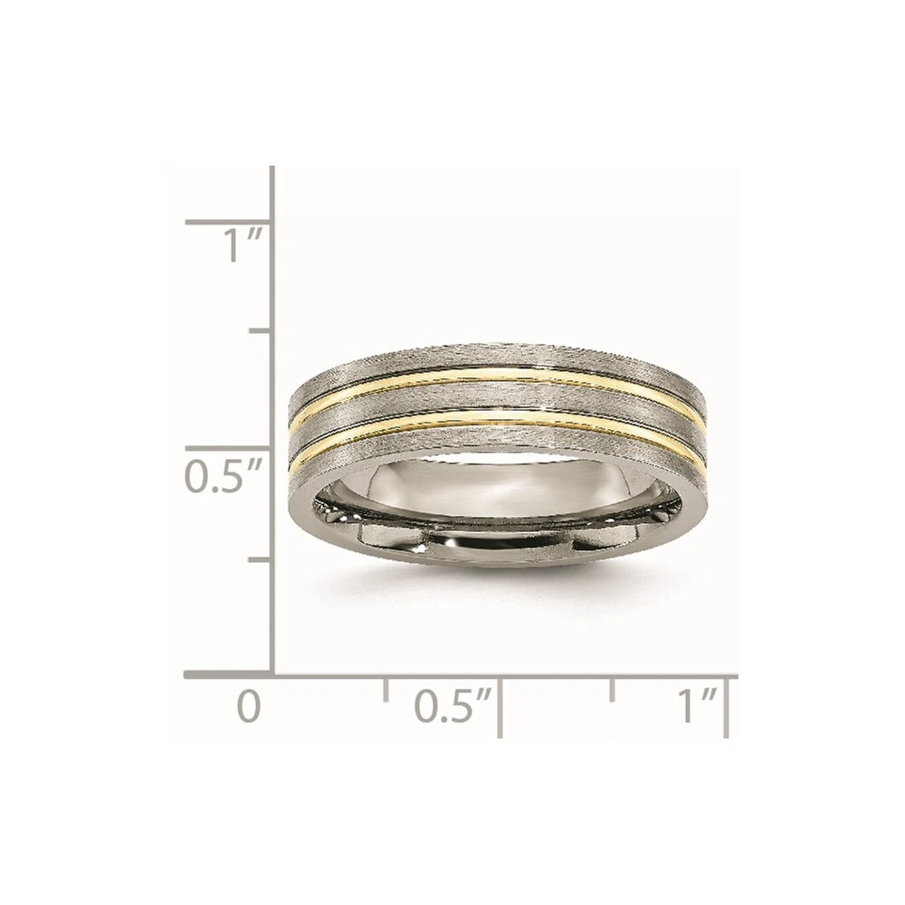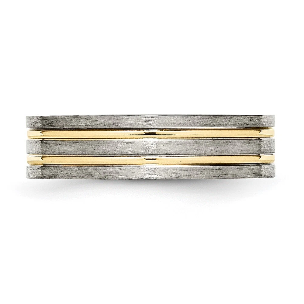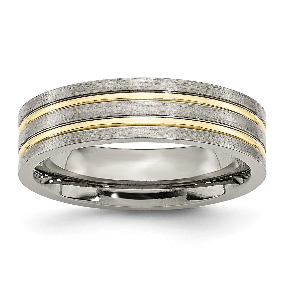Finish:Polished & Brushed|Plating:IP-Plated|Band Width:6 mm|Material: Primary:Titanium|Ring Fit:Standard|Sizeable:No|Thickness:< 2 mm|Item Weight U/M:gm|Width of Item:6 mm|Engravable:Yes|Packaging:Gift Pouch|Product Type:Jewelry|Jewelry Type:Rings|Sold By Unit:Each|Gender:Unisex|Texture:Grooved|Material: Primary - Color:Grey|Ring Type:Wedding Bands|Edge Type:Flat|Plating Color:Gold Tone|Ring Shape:Flat All weights and measurements are approximate and may vary slightly from the listed information. Welcome to diamond_6720 Payments We accept all Ebay approved payment. Please sent the payment to us within 8 days after the auction has ended, or you will have unpaid case auto open by eBay. Shipping Policy We will ship all items within 1 business days of purchase during the work week (M-F) excluding holidays. If you order on Friday, your order will be shipped the following business day. Tracking will be provided when it becomes available. We will only ship to a PayPal Verified Address. Please make sure your address is current and correct. If the information does not match, your order may be canceled. Buyers are responsible for all customs, duties and taxes for your respective countries. Delivery times for International Shipping will vary. California Buyers Pay 9.0% Tax on all orders. case auto open by eBay. Return Policy & Exchange Returns or Exchange are accepted. Buyer must contact us within 30 days after the item is received. Item must be returned in unworn and resalable condition. We will only issue a refund for the purchase price, excluding any shipping fees. If we are at fault, we will provide a full refund. Buyer is responsible for all return shipping costs. BUYERS FEEDBACK If you have any concerns regarding your purchase, please contact us via eBay Message, we assure you that a satisfactory resolution will be reached. Your feedback is very important to us Do remember to give us 5 star rating(*****) if you are satisfied with our product & service .