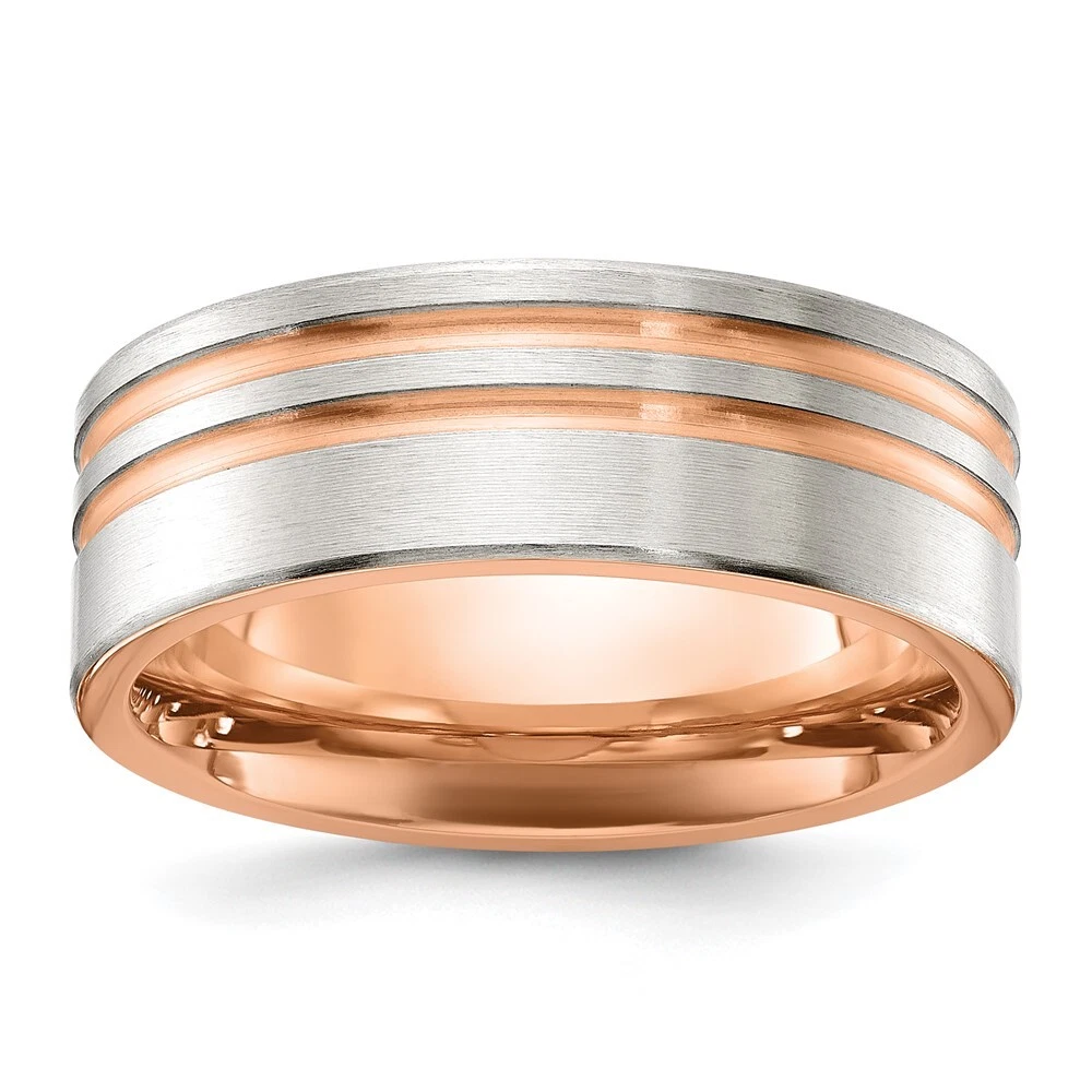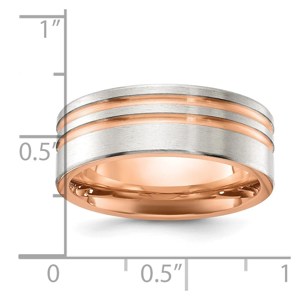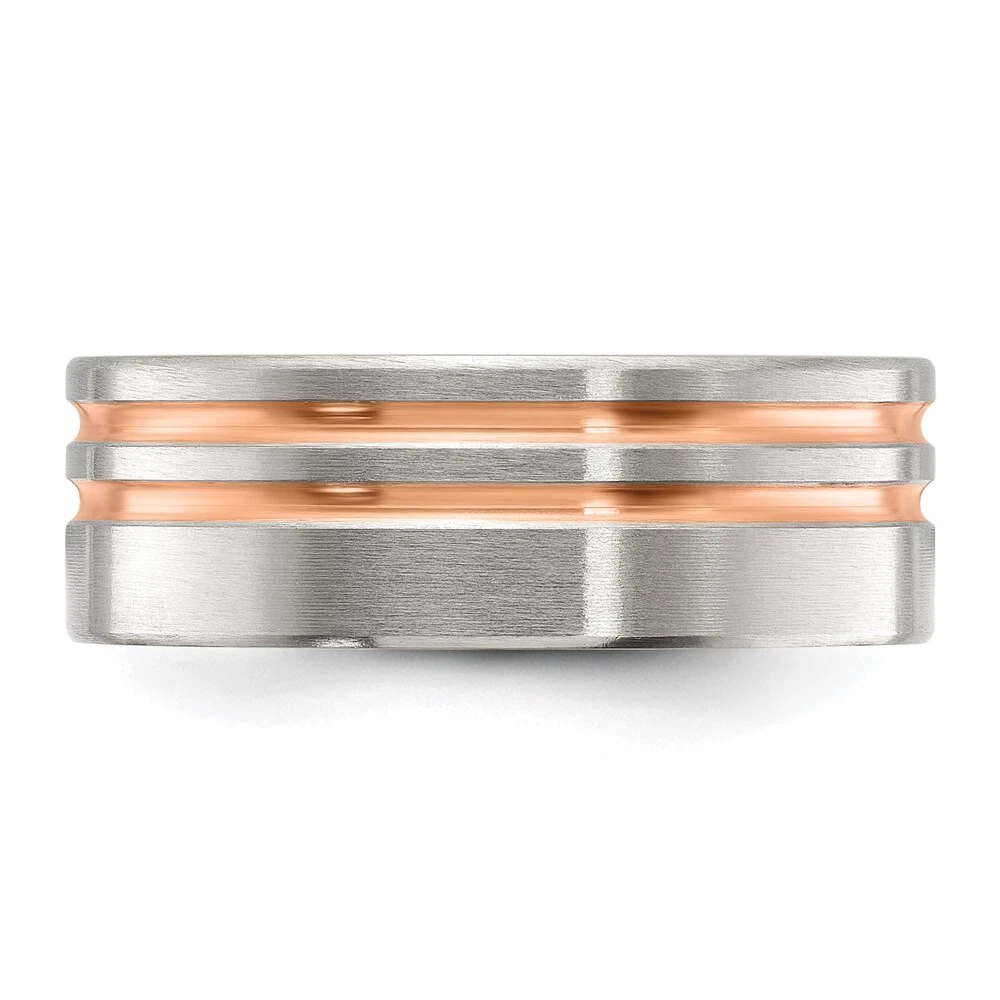 Titanium Brushed and Polished Rose IP-plated Stripes 8mm Band Ring Size 8