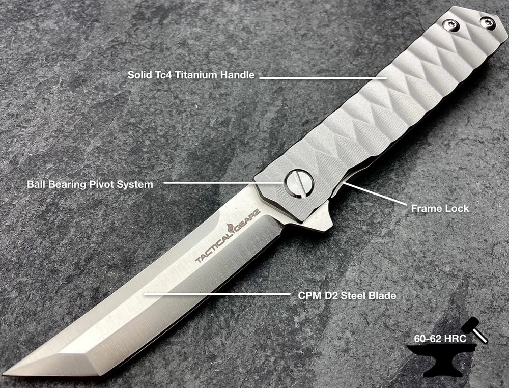 TacticalGearz TG Saint Tanto! Solid Tc4 Titanium Premium EDC Pocket Knife! High Quality Polished D2 Blade! Perfect size for EDC Features Include: Full Tc4 Titanium Handle! Razor Sharp CPM-D2 Tanto Steel Blade! Frame Lock! Titanium Belt Clip, Custom Gift Box & Sheath! Handle Construction: Solid Tc4 Titanium Handle w/Textured Scales for a Tight Grip! Knife features the full strength of Titanium at only 4.41oz! Blade: High Quality CPM-D2 Steel Blade! Features the Tanto Tip, Hardness: 60-62 HRC, Blade thickness: .14", Heat Treatment: Vacuum Blade Length: 3.5", Handle Length: 4.75", Overall Length: 8.25", Weight: 4.41oz, Package includes Custom Gift Box & Nylon Storage Sheath!