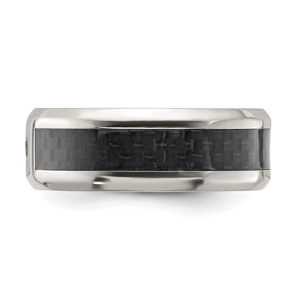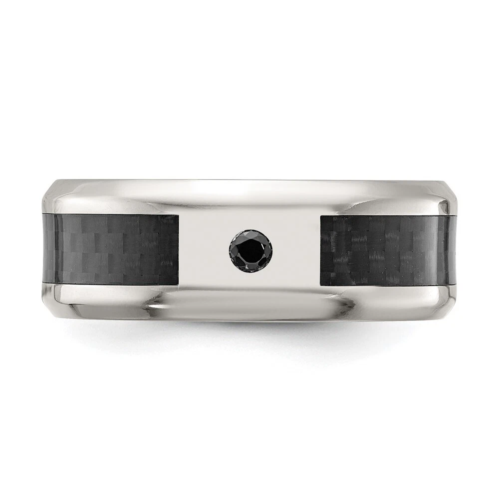Finish:Polished|Stone Type_1:Cubic Zirconia (CZ)|Stone Color_1:Black|Stone Quantity_1:1|Material: Accent Color 1:Black|Band Width:8 mm|Stone Setting_1:Bezel Set|Material: Primary:Titanium|Sizeable:No|Stone Shape_1:Round|Stone Size_1:2.5 mm|Stone Treatment_1:Synthetic|Item Weight U/M:gm|Width of Item:8 mm|Packaging:Gift Pouch|Product Type:Jewelry|Jewelry Type:Rings|Sold By Unit:Each|Gender:Unisex|Material: Inlay:Carbon Fiber|Material: Primary - Color:Grey|Ring Type:Wedding Bands|Edge Type:Beveled|Stone Creation Method_1:Synthetic All weights and measurements are approximate and may vary slightly from the listed information. Welcome to diamond_6720 Payments We accept all Ebay approved payment. Please sent the payment to us within 8 days after the auction has ended, or you will have unpaid case auto open by eBay. Shipping Policy We will ship all items within 1 business days of purchase during the work week (M-F) excluding holidays. If you order on Friday, your order will be shipped the following business day. Tracking will be provided when it becomes available. We will only ship to a PayPal Verified Address. Please make sure your address is current and correct. If the information does not match, your order may be canceled. Buyers are responsible for all customs, duties and taxes for your respective countries. Delivery times for International Shipping will vary. California Buyers Pay 9.0% Tax on all orders. case auto open by eBay. Return Policy & Exchange Returns or Exchange are accepted. Buyer must contact us within 30 days after the item is received. Item must be returned in unworn and resalable condition. We will only issue a refund for the purchase price, excluding any shipping fees. If we are at fault, we will provide a full refund. Buyer is responsible for all return shipping costs. BUYERS FEEDBACK If you have any concerns regarding your purchase, please contact us via eBay Message, we assure you that a satisfactory resolution will be reached. Your feedback is very important to us Do remember to give us 5 star rating(*****) if you are satisfied with our product & service .