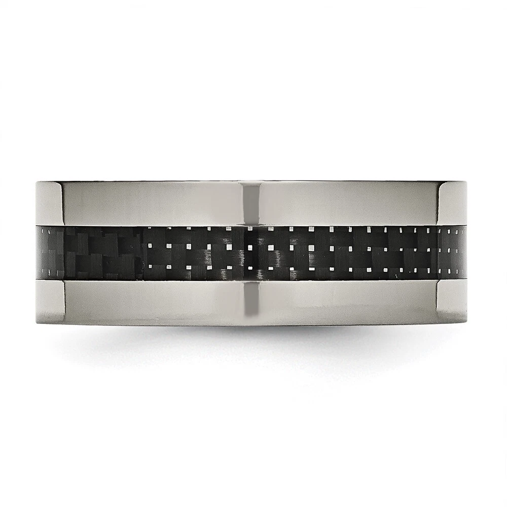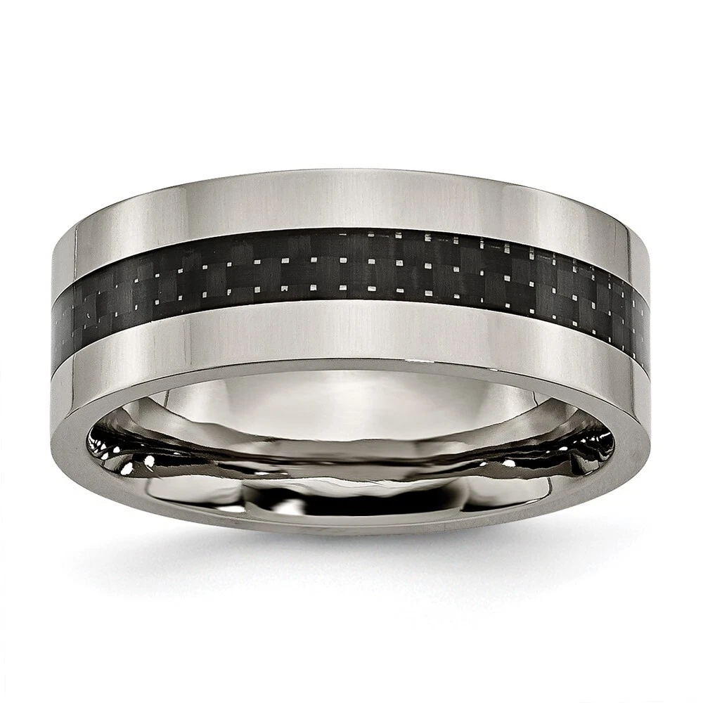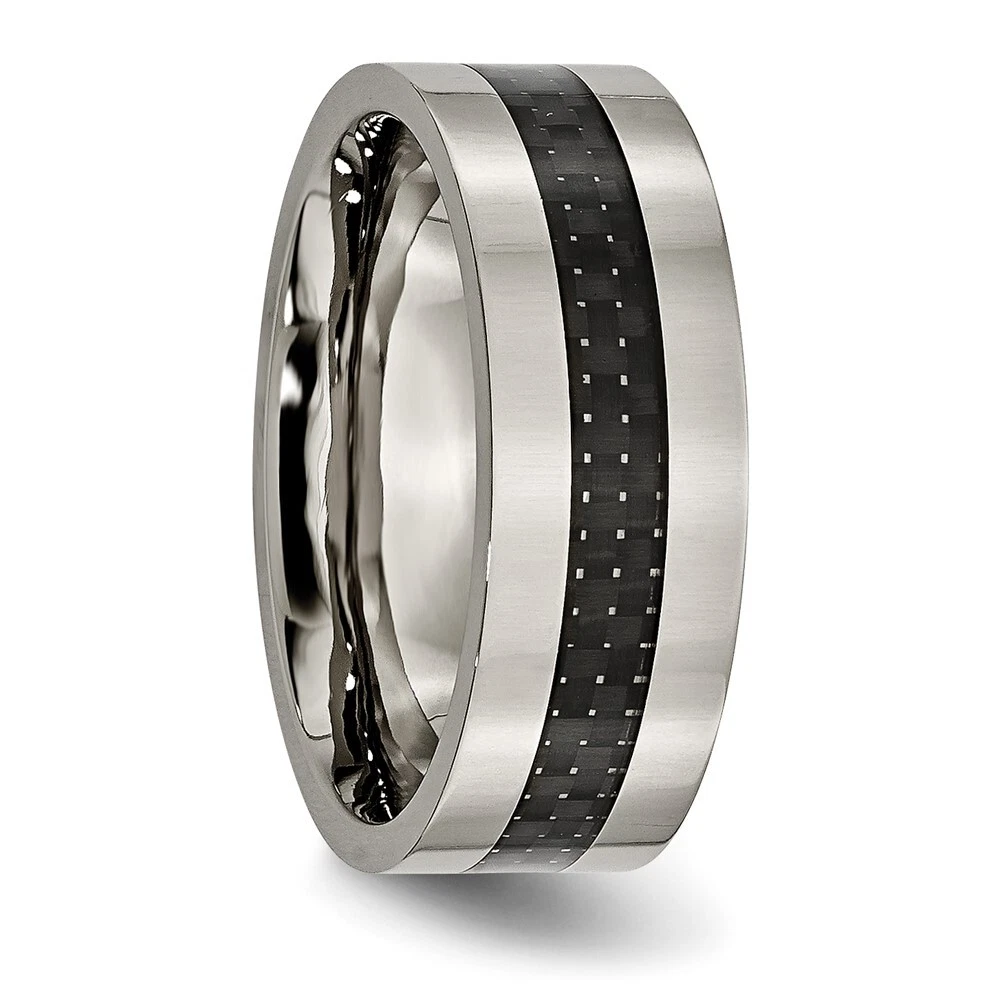 Finish:Polished|Material: Accent Color 1:Black|Band Width:8 mm|Material: Primary:Titanium|Ring Fit:Standard|Sizeable:No|Thickness:< 2 mm|Item Weight U/M:gm|Width of Item:8 mm|Engravable:Yes|Packaging:Gift Pouch|Product Type:Jewelry|Jewelry Type:Rings|Sold By Unit:Each|Gender:Unisex|Material: Inlay:Carbon Fiber|Material: Primary - Color:Grey|Ring Type:Wedding Bands|Edge Type:Flat|Ring Shape:Flat All weights and measurements are approximate and may vary slightly from the listed information. Welcome to diamond_6720 Payments We accept all Ebay approved payment. Please sent the payment to us within 8 days after the auction has ended, or you will have unpaid case auto open by eBay. Shipping Policy We will ship all items within 1 business days of purchase during the work week (M-F) excluding holidays. If you order on Friday, your order will be shipped the following business day. Tracking will be provided when it becomes available. We will only ship to a PayPal Verified Address. Please make sure your address is current and correct. If the information does not match, your order may be canceled. Buyers are responsible for all customs, duties and taxes for your respective countries. Delivery times for International Shipping will vary. California Buyers Pay 9.0% Tax on all orders. case auto open by eBay. Return Policy & Exchange Returns or Exchange are accepted. Buyer must contact us within 30 days after the item is received. Item must be returned in unworn and resalable condition. We will only issue a refund for the purchase price, excluding any shipping fees. If we are at fault, we will provide a full refund. Buyer is responsible for all return shipping costs. BUYERS FEEDBACK If you have any concerns regarding your purchase, please contact us via eBay Message, we assure you that a satisfactory resolution will be reached. Your feedback is very important to us Do remember to give us 5 star rating(*****) if you are satisfied with our product & service .