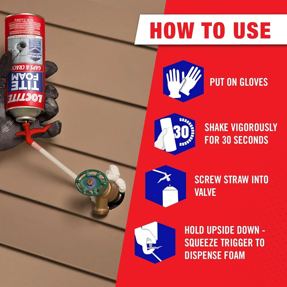 Expands To Fill: Loctite Tite Foam Gaps & Cracks fills, seals, and insulates effectively around gaps and cracks up to 1 inch in size Premium Durability: Polymer foam based on purified and concentrated ingredients withstands harsh UV rays for long-lasting results High Density Foam: Offers high density with a uniform cell structure for durability and overall insulation for your remodeling needs Superior Flexibility: Withstands building and material movement without compromising its seal Strong Adhesion: Sealant bonds to most building materials like wood, concrete, brick, stone, metal, pvc, and more Loctite Tite Foam Gaps & Cracks is a new generation of polyurethane-based insulating foam sealant. It expands to fill, seal, and effectively insulate gaps and cracks up to 1 inch in size, inside and out! Based on purified and concentrated ingredients, it provides premium durability for your insulating needs. Loctite Tite Foam Gaps & Cracks is a bright white color and offers premium durability with its high density, flexibility, strong adhesion and UV resistance. Use to seal out air, moisture and pests in basements or crawlspaces, attic hatches and plumbing, HVAC or electrical penetrations. Quick and convenient to use and apply Tite Foam Gaps & Cracks offers an easy insulating spray foam option. It is recommended for use in both interior and exterior environments and is sandable and paintable.