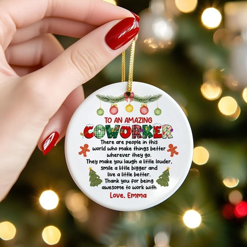 To An Amazing Coworker Ornament, Custom Colleague Christmas Ornament 2024, Thank You Gift For Coworker, Office BFF Ornament If you need to buy more, please inbox us We have two material options (Ceramic & MDF), please read the product description as below to choose your favorite options. MDF Ornaments 1-sided design. Print type: Sublimation printing. Crafted from durable MDF with a high-gloss plastic finish so your designs last a lifetime. Shapes: Round, star, heart and oval . Product Dimensions: Circle & Heart, 2.75” tall; Oval & Star, 3.25” tall. Ships with a festive gold cord for easy hanging. CERAMIC Ornaments 125" (3mm), 2.75" height (circle), thick high-quality porcelain One-sided print Hole for the hanging string Gold-toned string included Available in 4 shapes - Snowflake, Star, Heart and Circle The height of the hole can slightly deviate Shipping, Return and Refund Policy On average, merchandise is produced and shipped from our facility 2-4 business days after purchase. Standard Shipping: 5-7 working days for USA. Please contact us if you have any dissatisfaction with the item you buy so that we give you the solution. It is easier for us to handle your issue if you send us the proof like an image. We can replace another within 30 days without fee if the item is defective, damaged, or an error is made on our end.