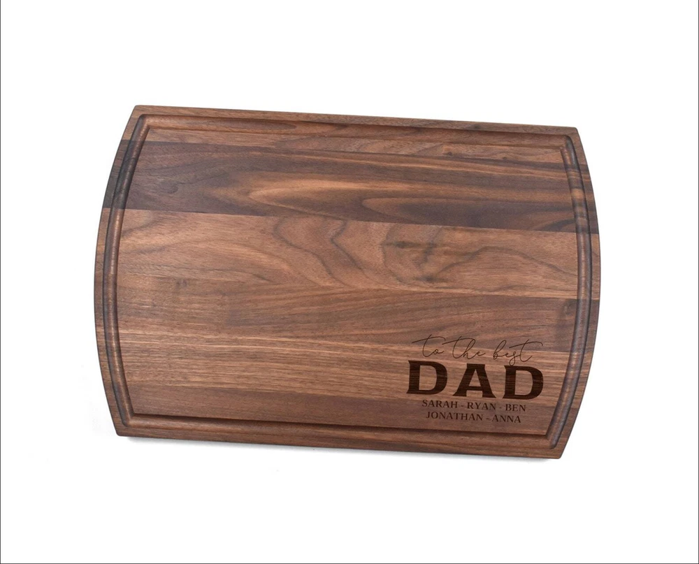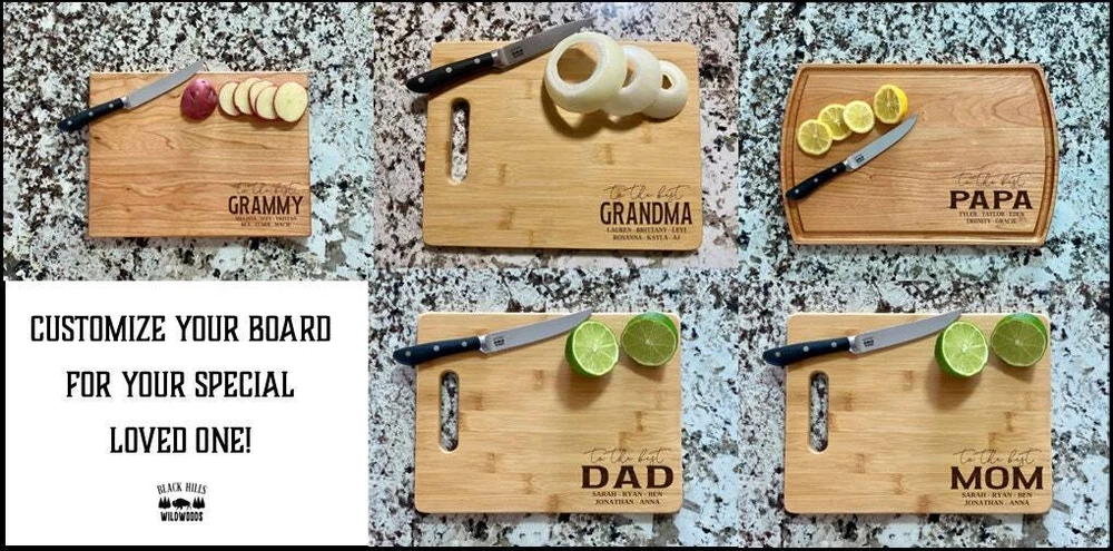 Design: Personalized To The Best Abuelo Cutting Board or Charcuterie Serving Tray All items ship via USPS - please make sure your address is correct :-) Whether used as a charcuterie serving tray for snacks or cutting board, our bamboo, walnut and cherry custom boards are the perfect addition for the home and make the perfect gift for your loved one celebrating a birthday, anniversary, new home, wedding, etc! *** FEATURES *** • SIZES: We have multiple styles and sizes available. To see our current sizes available, click the drop-down menu. The photo slide contains a photo showing each side by side. Please note, the board with the juice groove only has the groove on the front side of the board. • THICKNESS: Bamboo Boards - Approximately 1/2" Thick; Walnut & Cherry Boards - Approximately 3/4” Thick • UNIQUE: Every board is unique with the grain and coloring varying throughout - no board is the same! • CARE INSTRUCTIONS: Hand wash only with warm water. Do not soak. Please apply mineral oil throughout the board’s life. • PERSONALIZATION/CUSTIMIZATION: Do you want the text placed differently on the board? Please don’t hesitate to contact us. All personalization notes can be entered in the personalization box when checking out. • SHIPPING: All cutting boards ship within 2 to 5 business days. • WHOLESALE ORDERS: Please don’t hesitate to contact us for information about wholesale orders. Processing times for larger orders may change. • NOTE: Colors can vary a bit on different monitors and screens. Any props included in photos are not included. Please be sure to double-check your address to make sure it is accurate for USPS delivery. If a package is returned to us due to an invalid address, the buyer is responsible for all additional shipping charges. We appreciate you supporting small business – best wishes! For items ordered with simple edits, we do not send proofs since the layout doesn't change from the example(s). However, in the event there are requests that change the layout from the example(s), we do send proofs for approval before making the product. If you'd like a proof before we make the product, please note so in the personalization box.