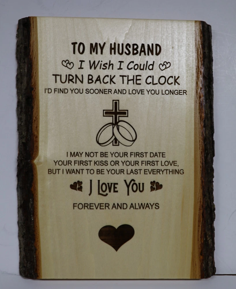 "To my Husband, I wish I could turn back the clock. I'd find you sooner and love you longer. I may not be your first date, your first kiss, or your first love, but I want to be your last everything. I LOVE YOU forever and always" LASER ENGRAVED ON LIVE EDGE BOARD Need one that says To My Wife???? Just let us know, we can do that! These will vary slightly due to differences in wood, and all sizes are approximate due to the nature of the wood. Depth of individual planks is 0.63" Small - Height = 11.00" Width approximately 7.00" to 9.00" (width will vary) These could be displayed in an easel/stand, you could add a hanger to hang on the wall, or a make a base to make a free standing sign. Slight variations may occur due to variations in wood, glass, etc. I would like to gain your 5 STAR FEEDBACK! Please note that I try to give you a very accurate description and the lowest shipping rates that are possible, but I am human, and I do occasionally make a mistake. If you have any problem at all with your order, please email me, or call me, and allow at least 24 hours for me to respond. My contact information should be on the packing slip sent with your order. I will do everything I can, within reason, to resolve the problem as quickly as possible. RETURNS Policy: You must request your return within 30 days, and item must be returned in it's original condition. The original shipping and the return shipping will be at the expense of the buyer unless I have made an obvious error in the listing. NO returns on personalized items.