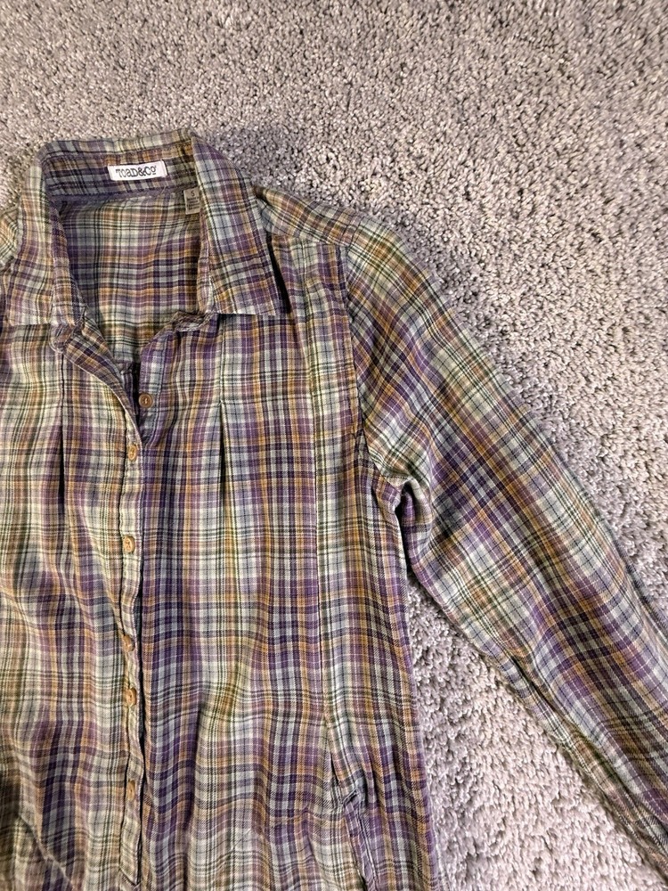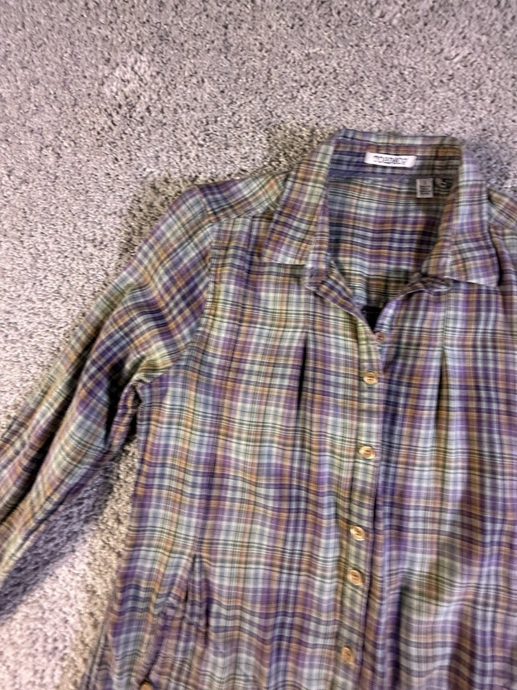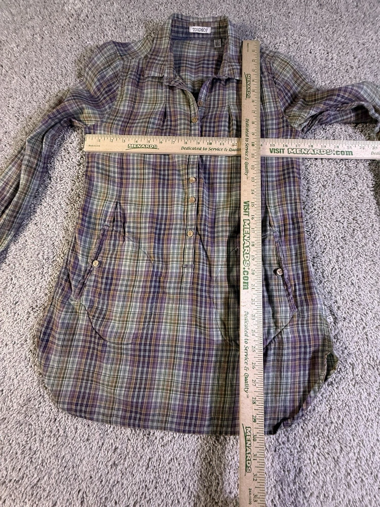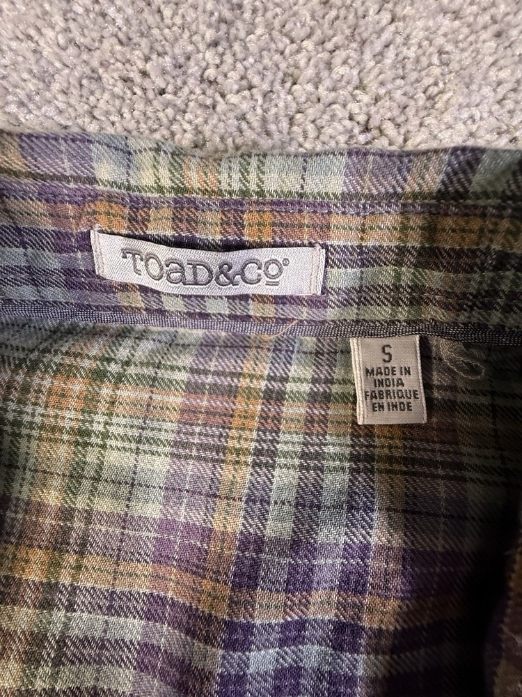 This Toad & Co Women's Long Sleeve Plaid Flannel Button Up Shirt in size Small is a stylish and comfortable addition to any woman's wardrobe. Made of a blend of polyester and cotton flannel, this shirt features a classic collared neckline and button closure. The pleated accents add a touch of flair, making it perfect for casual occasions. The shirt is lightweight, making it ideal for the winter, fall, and spring seasons. With its multicolor plaid pattern, this shirt from Toad&Co is a versatile option for outdoor-themed outfits. 5785