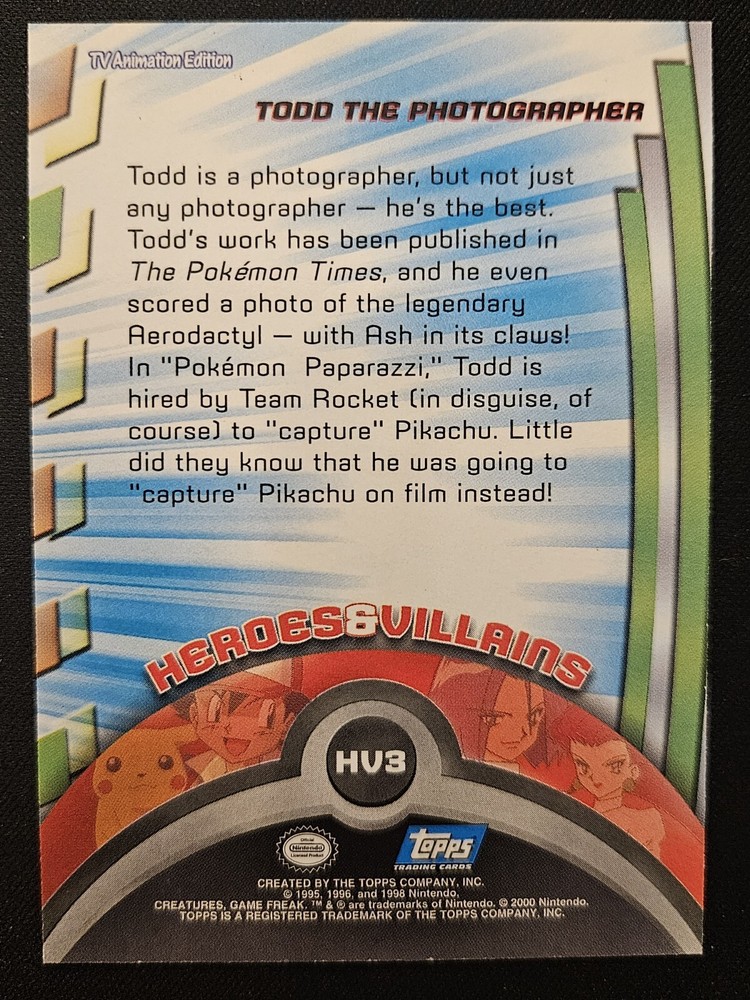 Todd HV3 Topps TV Animation Edition Heroes & Villains Pokémon Trading CG 2000 NM. NM is an estimation. Please see pictures and reach out with any questions before purchase and we would be happy to assist you. Shipping info: All graded cards are shipped securely in bubble mailer and cardboard box; regardless of price. TCG singles/playsets are shipped PWE with tracking when applicable. Single cards will be packaged with penny sleeve, top loader and team bag. Playsets will be penny Sleeved in a Card saver 2. Please note that PWE orders will have fewer tracking updates and may show delivered when scanned through your states/cities sortation center or post office. Final delivery may take up to 5 days after this date to arrive to your home. PWE orders from Puerto Rico need to have The United States listed as your country. Orders with Puerto Rico listed as the country cannot be shipped and may be cancelled. Please reach out with any concerns before contacting ebay and we'd be happy to assist you. Please note that due to inventory accuracy, purchases will not be cancelled before or after shipping. Please reach out with any questions before purchase and we would be happy to assist you.