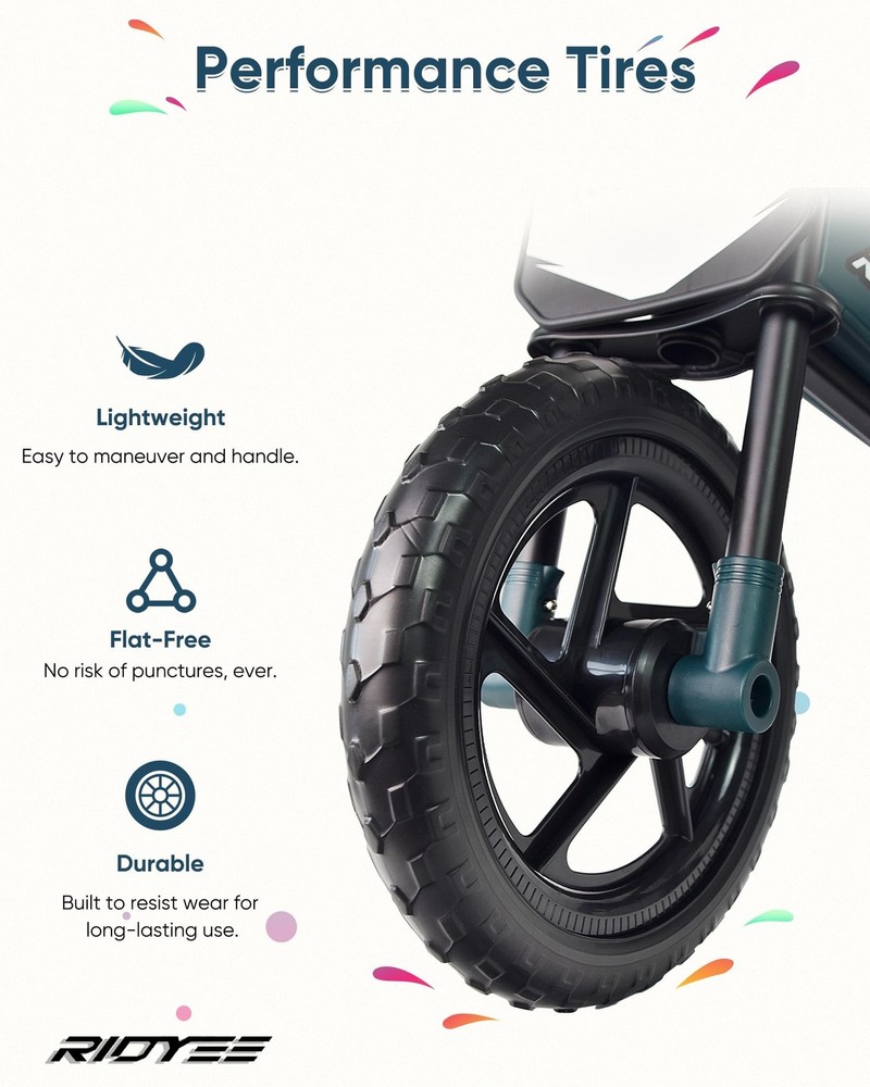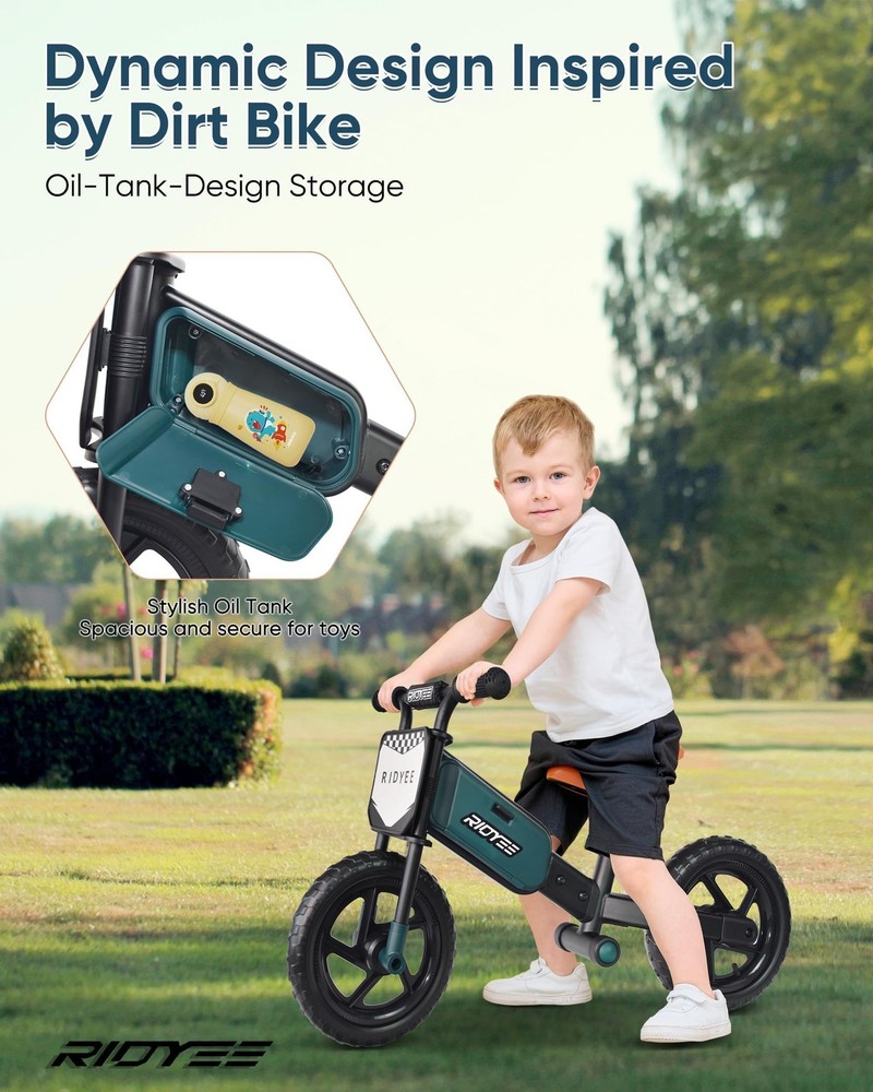 Toddler Balance Bike 2 Year Old, Kids Balance Bike for 2 to 5 Year with Tool-Free Adjustment, Limited Steering, Footrest, Custom Name Plate with Stickers, Gift Bike for 2-3 Boys Product Details Color: GreenSport Brand: RIDYEE UPC: 850063575256 EAN: 0850063575256 MPN: Does not apply Bike Type: Balance Bike Age Range (Description): Kids Brand: RIDYEE Number of Speeds: 1 Color: GreenSport Wheel Size: 12 Inches Frame Material: Carbon Steel Suspension Type: Rigid Special Feature: Handlebar Cover, Anti-Slip Grip, Adjustable Shock-Absorbing Seat, Racing Frame, Customizable Front Plate See more Included Components: Balance Bike, DIY Plate and Stickers Bike Type: Balance Bike Age Range (Description): Kids Brand: RIDYEE Number of Speeds: 1 Color: GreenSport Wheel Size: 12 Inches Frame Material: Carbon Steel Suspension Type: Rigid Special Feature: Handlebar Cover, Anti-Slip Grip, Adjustable Shock-Absorbing Seat, Racing Frame, Customizable Front Plate Included Components: Balance Bike, DIY Plate and Stickers Size: Standard Brake Style: Coaster Specific Uses For Product: Trail Model Name: RIDYEE Kids Balance Bike Power Source: Pedal power Wheel Material: Ethylene Vinyl Acetate (EVA) Warranty Type: Manufacture Assembly Required: No Minimum User Height: 13 Inches UPC: 850063575256 Manufacturer: RIDYEE Item Package Dimensions L x W x H: 17.2 x 13.03 x 7.52 inches Package Weight: 4.56 Kilograms Brand Name: RIDYEE Material: Carbon Steel Date First Available: January 15, 2024 Cool Balance Bike: The RIDYEE balance bike boasts an advanced and stylish exterior, inspired by the look of sand motocross bikes. Built with a sturdy carbon steel frame, it combines a powerful, sporty design with an off-road concept, making it the perfect adventure companion for little riders. Perfect for Growing Kids Aged 2 to 5: Every detail of this bike is crafted with 2 to 5 year olds in mind. The adjustable seat ranges from 13.4 inches to 15.8 inches and can be easily adjusted without tools, catering to different ages and ensuring a comfortable fit as they grow. Customizable Design: This balance bike comes with a customizable plate and three sets of letter and number stickers, letting kids personalize their ride. DIY stickers boost creativity and motor skills, making the bike uniquely theirs in a fun, hands-on way. Safe Riding Experience: The toddler balance bike for 3 year olds features a safety angle limit, shock-absorbing seat, and all-terrain tires for smooth rides. Ideal for indoor and outdoor use, it ensures safety, comfort, and peace of mind. Perfect Choice for Kids: This toddler bike 3-5 helps children develop essential skills like balance and leg strength, making it a thoughtful and beneficial choice for 2 year old boys and girls. RIDYEE Kids Balance Bike 2 Year Old, Toddler Balance Bikes for 2 to 5 Year with Adjustable Shock-Absorbing Seat , Balance Bike 3 Year Old, DIY Stickers, Handlebar Pad, Limited Steering