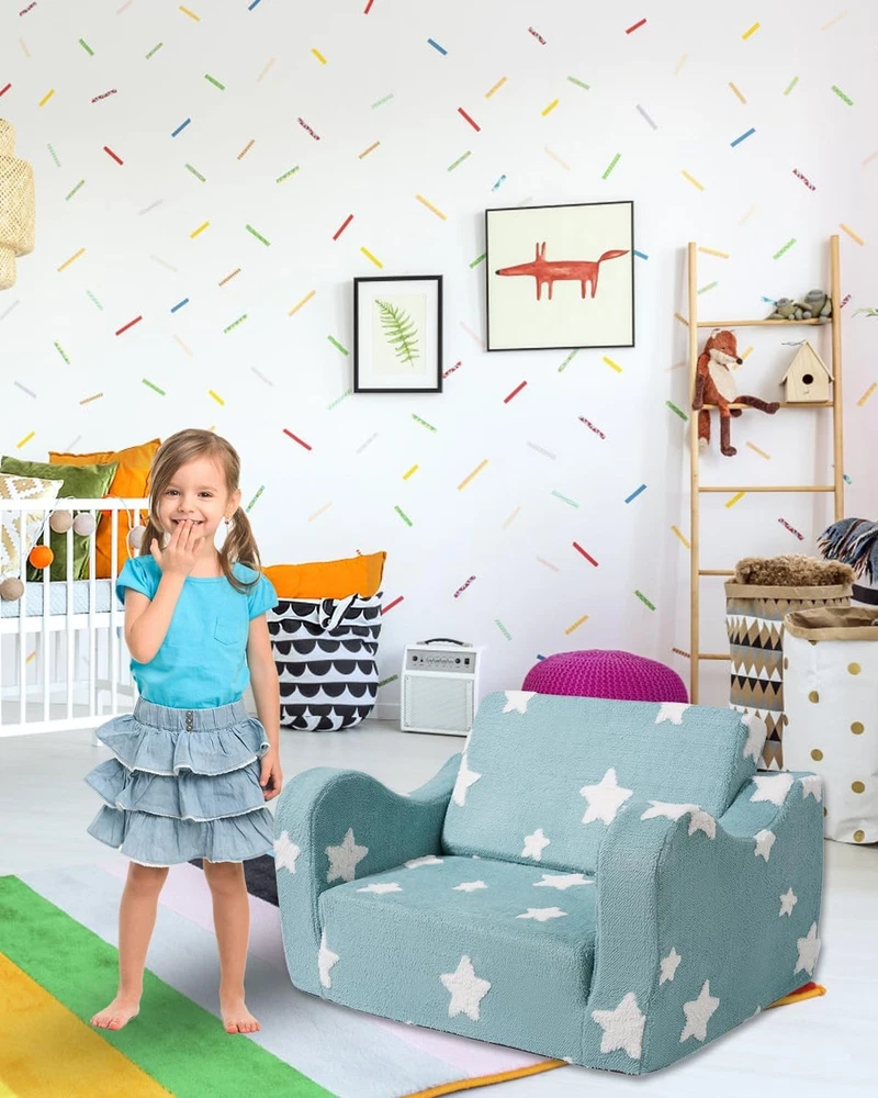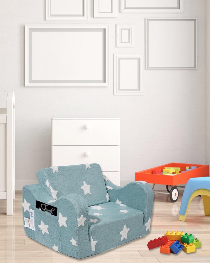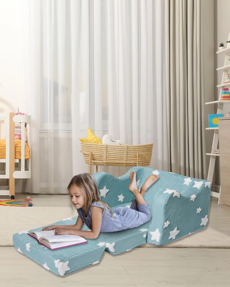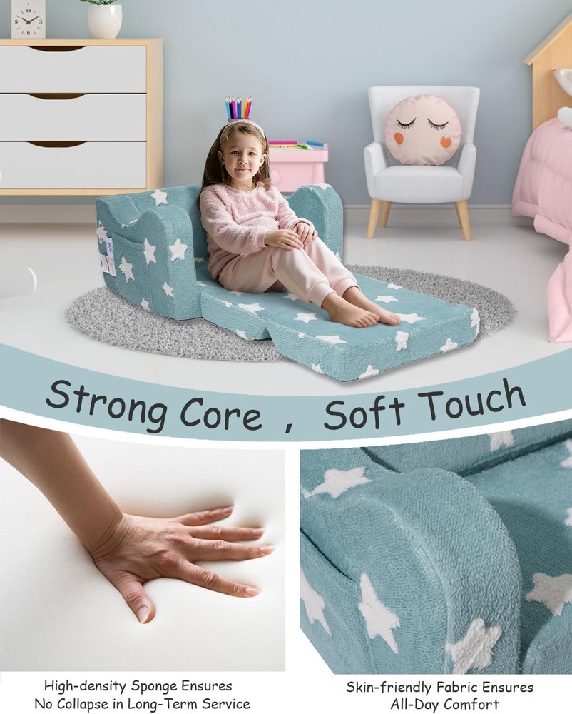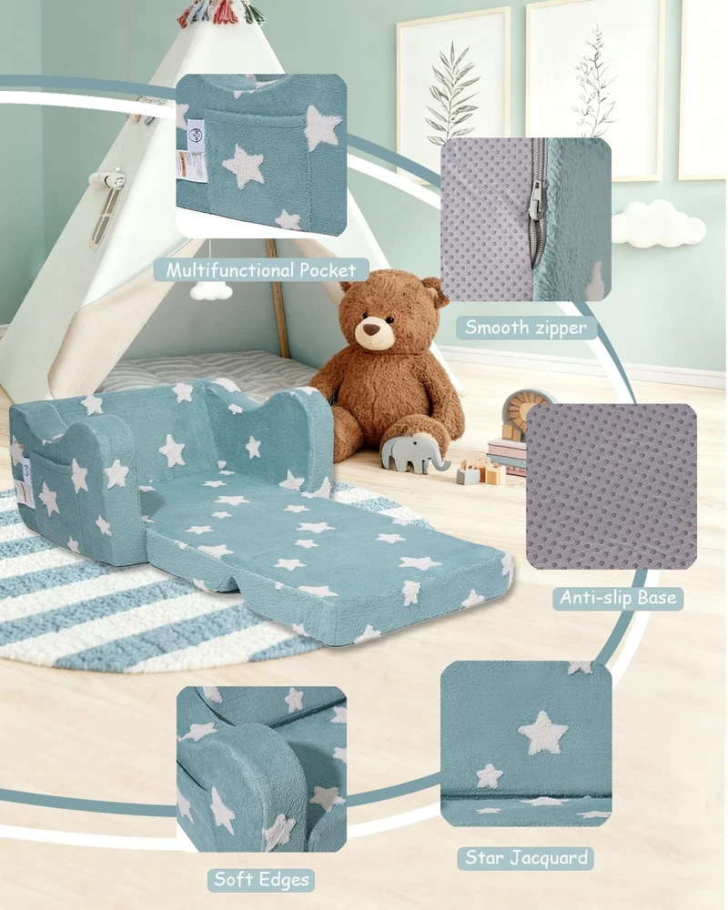 2-IN-1 REVERSIBLE DESIGN: Transform this toddler couch from a cozy sofa to a flat lounger in seconds! Perfect for reading, gaming, or napping, making it ideal for playrooms, bedrooms, and daycare centers. PREMIUM SUPPORT & COMFORT: High-density foam filling provides firm yet comfortable support for kids aged 1-6, while the plush star-embossed fabric ensures softness and durability. No sagging or collapsing! SAFE & PRACTICAL FEATURES: Non-slip bottom prevents sliding during play, rounded edges protect against bumps, and the side pocket stores books or toys—keeping spaces organized and safe for toddlers. LIGHTWEIGHT & EASY TO MOVE: So light that even your little one can carry it! Empowers kids to move their favorite couch between the living room and playroom effortlessly, fostering independence and making clean-up time a breeze. MACHINE WASHABLE & EASY CLEAN: Remove spills and stains effortlessly! The detachable cover is machine washable, saving parents time and keeping the toddler couches that fold out hygienic for daily use. Product description