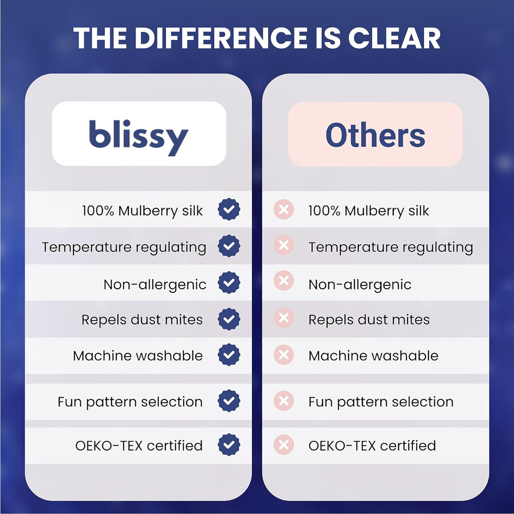 22-MOMME 6A GRADE MULBERRY FIBERS: Blissy Silk Pillowcases are handmade and crafted from high quality 22 Momme 100% Pure Mulberry Silk. We have spent countless hours prototyping, testing and using our products to ensure the highest quality and durability. BETTER & COOLER SLEEP: The temperature regulating properties of the Blissy silk pillowcase allows your little ones to keep cool at all times during the night without the discomfort associated with fluctuating temperature and the constant tossing and turning for a restful night sleep. SKIN-FRIENDLY SOLUTION: While cotton is a veritable breeding ground for allergens, silk is totally hypoallergenic -- which means your kids can start waking up with clearer sinuses, dry eyes, and easy breathing. If they have sensitive skin, you’ll also notice less redness, puffiness, and blemishes when sleeping on a hypoallergenic surface like silk. EASY CARE: Machine washable and available in an array of colors and patterns, our silk pillowcase lets your child express their personality while staying effortlessly fresh and clean. TRUSTED QUALITY: Blissy's OEKO-TEX Standard 100 Label ensures that our silk pillowcases are safe, eco-friendly, and non-toxic, providing peace of mind for both you and your child. Product description