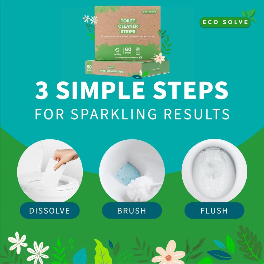 Introducing Toilet Cleaner Strips – the quick and easy solution for a sparkling clean and fresh-smelling toilet bowl. With our all-natural, concentrated cleaning formula, toilet cleaning has never been easier or more eco-friendly. Say goodbye to splashing, squirting, and messy cleanup, and say hello to a hassle-free cleaning experience. Our toilet cleaner strips are designed for convenience and functionality. Simply place a strip into your toilet bowl, wait 20 seconds for it to dissolve, scrub the bowl thoroughly, and flush. It's that simple! The concentrated formula of our strips ensures effective stain removal and odor elimination, leaving your toilet bowl looking and smelling fresh. We take pride in our commitment to the environment. Our toilet cleaner strips are biodegradable, septic safe, and plastic-free. We believe in a sustainable future, which is why our products are made with non-toxic, cruelty-free, and vegan ingredients. Rest assured, there are no harsh chemicals, chlorine, or bleach in our formula. It's safe for you and the planet. Not only are our toilet cleaner strips safe to use, but they are also convenient for any situation. Lightweight and compact, you can take them with you wherever you go. Whether you're at home, in a college dorm, on vacation, or even in a public restroom, our eco-friendly strips will provide a thorough clean without the need for liquids, tablets, powders, pods, or messy chemicals. Our eco-friendly toilet cleaning strips are suitable for use in any toilet. From your own bathroom to hotels, RVs, cabins, and public restrooms, you can count on our product to deliver outstanding cleaning performance. Best of all, there's no cleanup required. Simply use, flush, and enjoy a fresh toilet bowl. Make a conscious choice for the environment without compromising on cleanliness. Choose Toilet Cleaner Strips for a quick, easy, and eco-friendly way to keep your toilet bowl spotless and fresh. QUICK & EASY CLEANING: Our toilet cleaner strips are made using an all-natural, concentrated cleaning formula. Simply place a strip into your toilet bowl, wait 60 seconds for the strip to dissolve, scrub the toilet bowl thoroughly, and flush! NO splashing, NO squirting, NO mess! toilet cleaning strips will remove stains and deodorize your toilet bowl. ECO-FRIENDLY: We take pride in our environmental stewardship by creating products that support a sustainable future. Our toilet cleaner strips are Biodegradable, Septic Safe, Plastic-Free, Non-Toxic, Cruelty-Free, and Vegan. No Chlorine, No Bleach. Our packaging is Plastic-Free and made of 100% recyclable material. It is 100% Zero Waste, Septic, and Gray Water Friendly. SAFE TO USE: Our toilet bowl cleaner strips are made with a 100% natural formula without containing any harsh chemicals. They are non-toxic, bleach-free, chlorine-free, and non-corrosive for a safe and easy cleaning experience. These toilet cleaner strips are fast and safe for a simple cleaning experience. The toilet cleaner strips are for toilet bowl cleaning only. Do not consume. CONVENIENT: The toilet cleaner strips are designed for convenience and functionality. You can keep a fresh toilet anywhere you go without the need for liquids, tablets, powders, pods, or messy chemicals. These toilet strips are lightweight, compact, and easy to take on the go. CLEAN ANYWHERE: Our eco-friendly toilet cleaning strips are suitable to use in any toilet and are perfect for cleaning and deodorizing wherever you go. Use at home, apartment, college dorm, vacation rental, hotel, RV, cabin, public restrooms, etc. This is a natural toilet bowl cleaner that requires no cleanup. : At , we are committed to providing sustainable household solutions, including eco-friendly cleaning products. Follow our brand to stay up to date on new product releases!