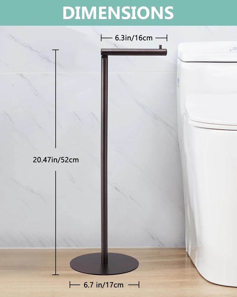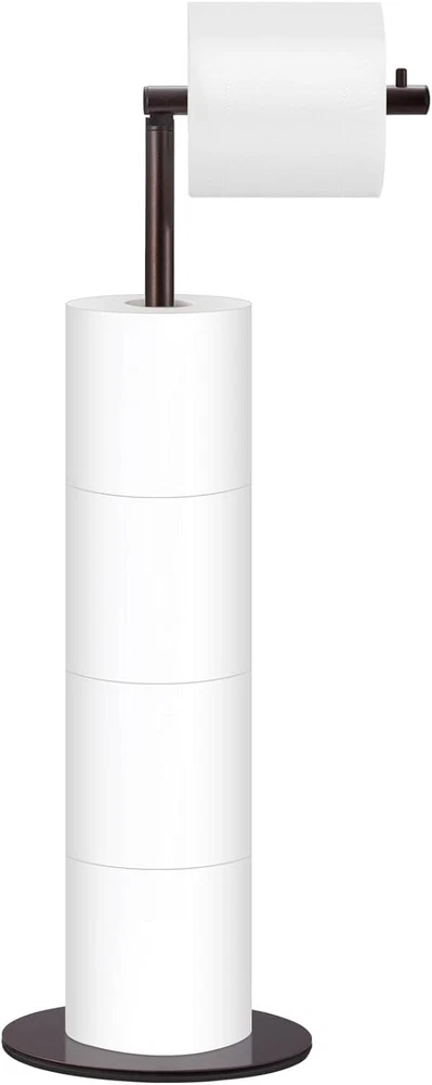 Toilet Paper Holder Stand, Free Standing Toilet Paper Roll Holder for 4 Spare Rolls, Modern Bathroom Toilet Paper Stand with Reserve, Oil Rubbed Bronze, Housen Solutions Material Metal Finish Type Oil Color Oil Rubbed Bronze Installation Type Free Standing About this item SPACE SAVING - This toilet paper holder stand can hold 1 dispense and 4 spare tissue rolls, which helps free up cabinet storage. Besides, the short pin at the end of the rob can keep paper rolls in place to prevent it from falling off. Dimensions: 6.7" W x 6.7" L x 22.47" H. FITS MOST PAPER ROLLS - The toilet paper holder stand is designed to applicable for Jumbo, Mega, Double and Regular size of paper rolls. With the free standing design, you can easily place the toilet paper holder anywhere. FUNCTIONAL PAPER STORAGE - Put the L shaped arm down to use as a toilet paper holder for up to 5 paper rolls. When you have more paper rolls to store, pull the rob up and use it as a toilet paper storage for up to 6-7 rolls of paper at the same time. Save your space and keep your bathroom in order. QUALITY MATERIAL - The freestanding toilet paper holder is made of metal with oil rubbed bronze coating, which protects the toilet paper roll holder from rust and corrosion. It is suitable for humid environments such as bathroom and kitchen. ANTI SLIP PAD - The base is equipped with anti slip EVA pad (already attached), which can prevent the toilet holder stand from moving easily and prevent scratches on the floor. The 20 inch high tissue holder allows both children and adults to easily access paper rolls. EASY TO INSTALL - No drilling and no tools needed! Just connect the bathroom toilet paper holder to the base and tighten the screws. Installation can be completed within 3 minutes. Minimalist design perfectly matches the style of your house, bathroom, kitchen, and RV.