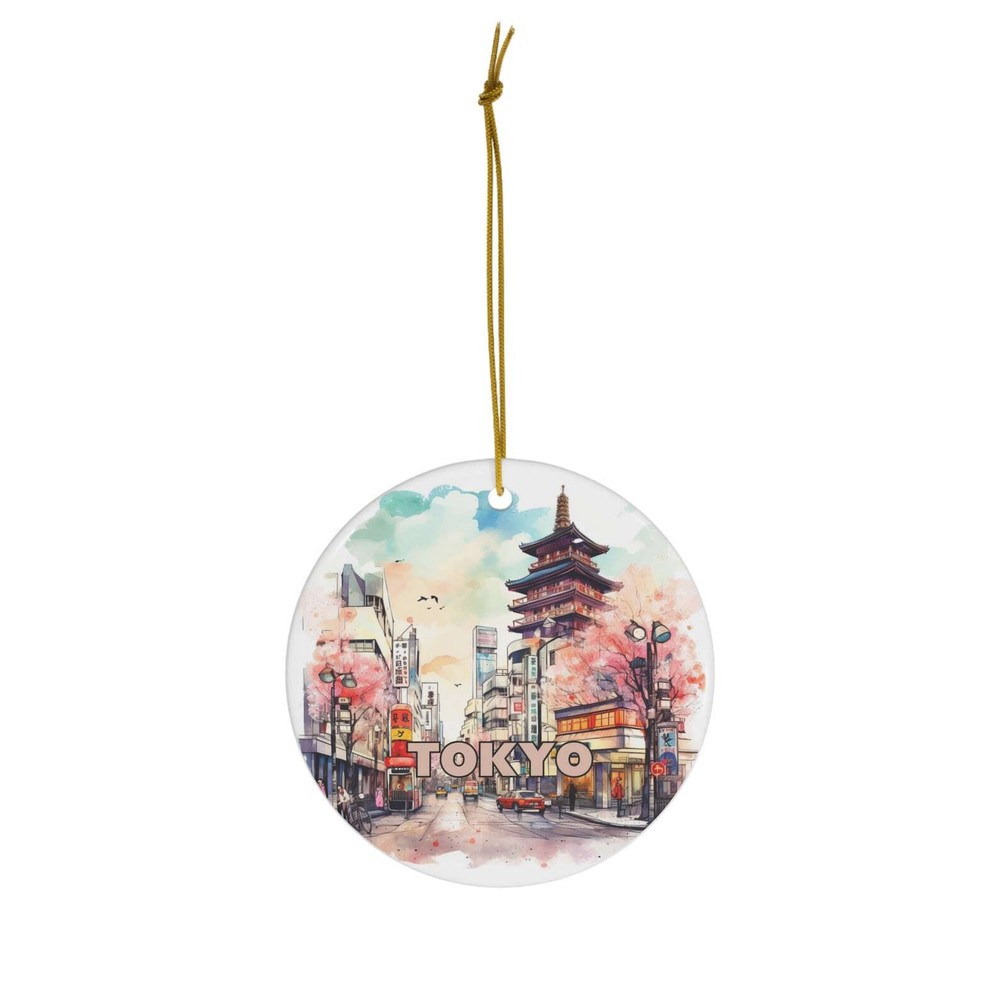 Tokyo Ornament Japan Vacation Gift Ceramic Christmas Tree Ornament Honeymoon Vacay Travel Gift Material: Ceramic Color: White Shapes: Circle, star, heart and oval Can be printed on both sides Imprint full-color artwork, photos, or logos Hole for hanging string and hanging string included Printed in the USA
