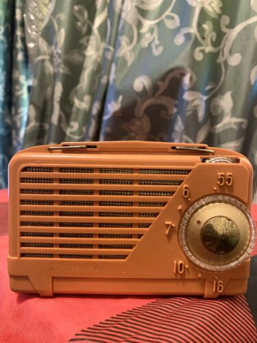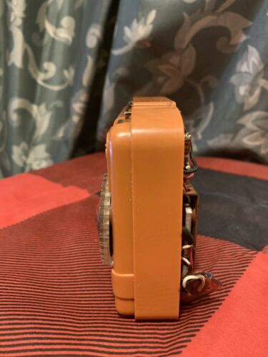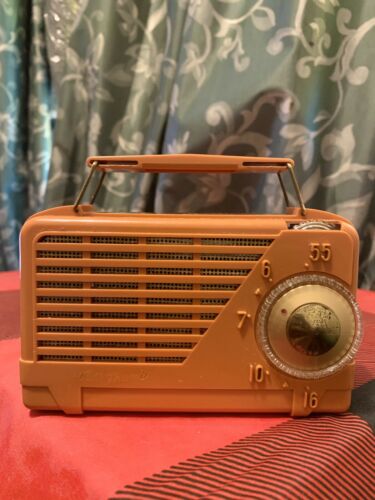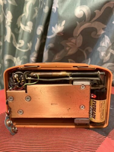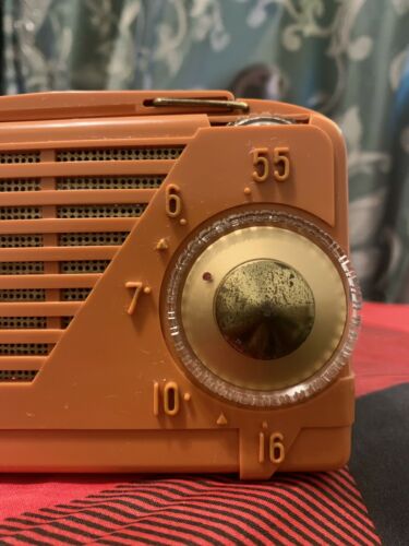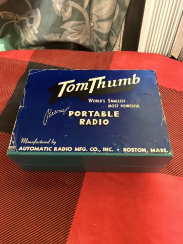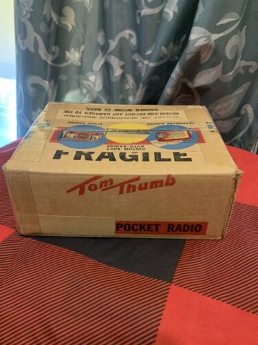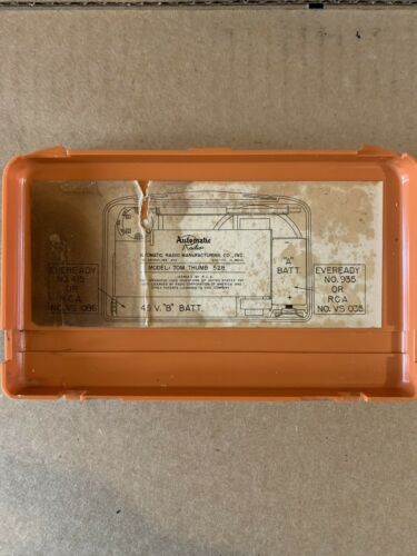 Tom Thumb 528 Rare Orange Subminiature tube hydrid Highly Collectible personal radio. Up for auction This 1956-58 made in U.S. Beautiful orange colored Tom Thumb 528 subminiature tube hybrid radio is a very rare . Hard to find this color- and working . It tunes to several stations with volume.This hybrid/transistor radio is operated on 3 small radio tubes & 2 transistors concept. These doesn’t have sound quality of the multiple transistor radio. But these small tube radios are highly sought after(for vintage radio collection)- but hard to obtain, especially in playing mode.This radio plays good considering the hybrid technology. looks great cosmetically, has no cracks or chips, is clean, tuning dial works. Note: The Tom Thumb label (see photo 7) is partially faded but still can be seen This is a great addition to a vintage radio collection.This radio takes 1 expensive ! 45 V. B battery ( about $40.00)that has to be purchased on line) that I will supply and include in my price. And also a regular C cell battery s5.00 also included. Original Tom Thumb box/case and product info. included. If you have any questions feel free to contact me-and thank you for your consideration!