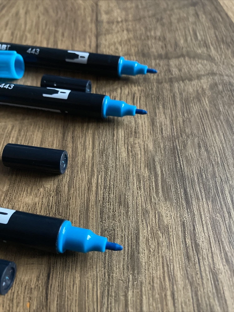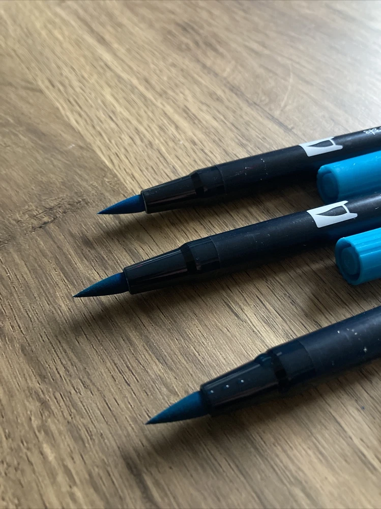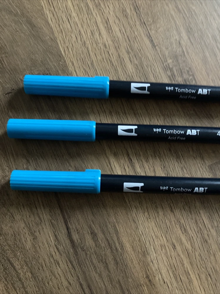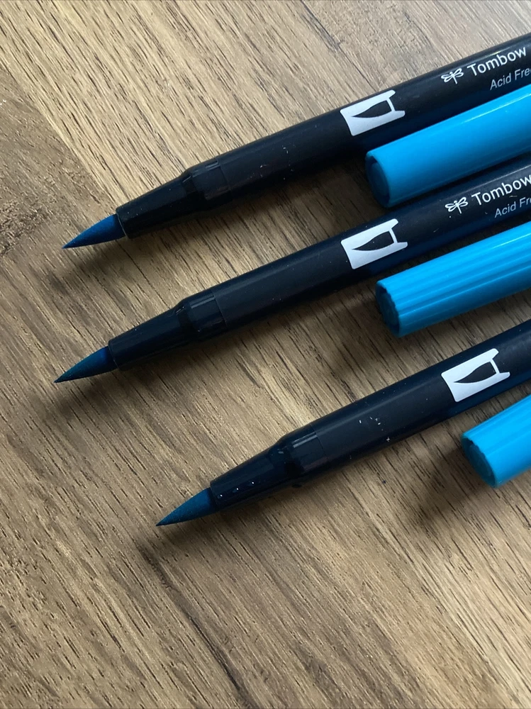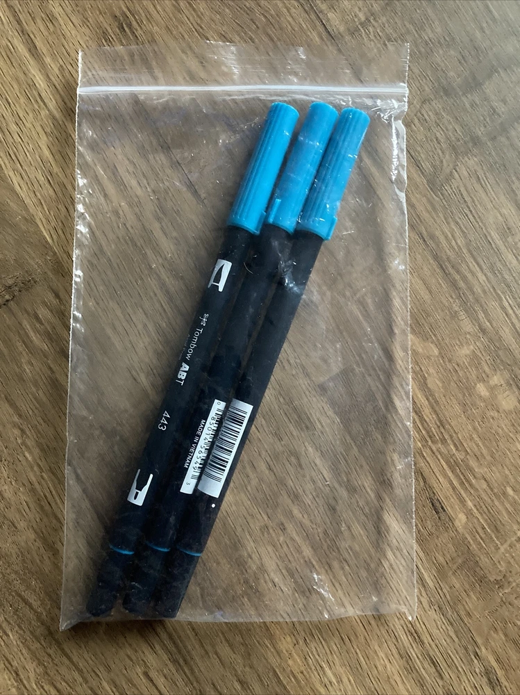 Tombow ABT Acid Free Dual Ended TURQUOISE Brush Pen, N: 443 ( PKT 3 PENS ), BRAND NEW. These are Water based and therefore have odourless ink. Also Water-soluble. Acid Free and Non-Toxic. Easy to blend and non-bleed. Water-based, water-soluble and odourless ink. Blend effortlessly like watercolour paints. With a fine tip one end for consistent lines and tight drawings and all work that needs precise lines and writing, Borders and much much more, the other end is the bigger, flexible, brush-like tip ideal for Fine, Medium and Bold lines and much much more. Tombow's ABT Dual Brush Pens work just like watercolour paints and blend effortlessly. They are fantastic to use for rubber-stamping, card-making, Sketching, Illustrating and of course as watercolours. The bigger brush tip is highly flexible like a brush - durable, tough and yet soft. Tombow's ABT Dual Brush Pens are loved by comic designers and graphic designers amongst others. Available in 96 different colours. PKT 3 TOMBOW ABT ACID FREE DUAL END TURQUOISE BRUSH PENS, N: 443, BRAND NEW.