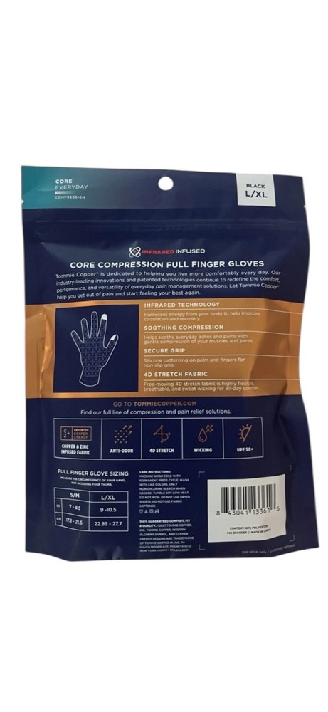 Tommie Copper Infrared Compression Gloves Full Finger Pain Relief L/XL.