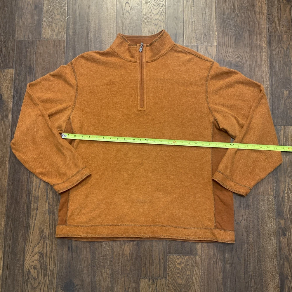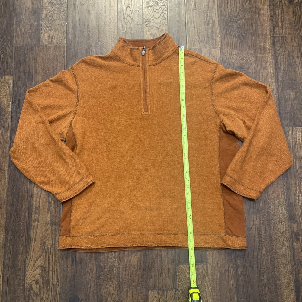The Tommy Bahama 1/4 Zip Pullover Sweater in XL size is a stylish and versatile piece for men. Made from a soft cotton blend fabric in a burnt orange color, this sweater features a mock neck neckline and a tight-knit design. The sweater is adorned with embroidered logos and is perfect for various occasions such as travel, parties, casual outings, and business meetings. With its classic outdoor theme and comfortable fit, this sweater is ideal for activities like walking, golf, and hiking, making it a practical and fashionable choice for any man's wardrobe.