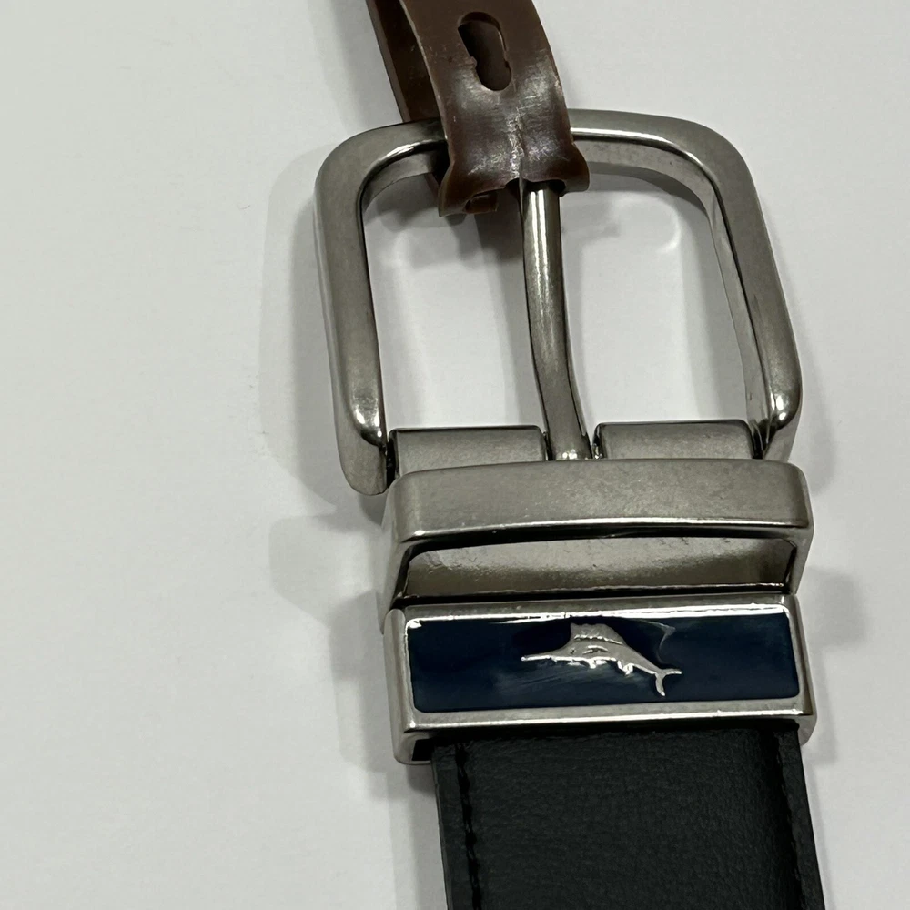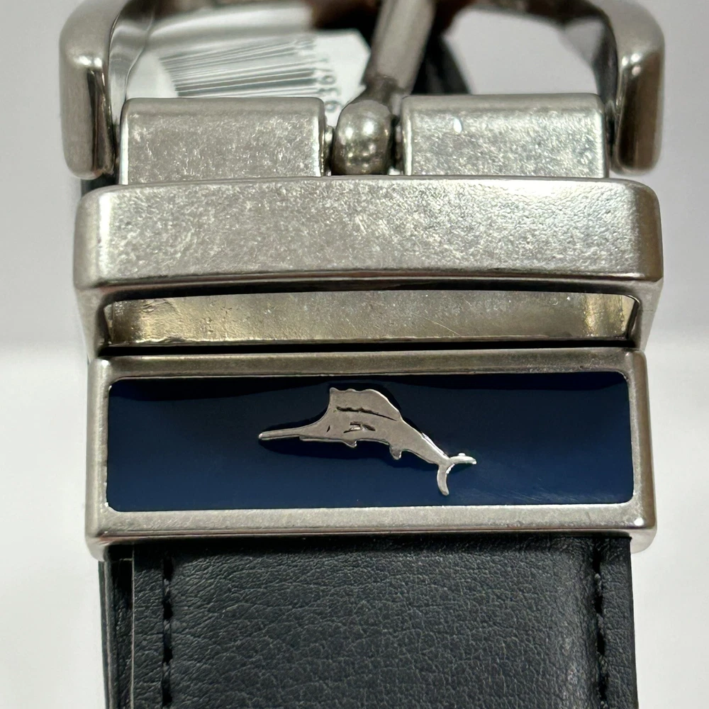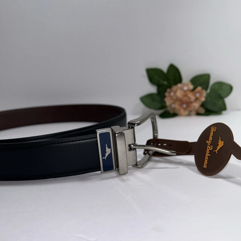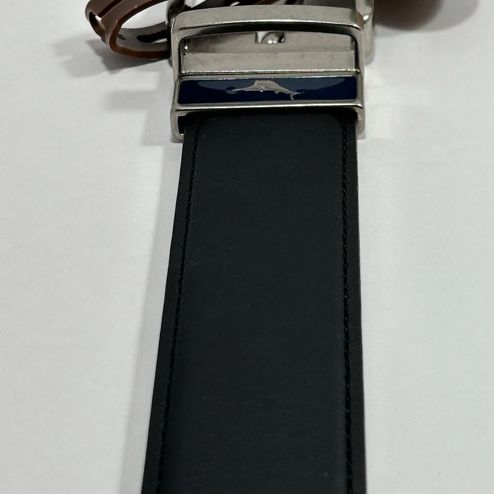 This Tommy Bahama Men's Reversible Black/Brown Leather Belt, size Large new with tags, will elevate your look. This belt is new with tag. While taking photos I notice that it has air bubbles on the blue paint as seen the last photos. As shown in the photos depending on the angel you stand you might notice the air bubble. This is a manufactured defect. If you need more photos or any questions send me a message .