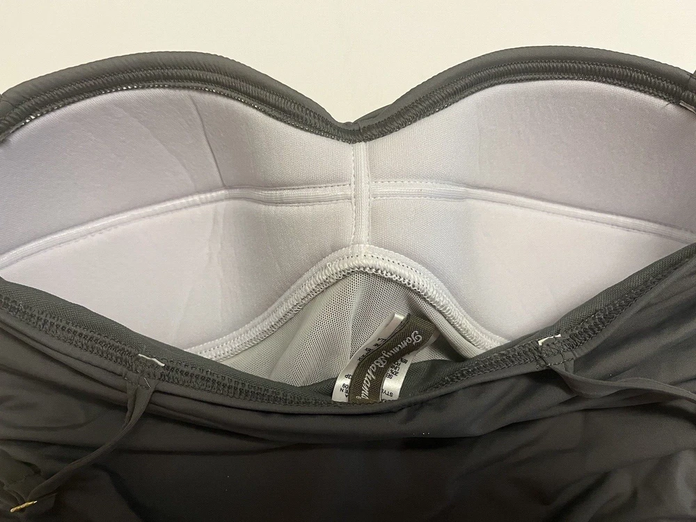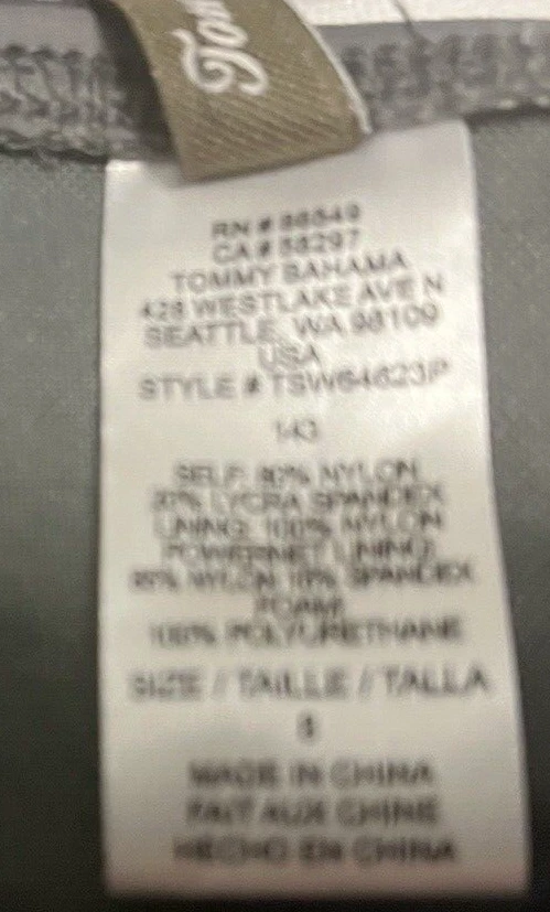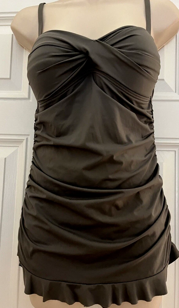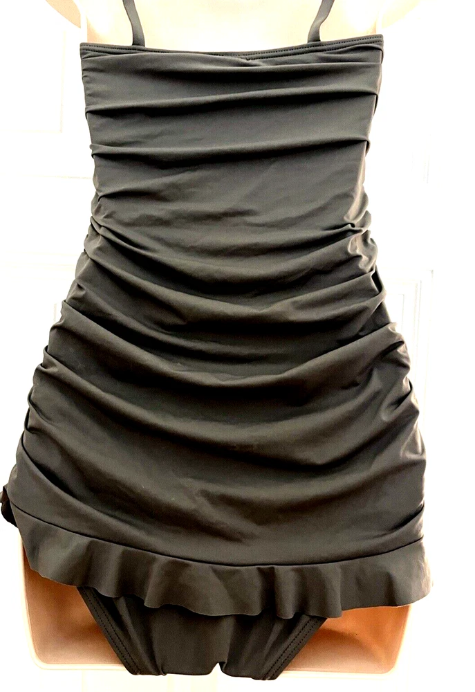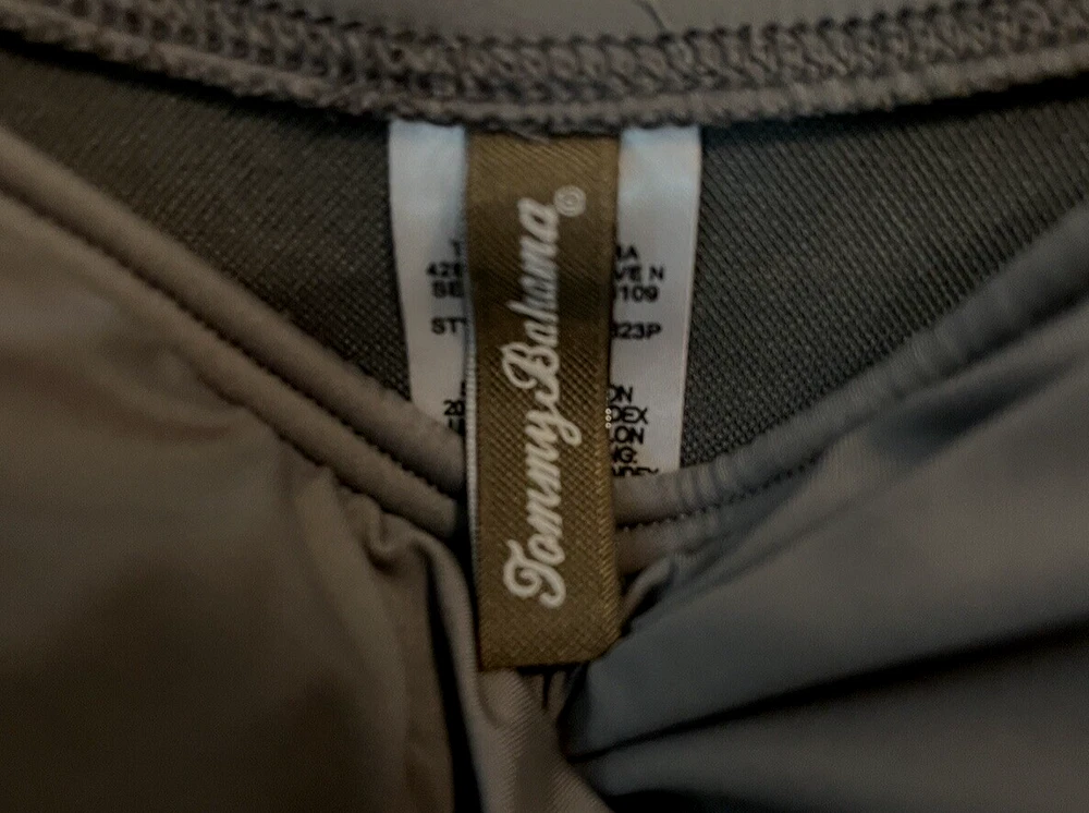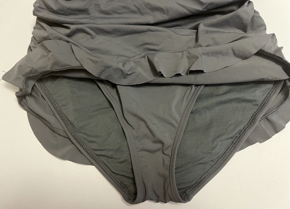 Tommy Bahama Women's Swimsuit Gray 1 Piece Twist Top Skirted Ruffled Size 8 Tall Tommy Bahama Women's Swimsuit is a gray one-piece with a twist top, regular straps, and a skirted ruffled bottom. The swimsuit is made of nylon and spandex material and has a padded cup size. It is designed with adjustable straps and is suitable for hand wash only. The swimsuit is available in size 8 tall and is perfect for beach