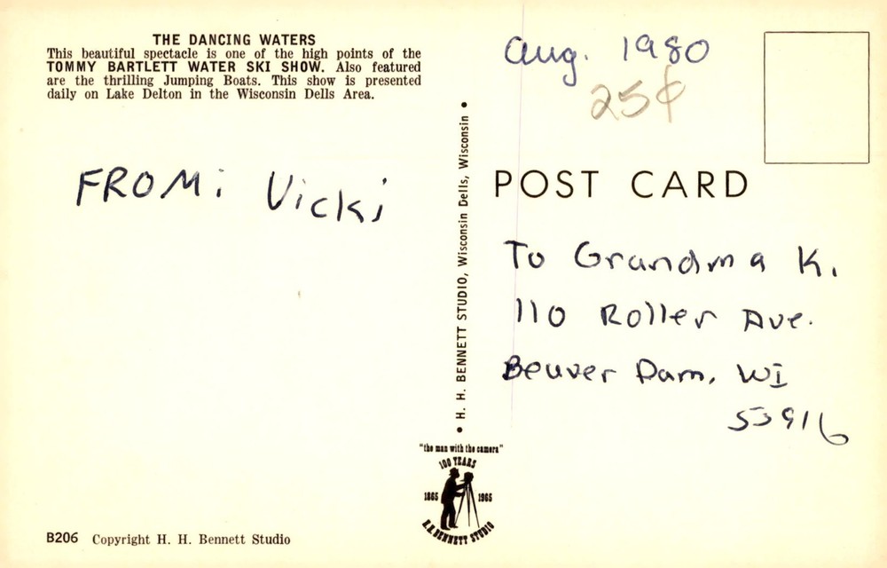 Experience the mesmerizing Dancing Waters and thrilling Jumping Boats at the Tommy Bartlett Water Ski Show on Lake Delton. This postcard showcases H. H. Bennett Studio's iconic photography.