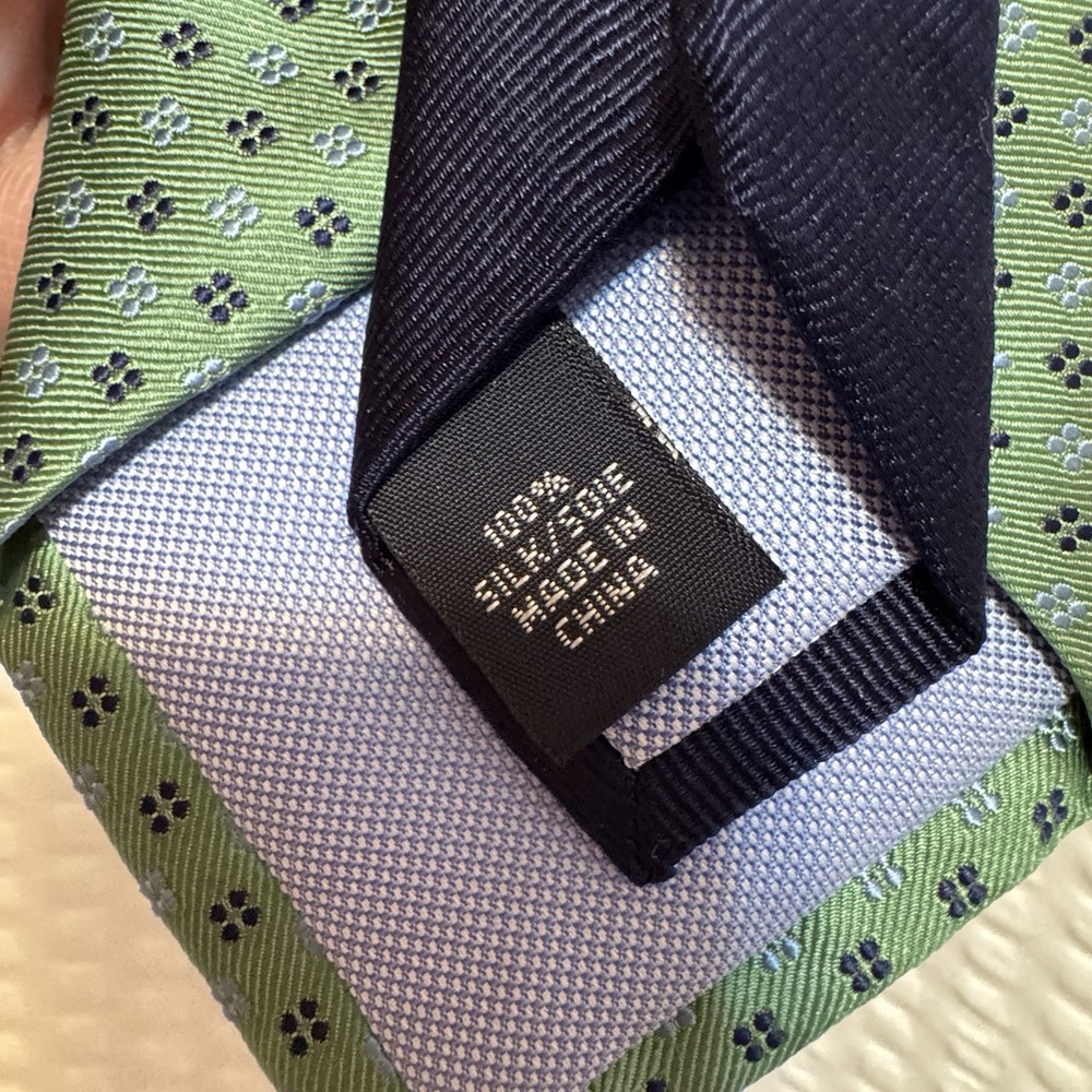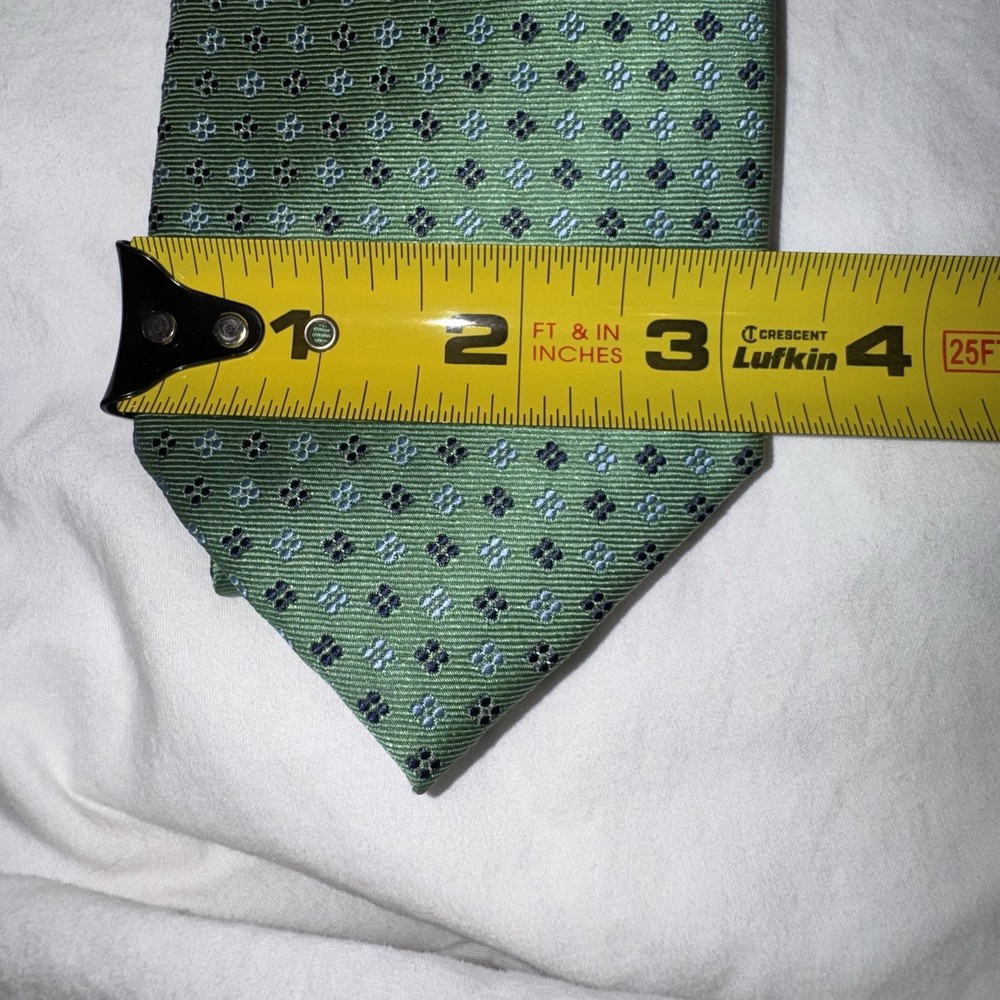 This is a Tommy Hilfiger designer tie made of 100% silk, measuring 60 inches long. It features a geometric pattern in green and navy colors, with a logo accent. This tie is a classic length and is not vintage. It is a men's accessory that was manufactured in China. T13