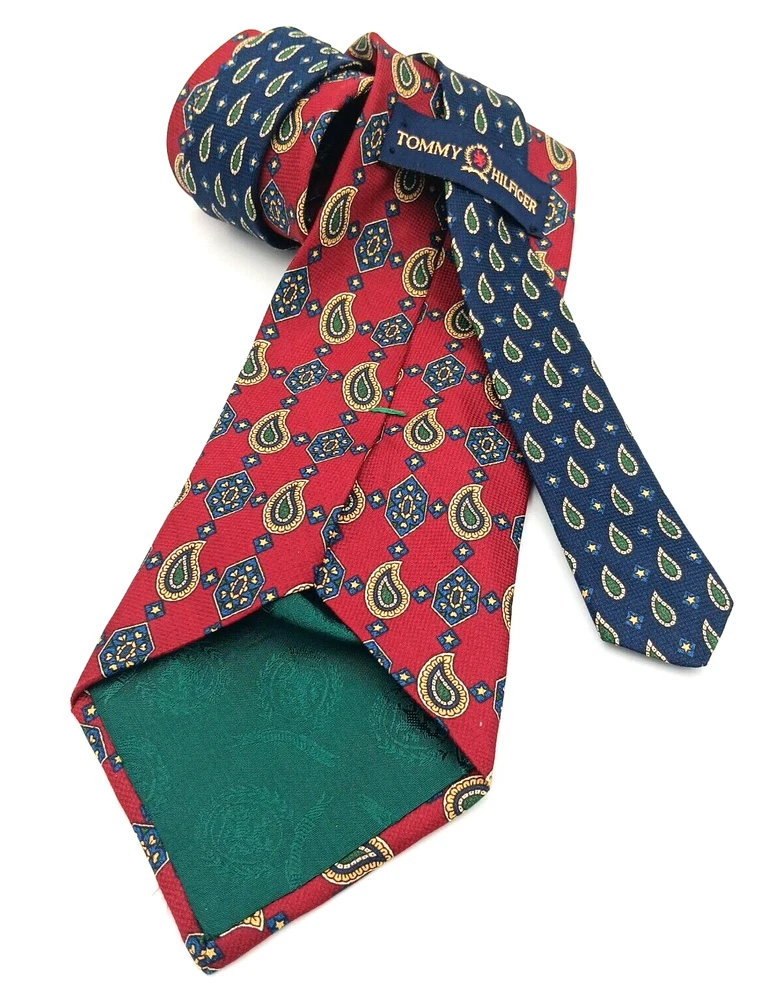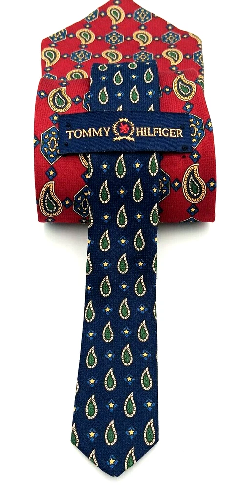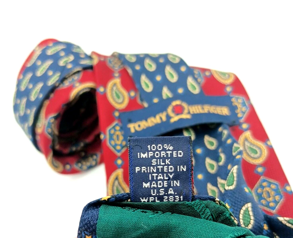 Brand = Tommy Hilfiger Color = Multicolor - Red to Blue with motifs in green, yellow, white. Fabric = 100% imported Italian Silk Pattern = Foulard - Geometric Made in United States (USA) Material = Woven Silk Length inches = 60 Width inches = 4 Notes = Unique color patterns - changes from Red to Blue along with variety of geometric shapes. Medallions paisley floral stars - a variety of patterns. Please see photographs for condition, approximate measurements, patterns and design. Kind regards, Karen Anns Attic