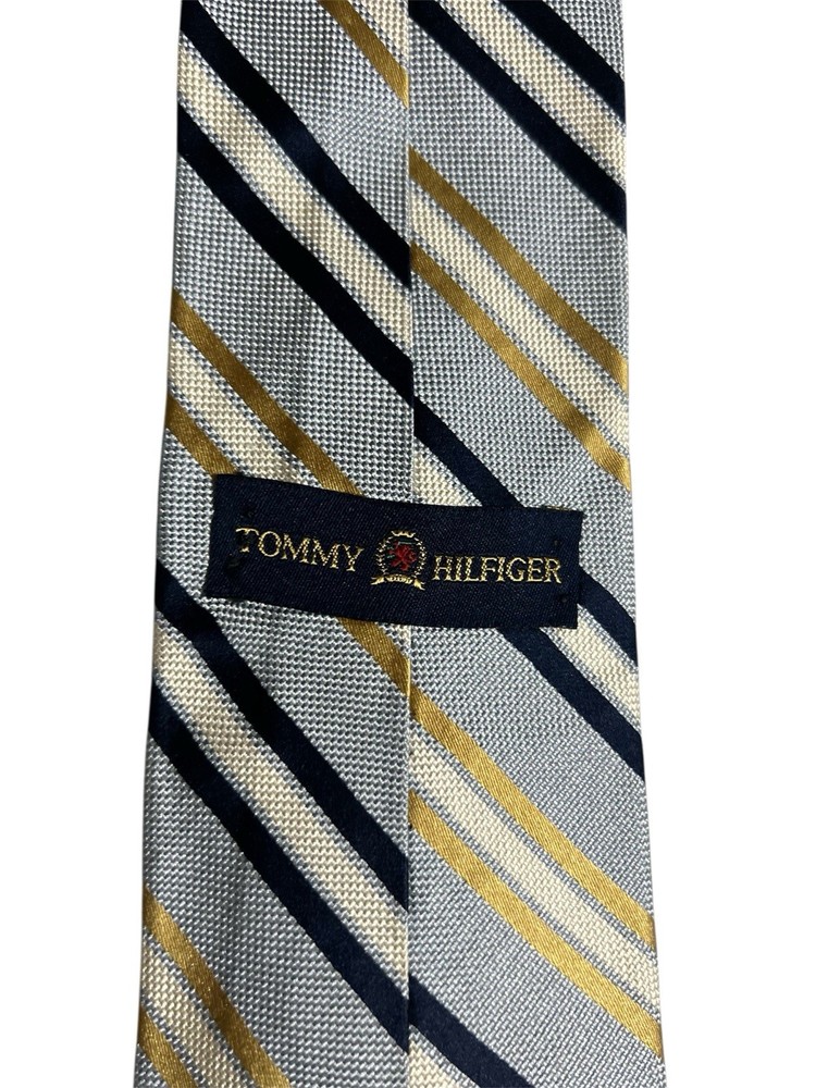 The Tommy Hilfiger Necktie is a luxurious men's accessory designed for business, in the office weddings, or formal events. Made of high-quality silk with a classic striped pattern in blue and gold, this designer tie features the iconic Tommy Hilfiger logo accent. The tie is adjustable in length, perfect for a preppy and stylish look. Made in the United States, this classic one-size tie exudes sophistication and confidence, making it a versatile and fashionable addition to any man's wardrobe.