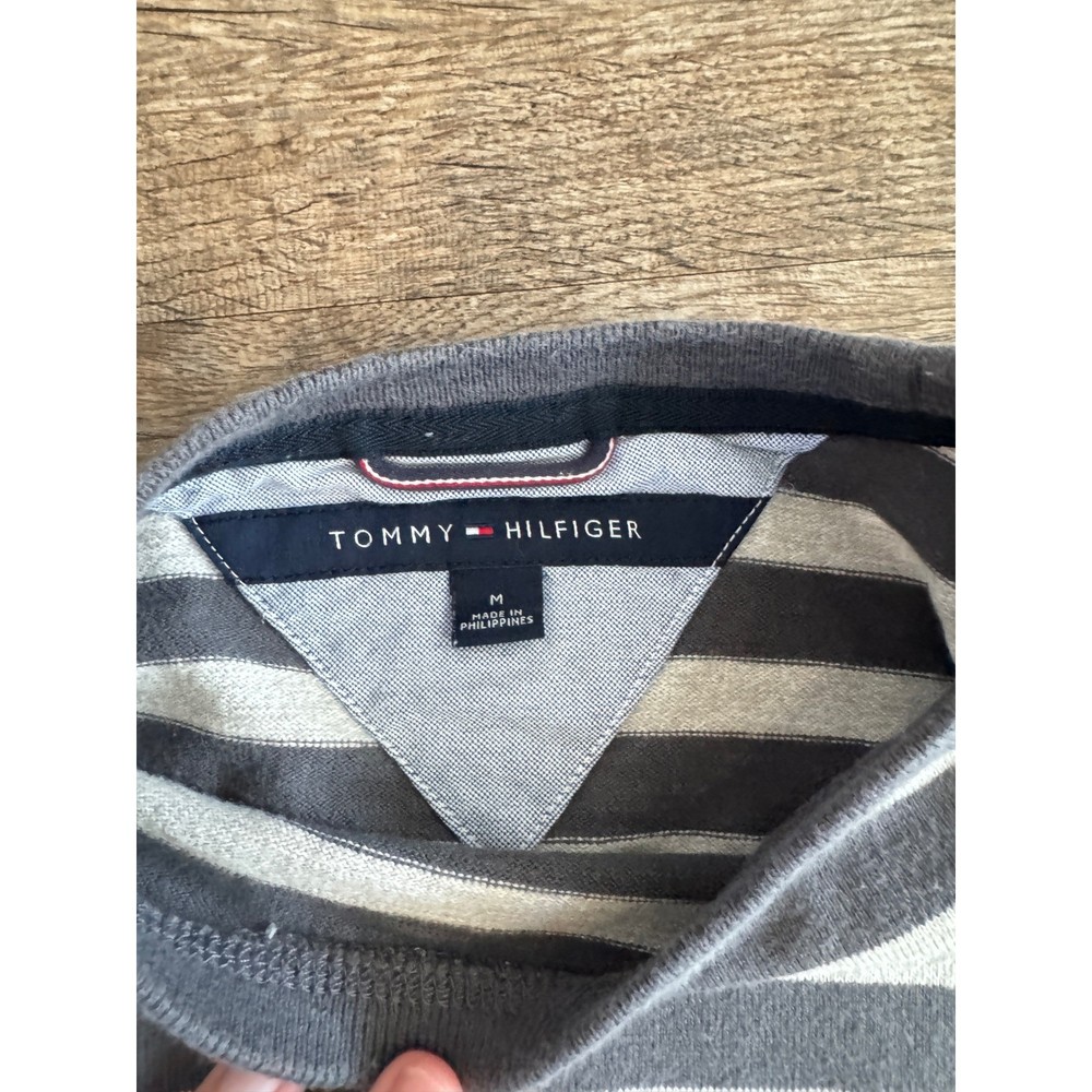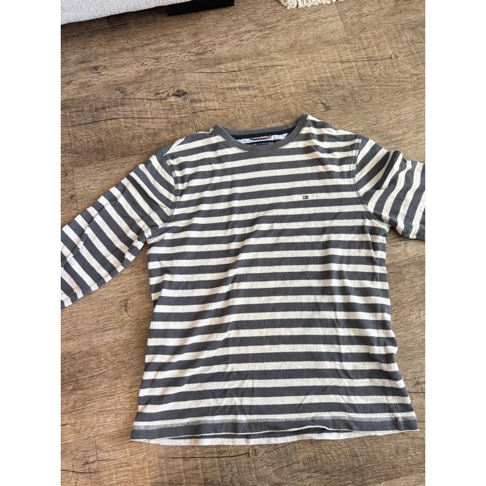 Tommy Hilfiger long sleeve t-shirt showcases a classic horizontal stripe pattern in grey and white. Crafted from a soft jersey knit, this versatile piece includes a traditional crew neckline and the iconic flag logo embroidered on the chest. Ribbed cuffs provide a secure fit, making it an ideal choice for layering or wearing on its own for a clean, preppy aesthetic.Bever wear only wash once