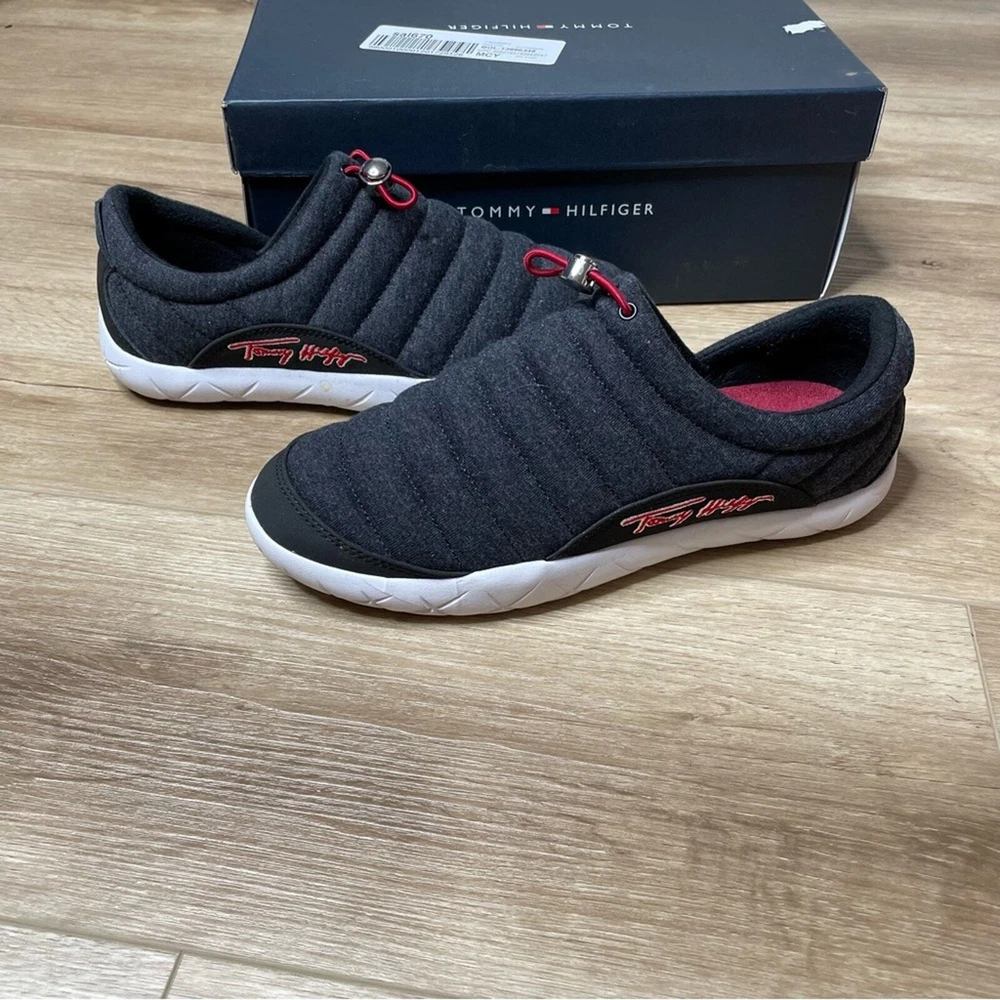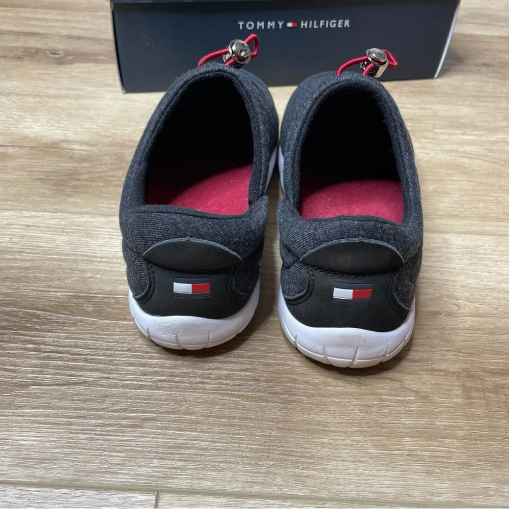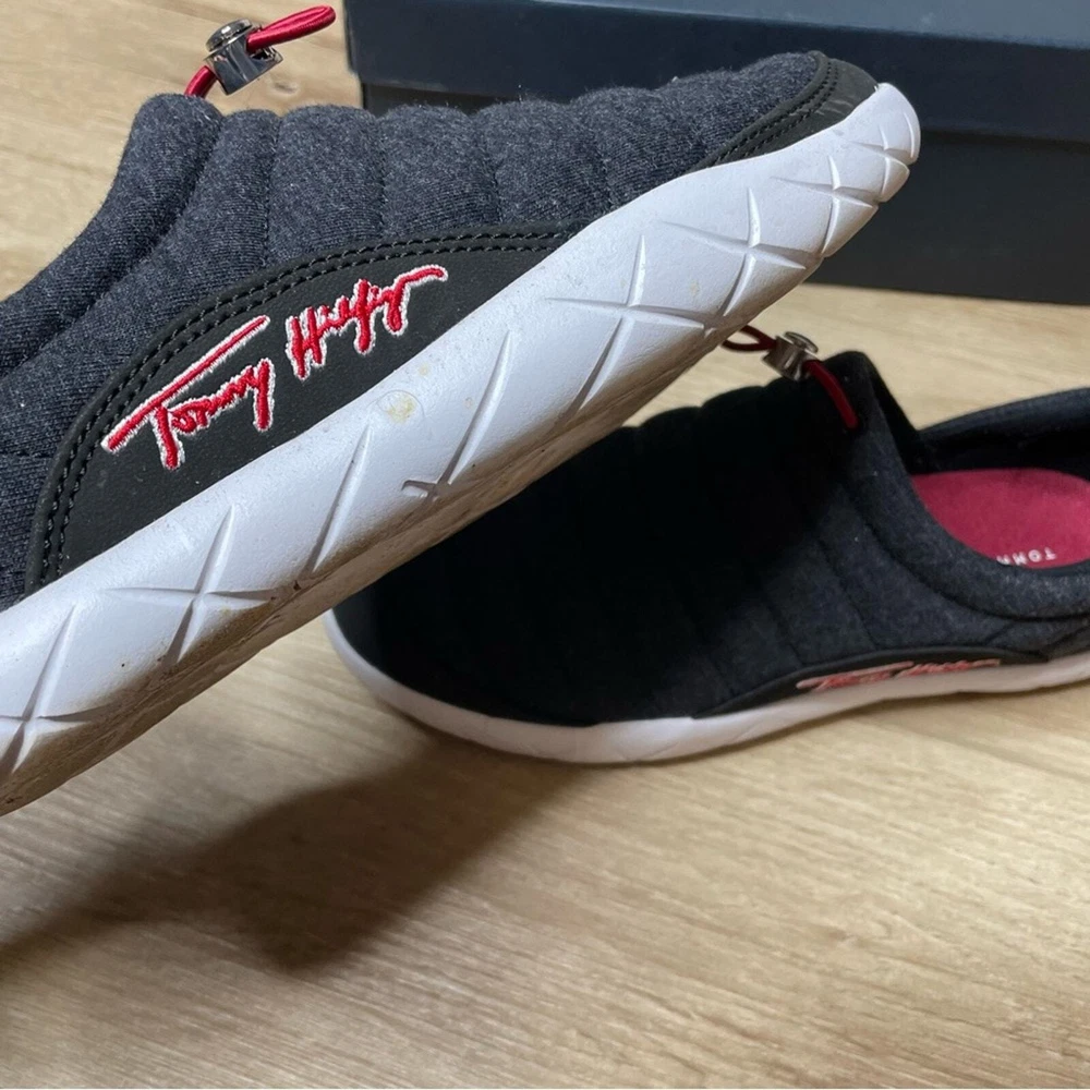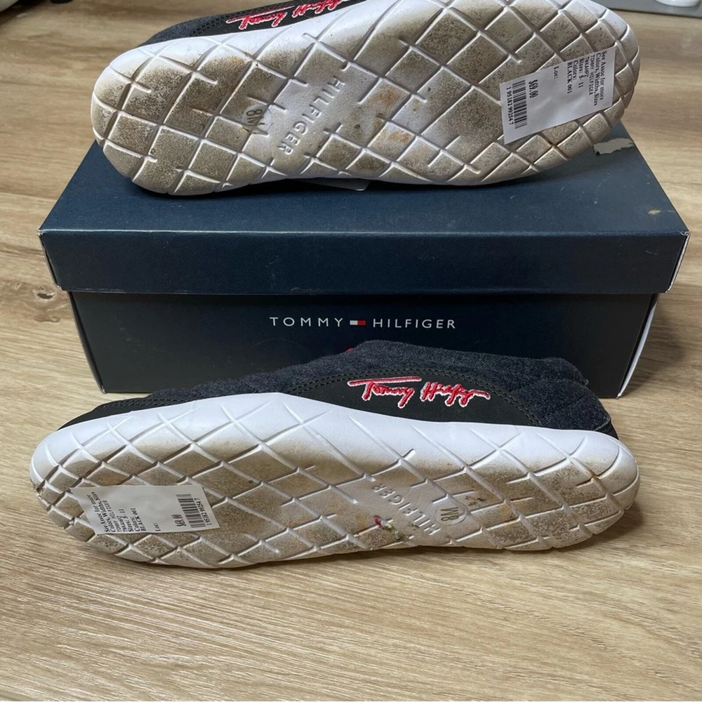 Gently used and in good condition Tommy Hilfiger Kampz Slipper Shoes Color: Black Removable insole Fleece, insulated upper Textile & synthetic upper Textile lining & insole Synthetic outsole Size 8