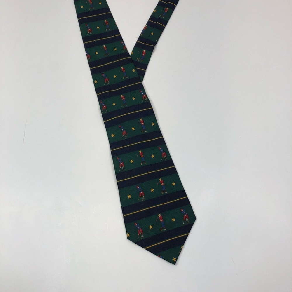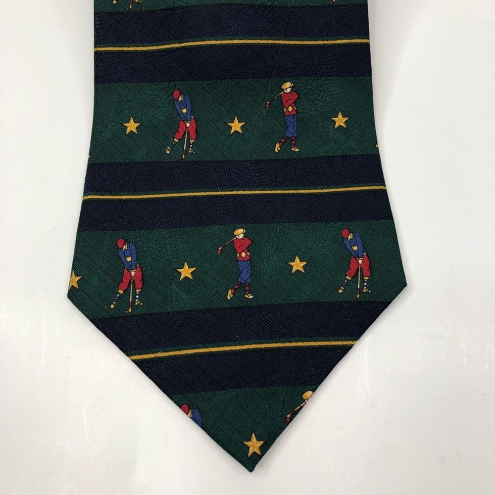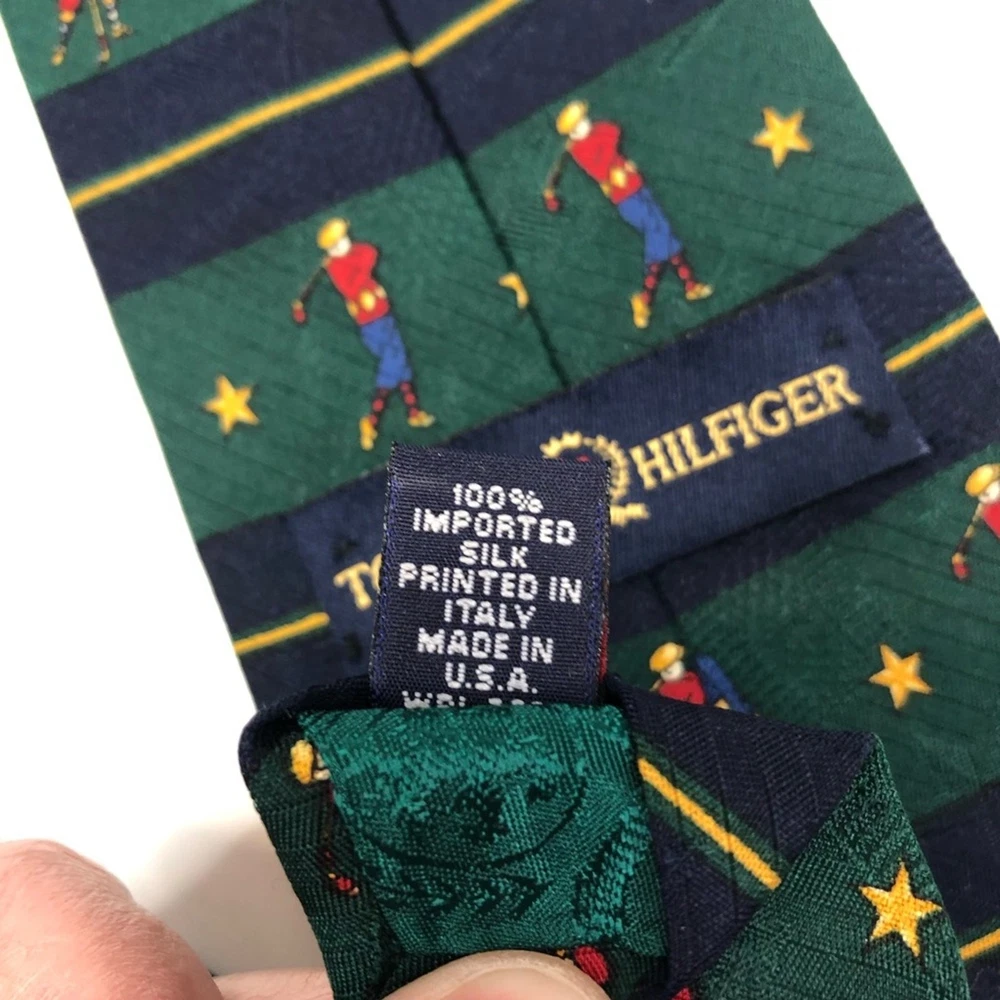 Green and blue striped necktie from Tommy Hilfiger. Designed with golfers and stars. 100% silk. Approximately 4" across at widest point and 57.5" long Golf, Preppy, Sport, Gift, Dad, Father's Day, Christmas, Vacation, Special Occasion