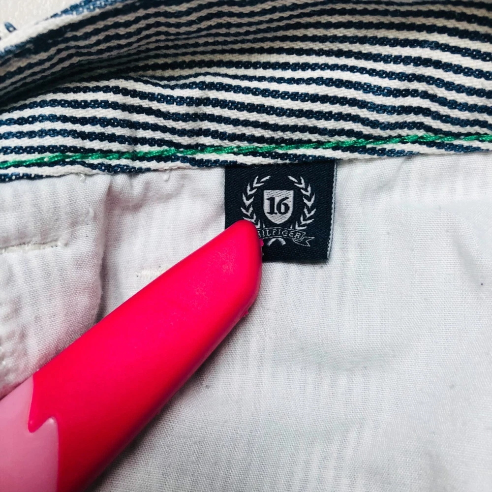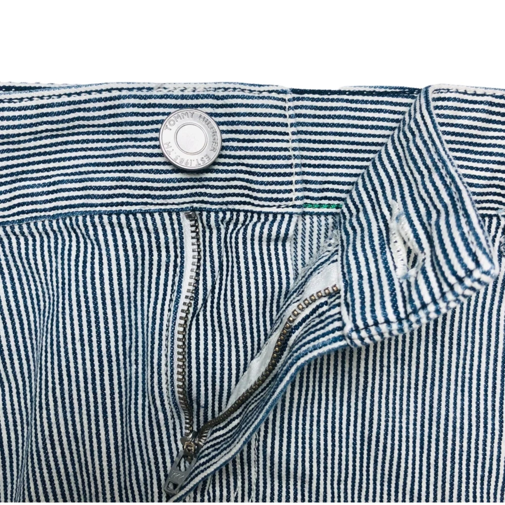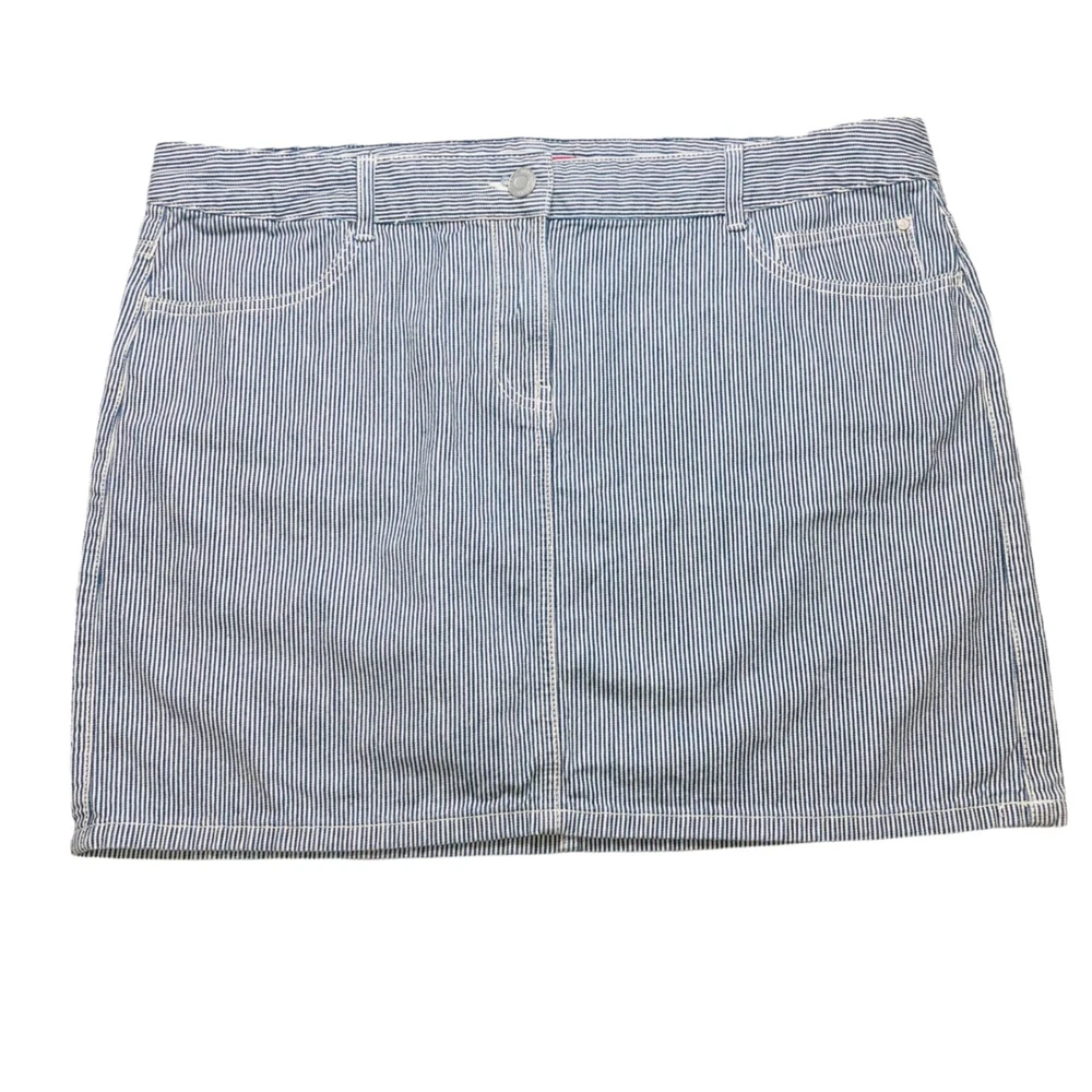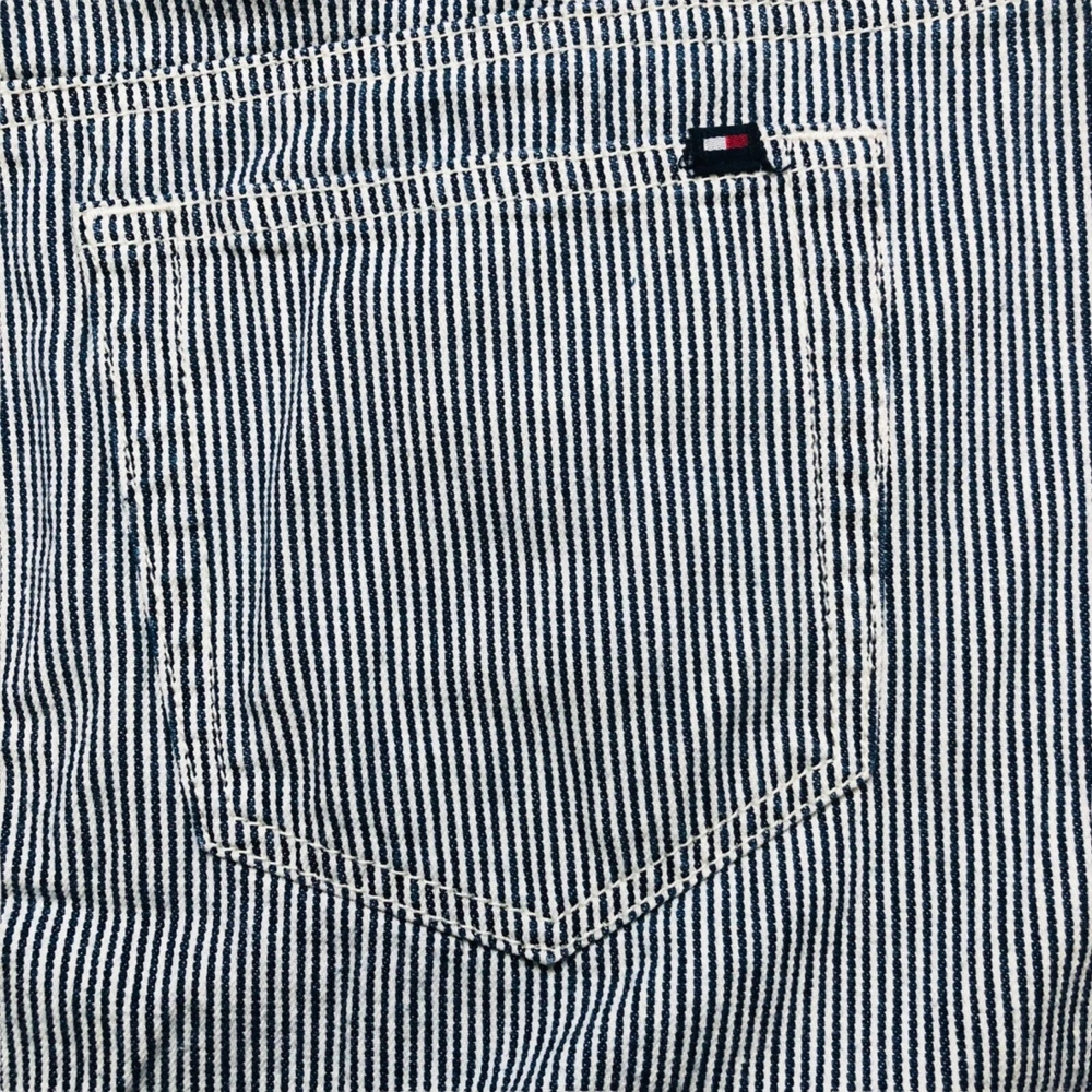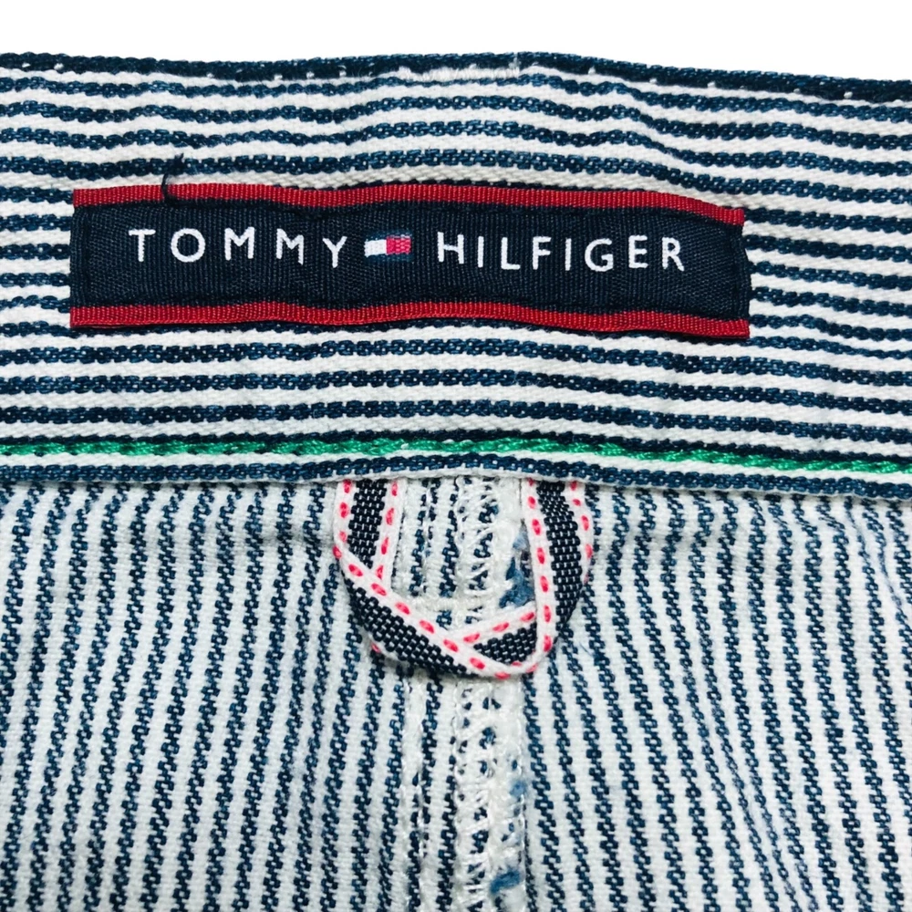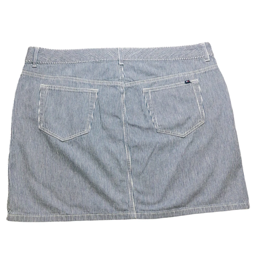 Tommy Hilfilger blue pinstripe denim mini skirt Features: mini skirt, zipper and button closure, belt loop, five functional pockets, plus size Condition: Very good pre-owned condition. No rips, holes, or stains. Size: Women Size 16 Measurements Waist: 19” Length: 16.5” Please see photos. Measurements are approximate and taken while garment is laid flat. To ensure a good fitting, compare these measurements to a garment you currently own. Style profile: summer, casual, nautical, Fourth of July, BBQ, movies, school, college, preppy, mall, Y2K